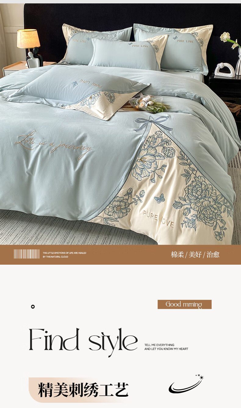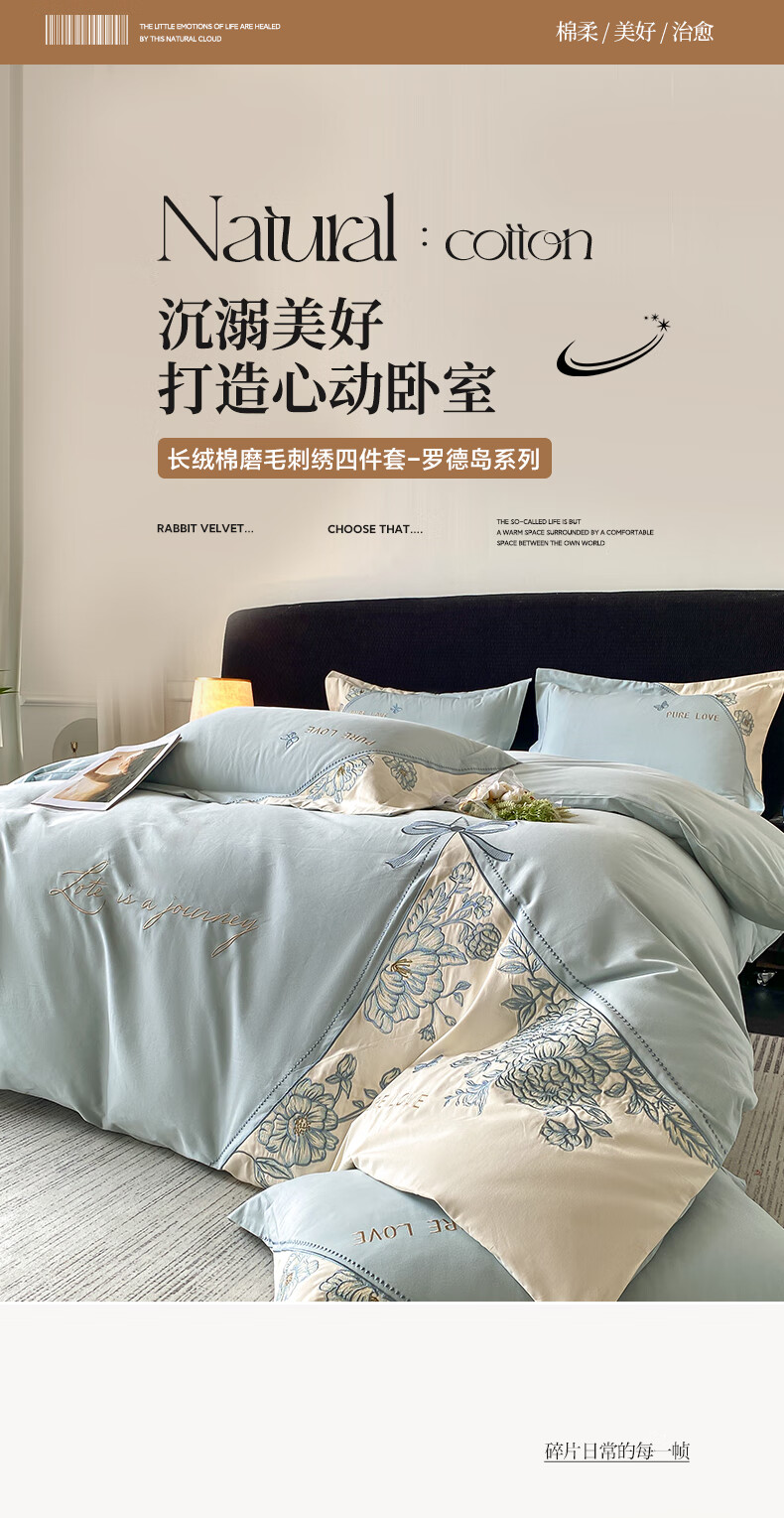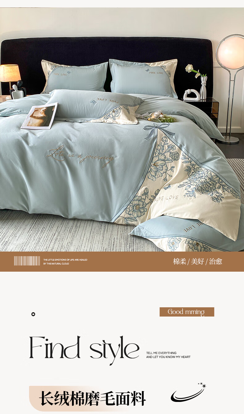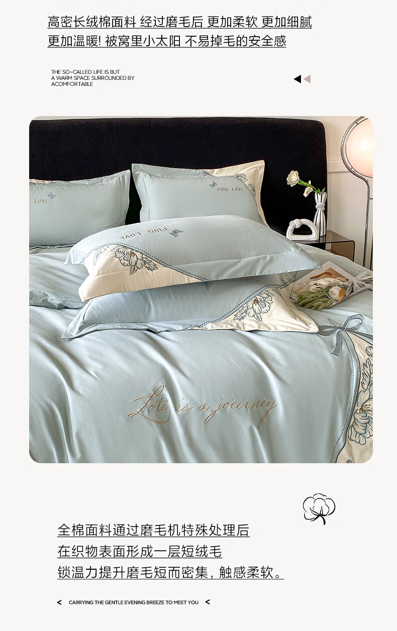 新中式绣花工艺款四件套,典雅大方精选长绒棉磨毛面料;高密长绒棉面料 经过磨毛后 更加柔软;更加细腻更加温暖! 被窝里小太阳 不易掉毛的安全感