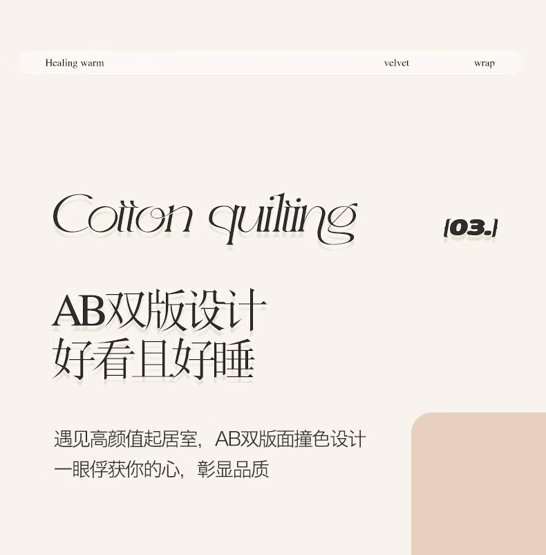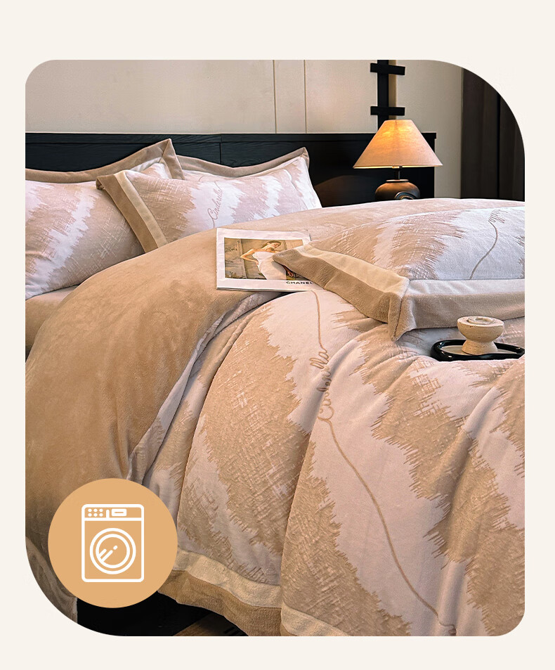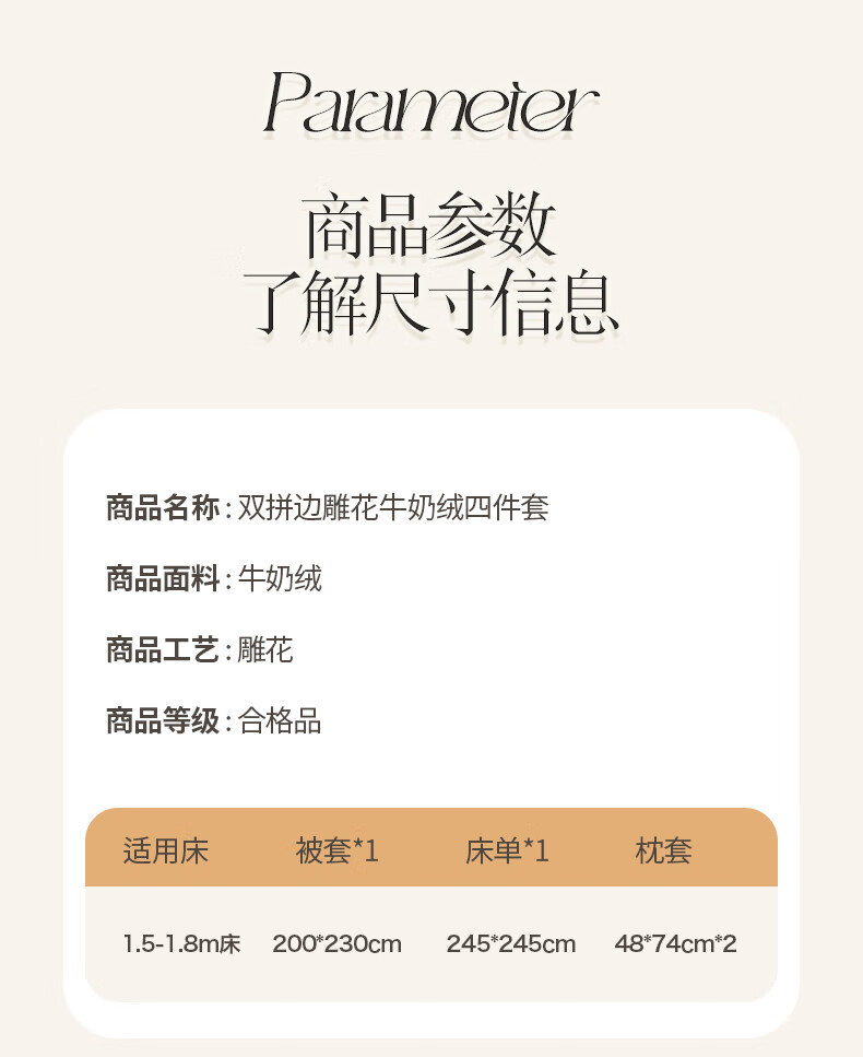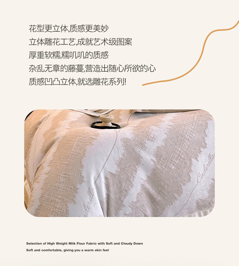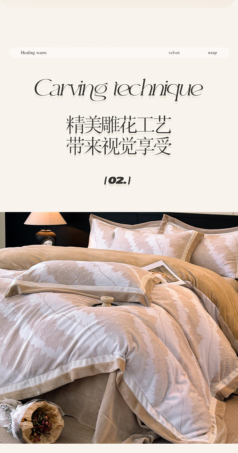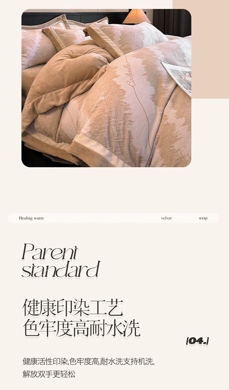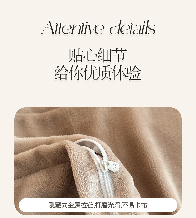 套件采用高克重全消光牛花绒面料;24H保暖呵护整夜温暖,柔软细腻,贴肤保暖;面料植入导电丝,免去静电烦恼,温暖整个冬季