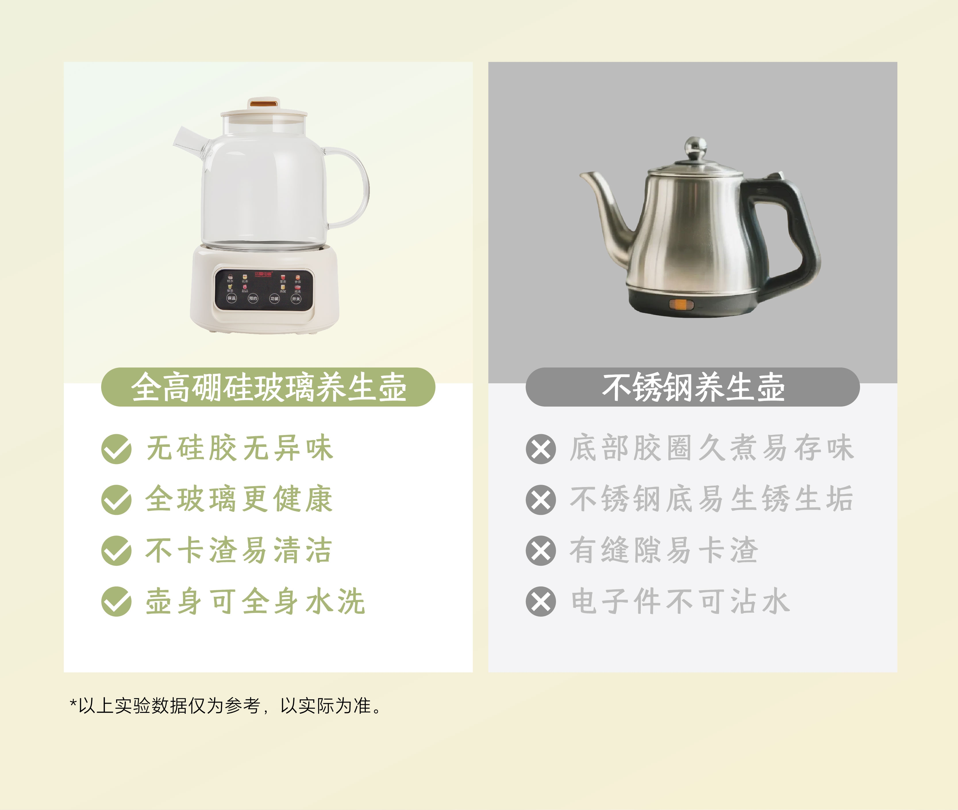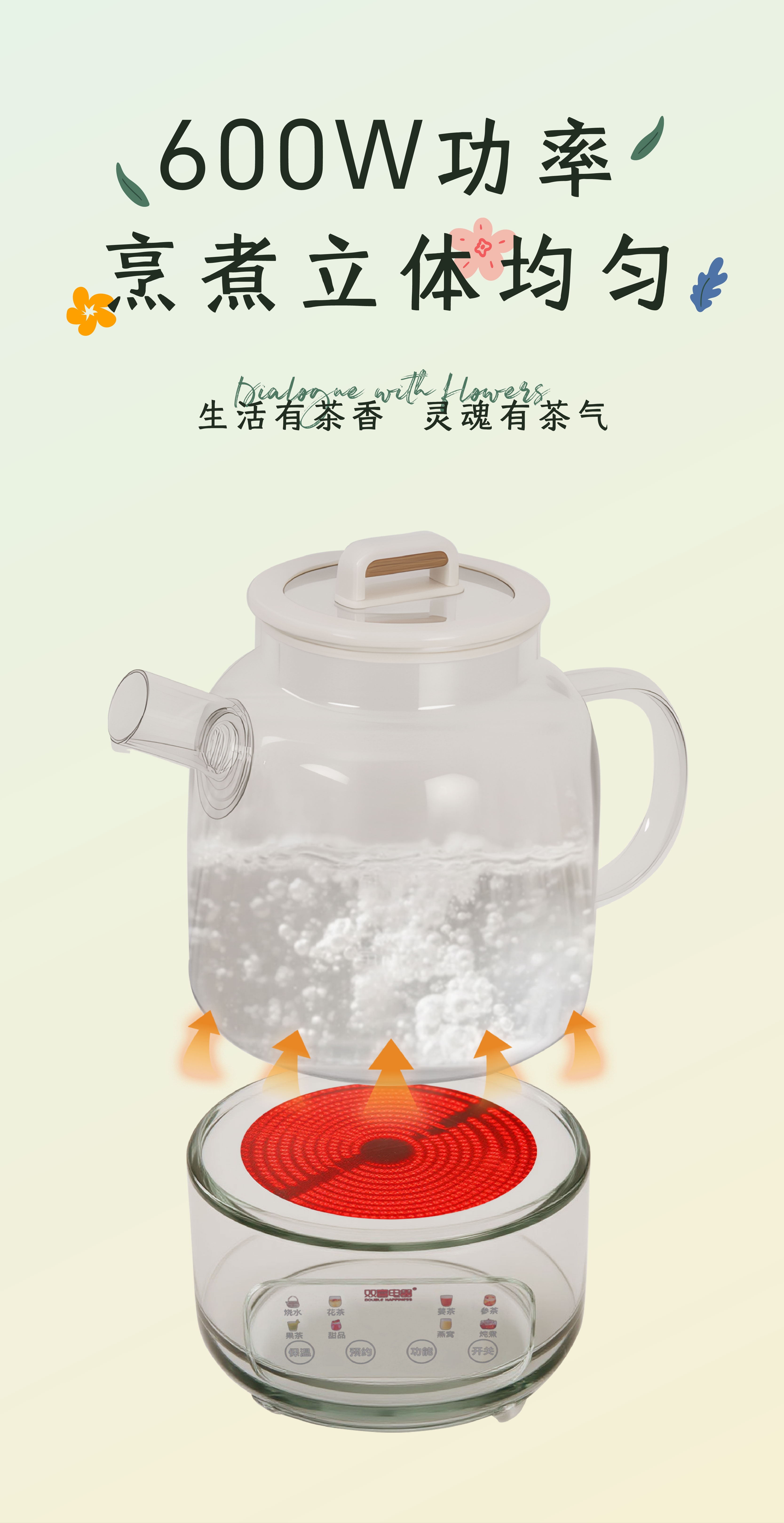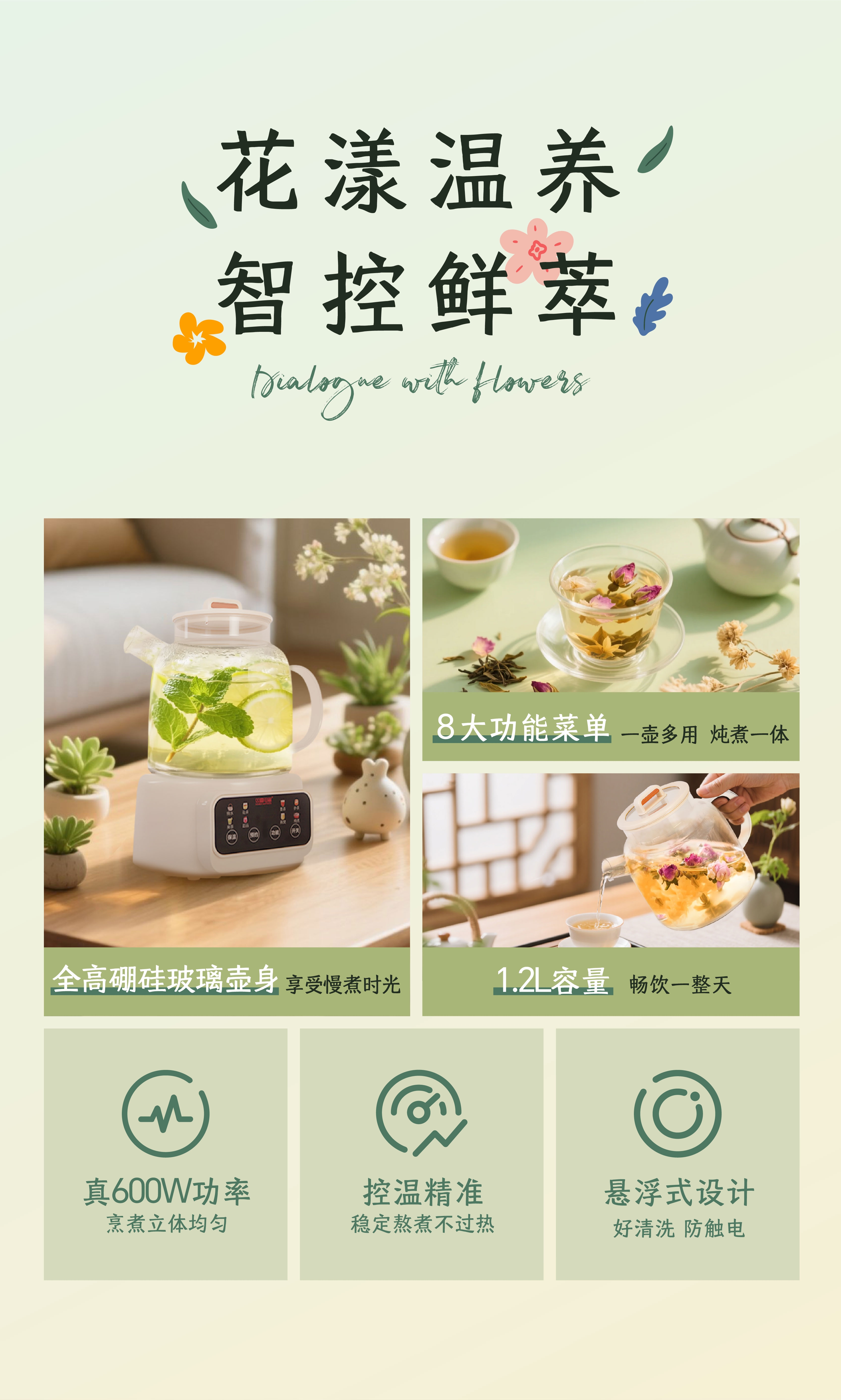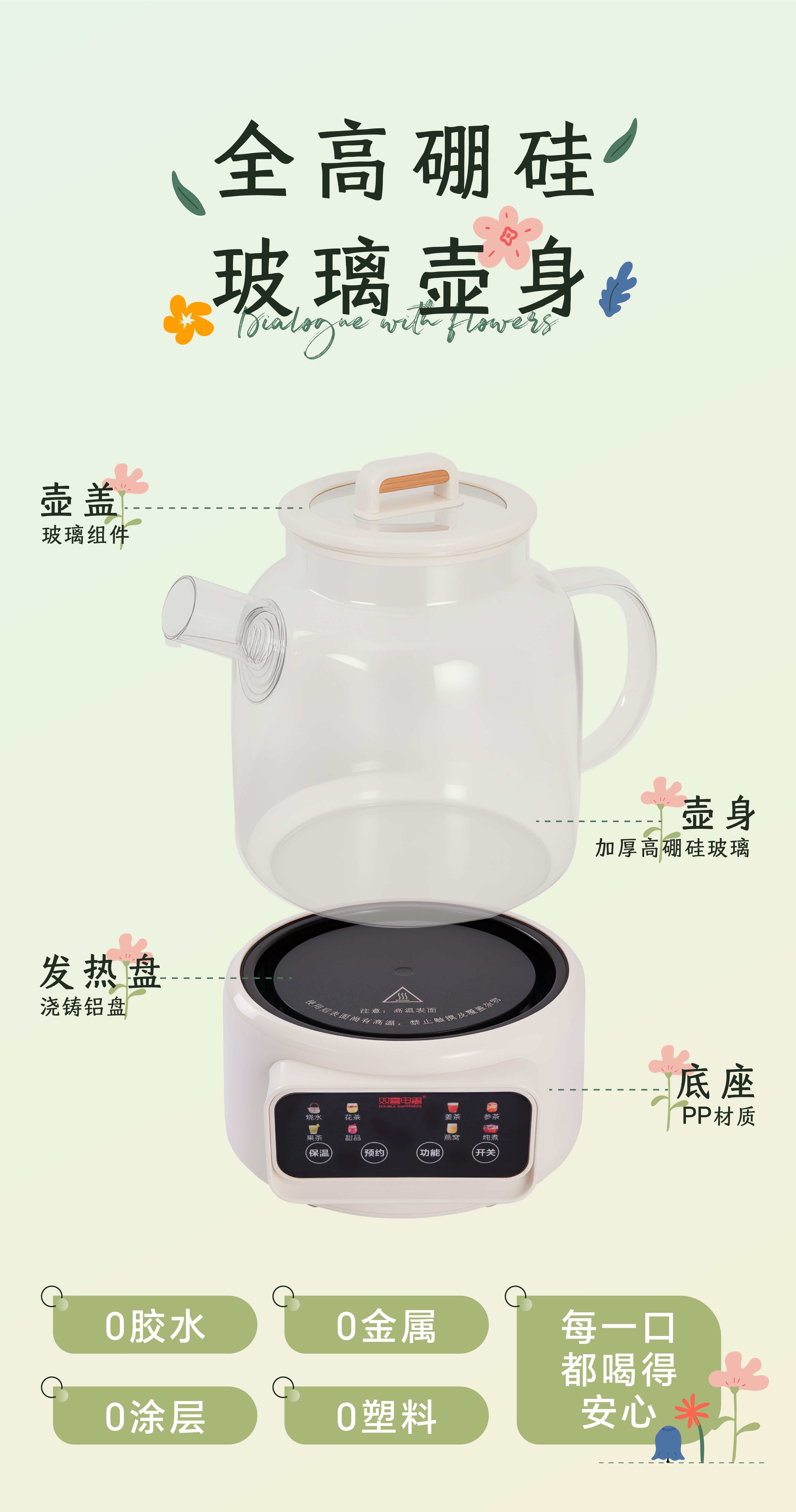 全高硼硅玻璃壶身,0胶水0金属0涂层0塑料,每一口;8大功能菜单,一壶多用,炖煮一体;控温精准,稳定熬煮不过热;1.2L容量,畅饮一整天;柔音炖煮不吵闹,轻养味蕾也治愈情绪