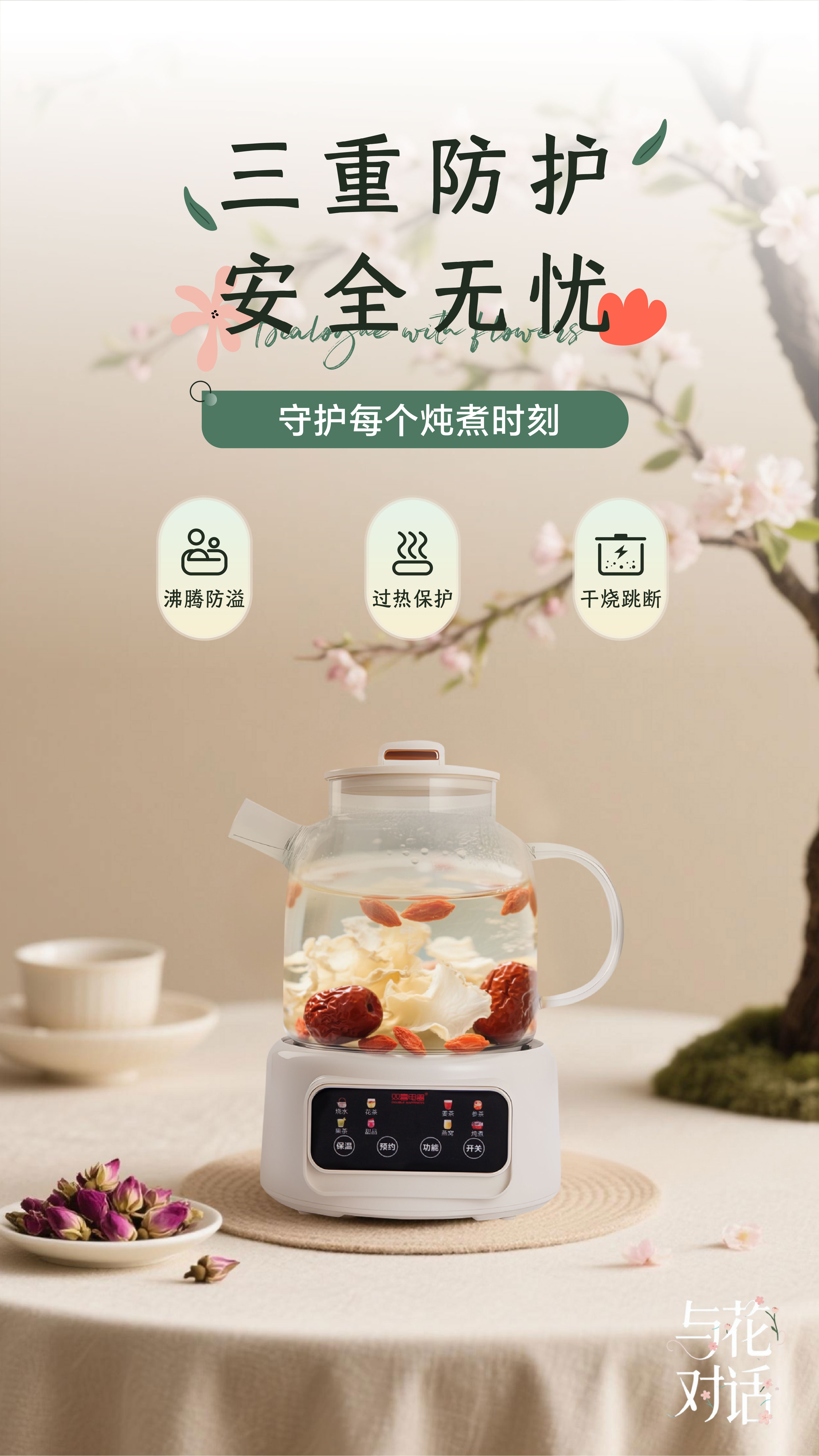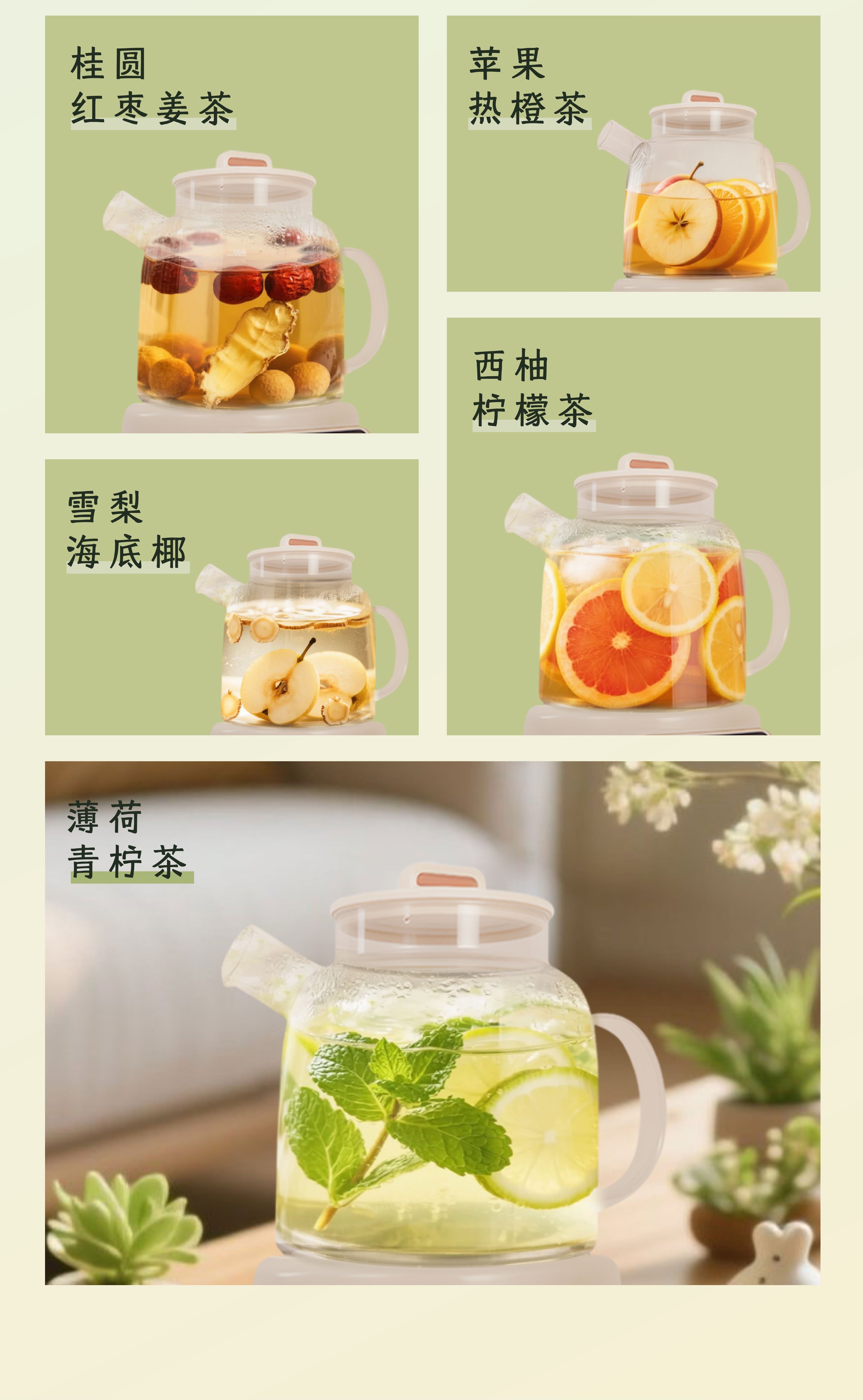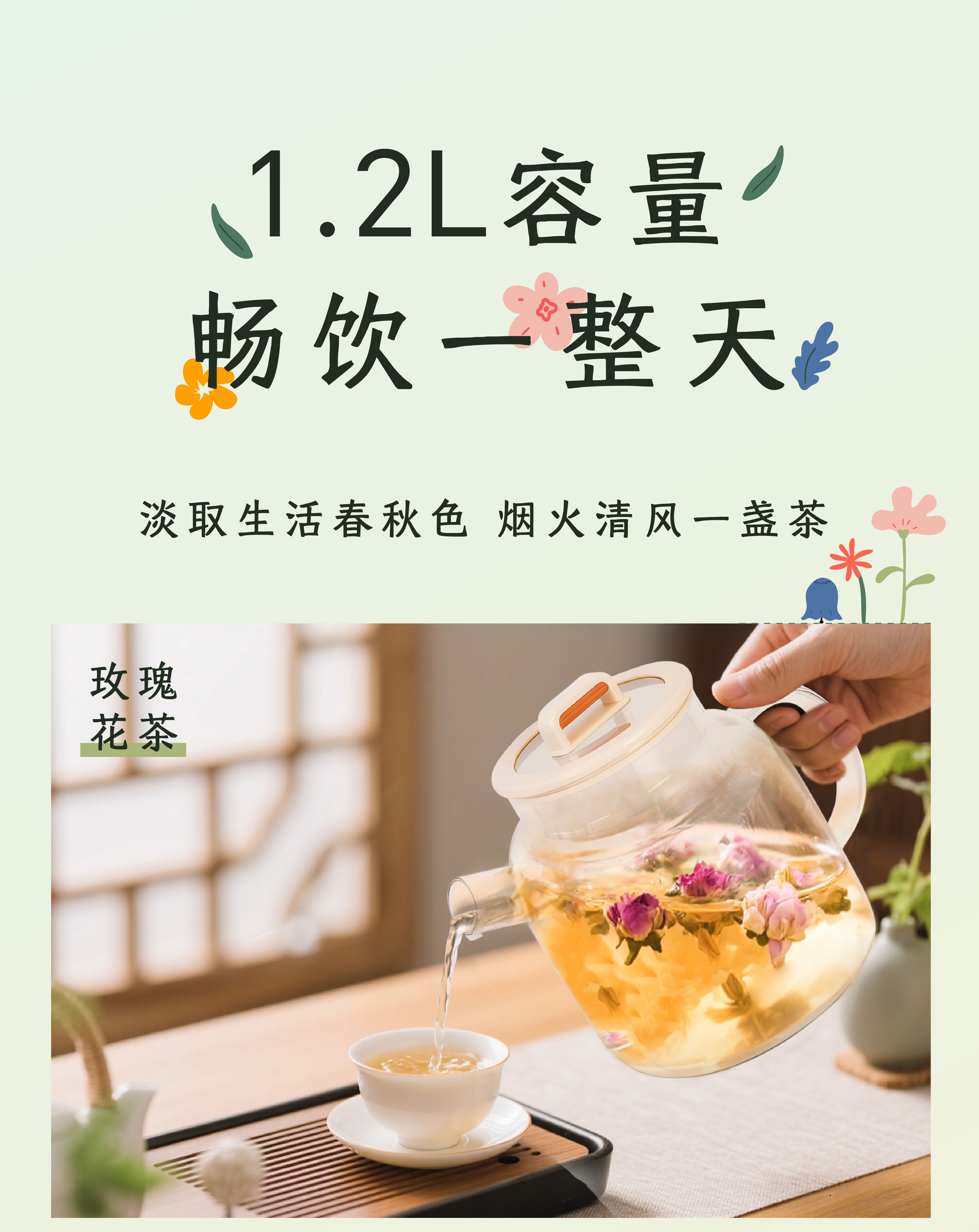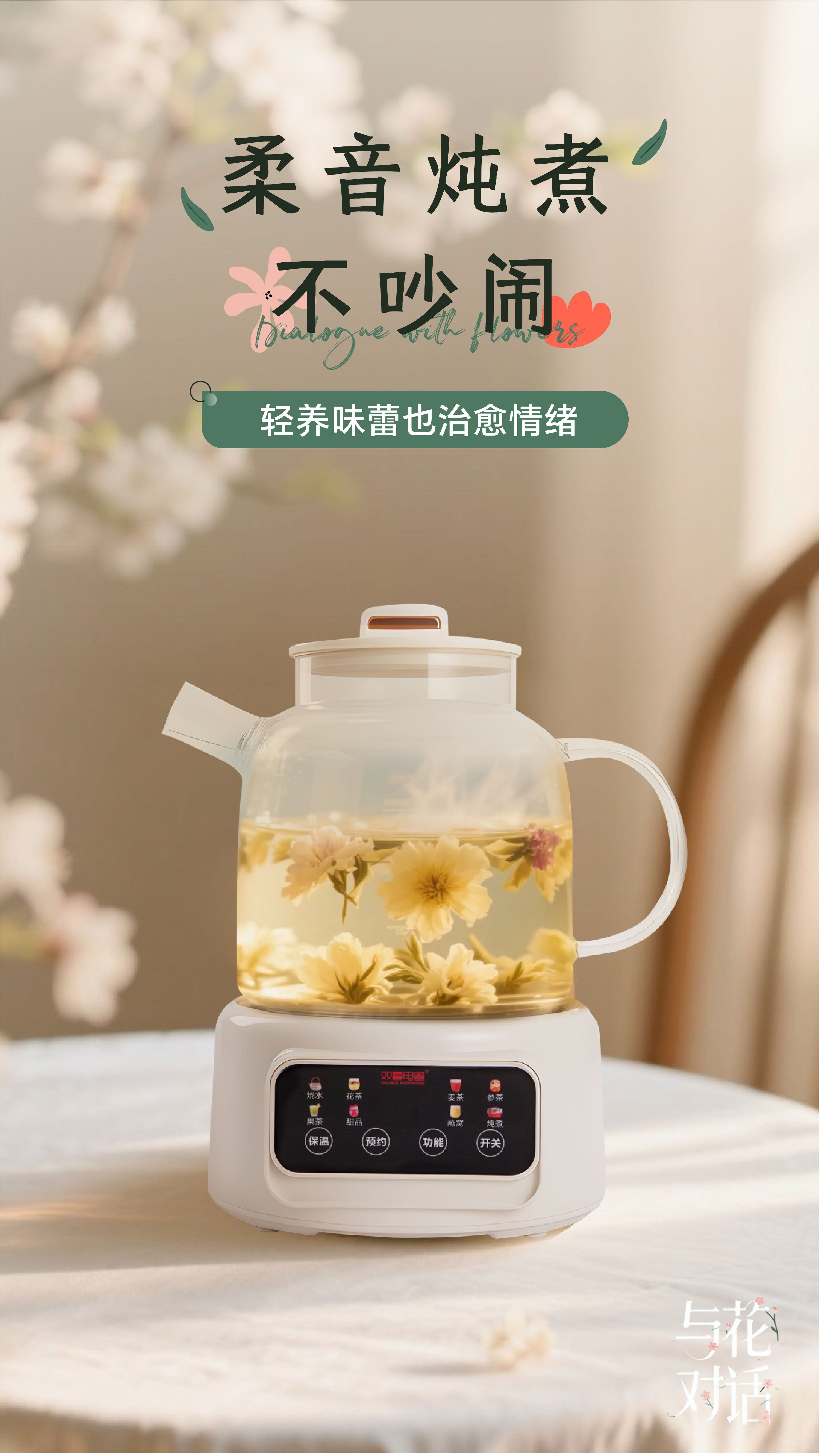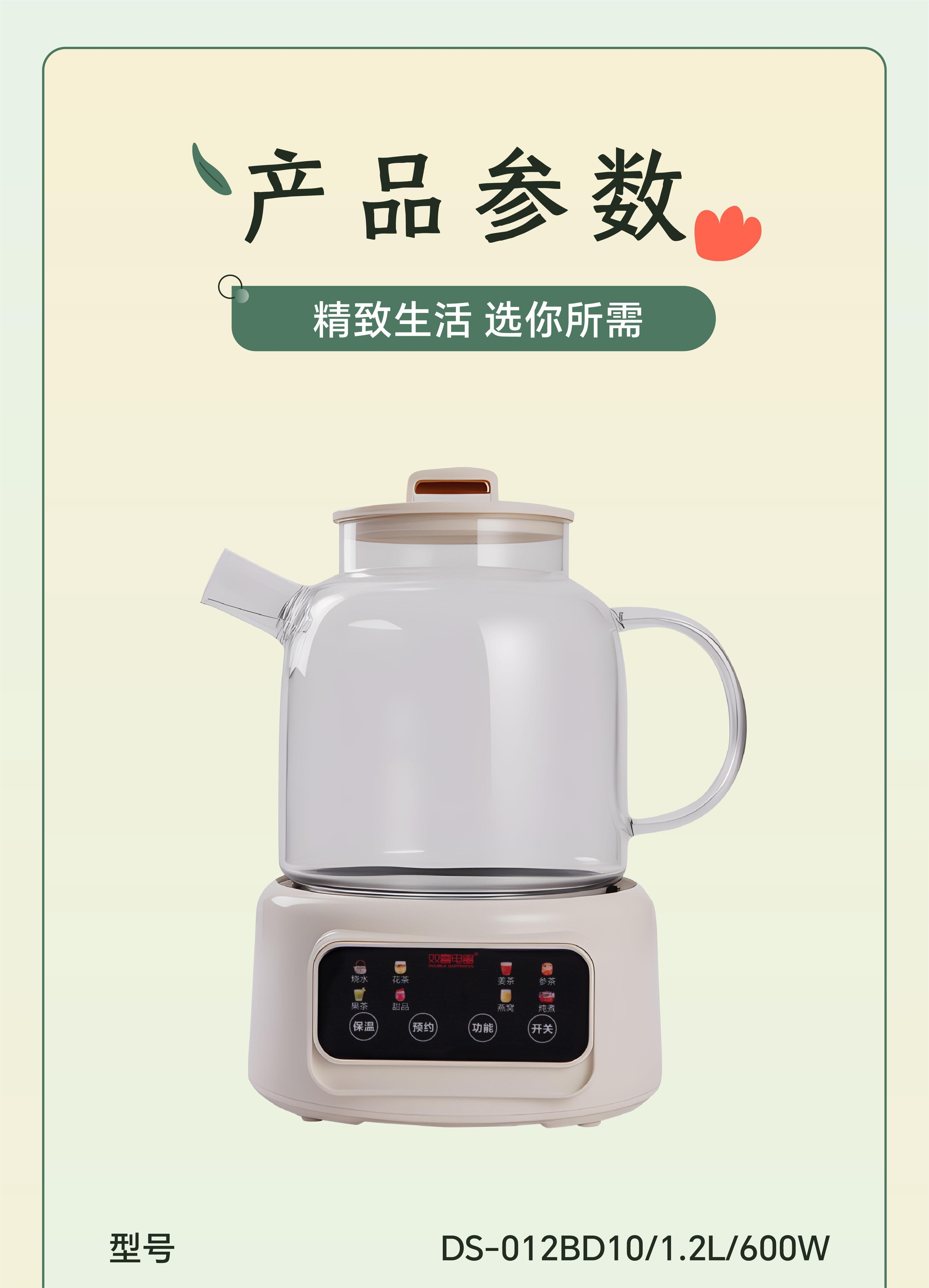 全高硼硅玻璃壶身,0胶水0金属0涂层0塑料,每一口;8大功能菜单,一壶多用,炖煮一体;控温精准,稳定熬煮不过热;1.2L容量,畅饮一整天;柔音炖煮不吵闹,轻养味蕾也治愈情绪