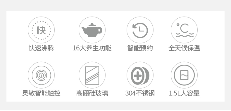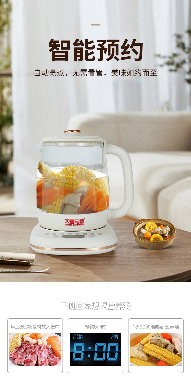 精选304不锈钢与高硼硅玻璃,健康炖煮更放心;八大功能,丰富饮品,每日尝鲜;1000W大功率,快速炖煮,充分释放食材香味与营养;1.5L大容量,续杯不断,整日畅享;智能预约,提前备料,到点即享