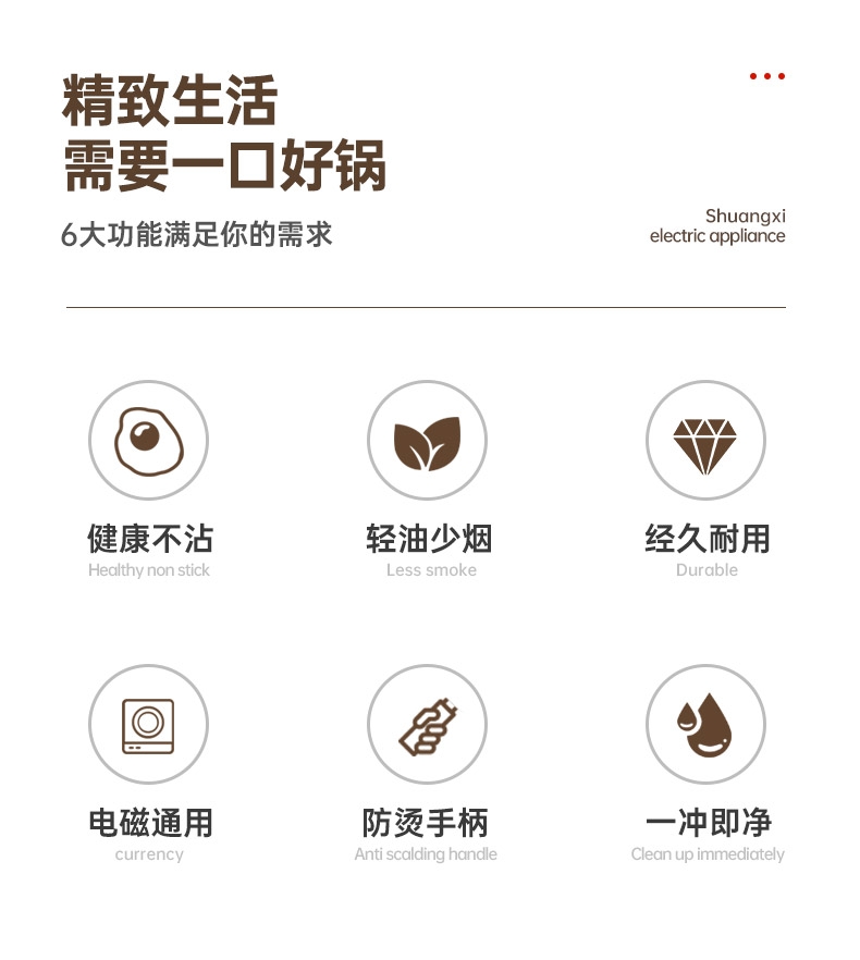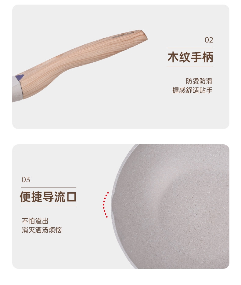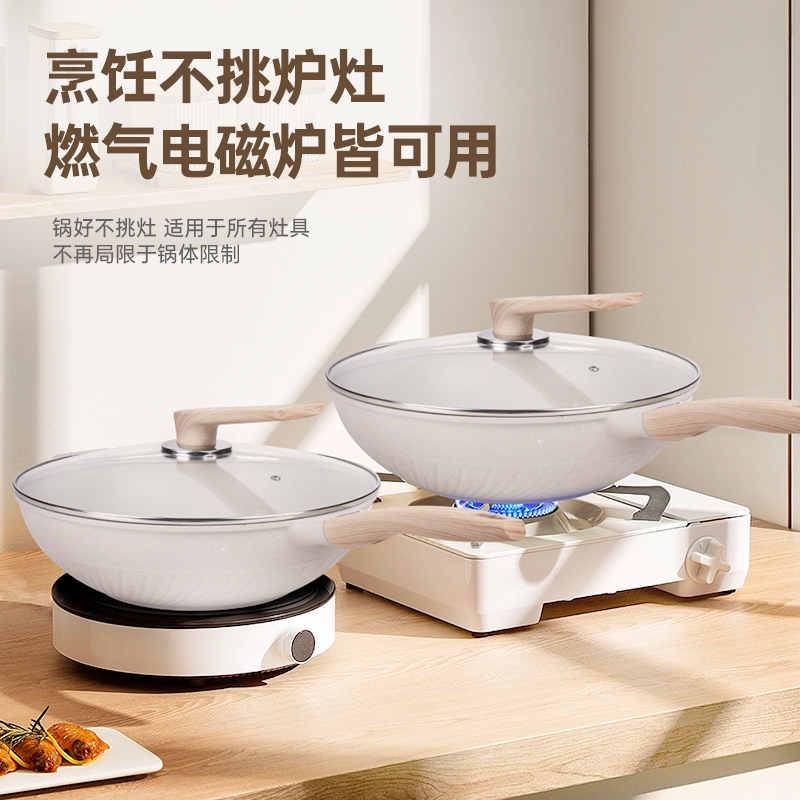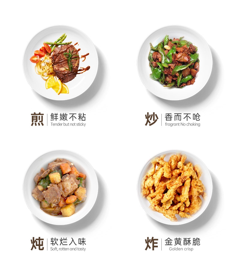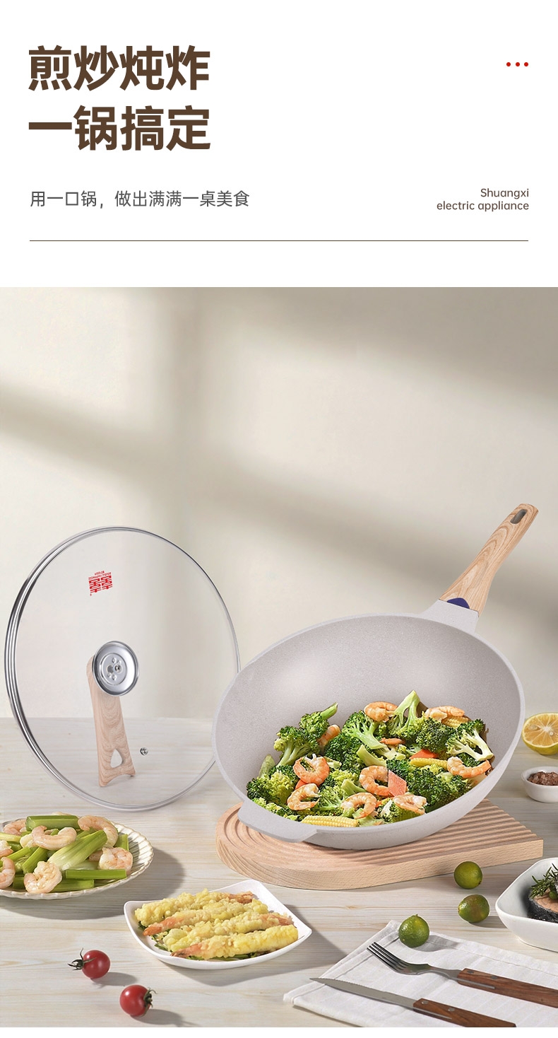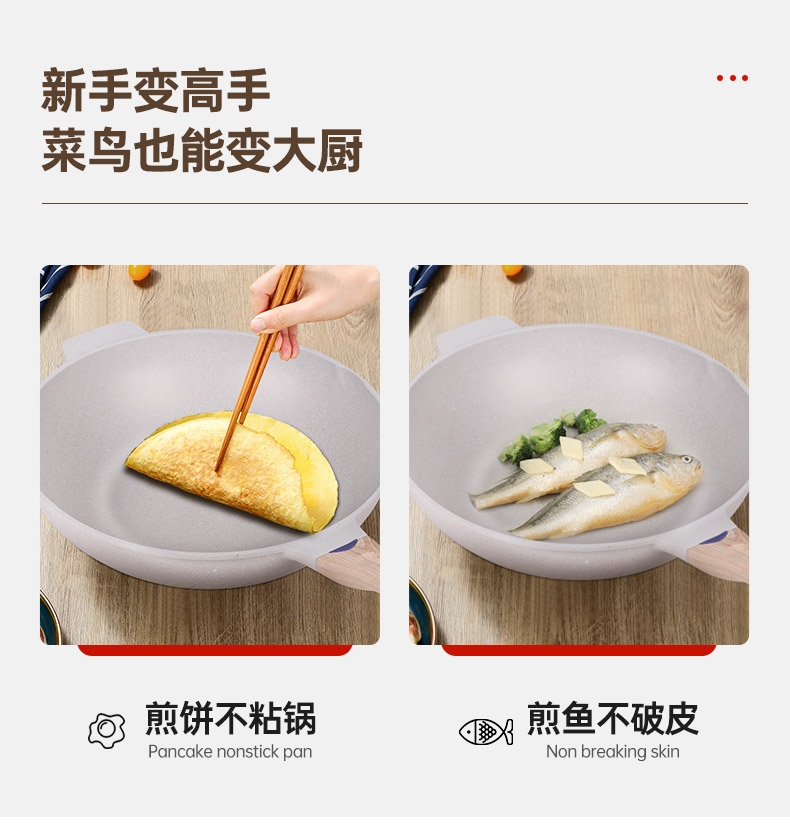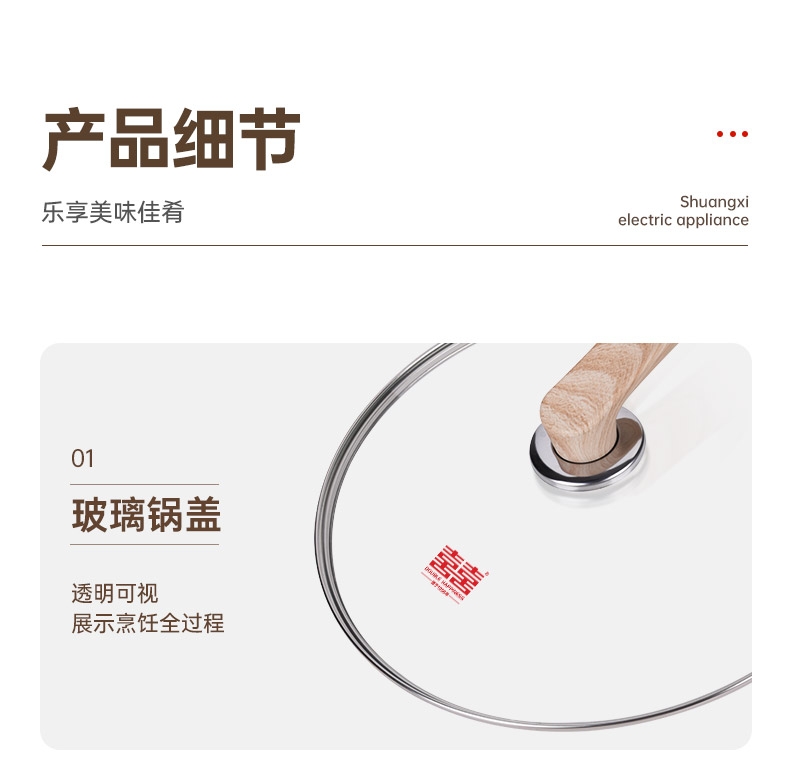 麦饭石仿荷叶不粘工艺,易于打理;一体压铸成型,不藏污垢;配可视钢化玻璃盖,美味看得见;底厚壁薄,导热迅速,均匀受热;复合底设计,不挑灶具