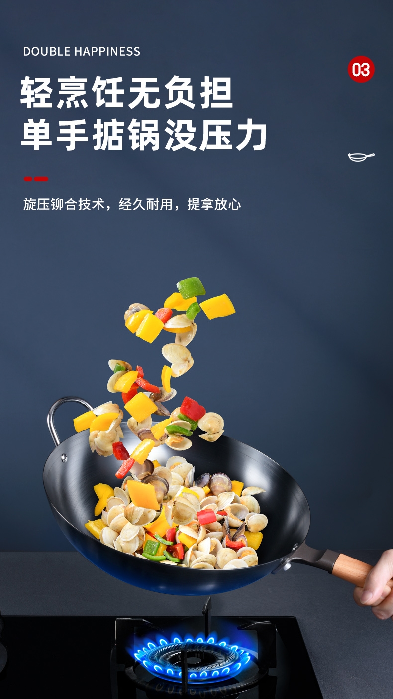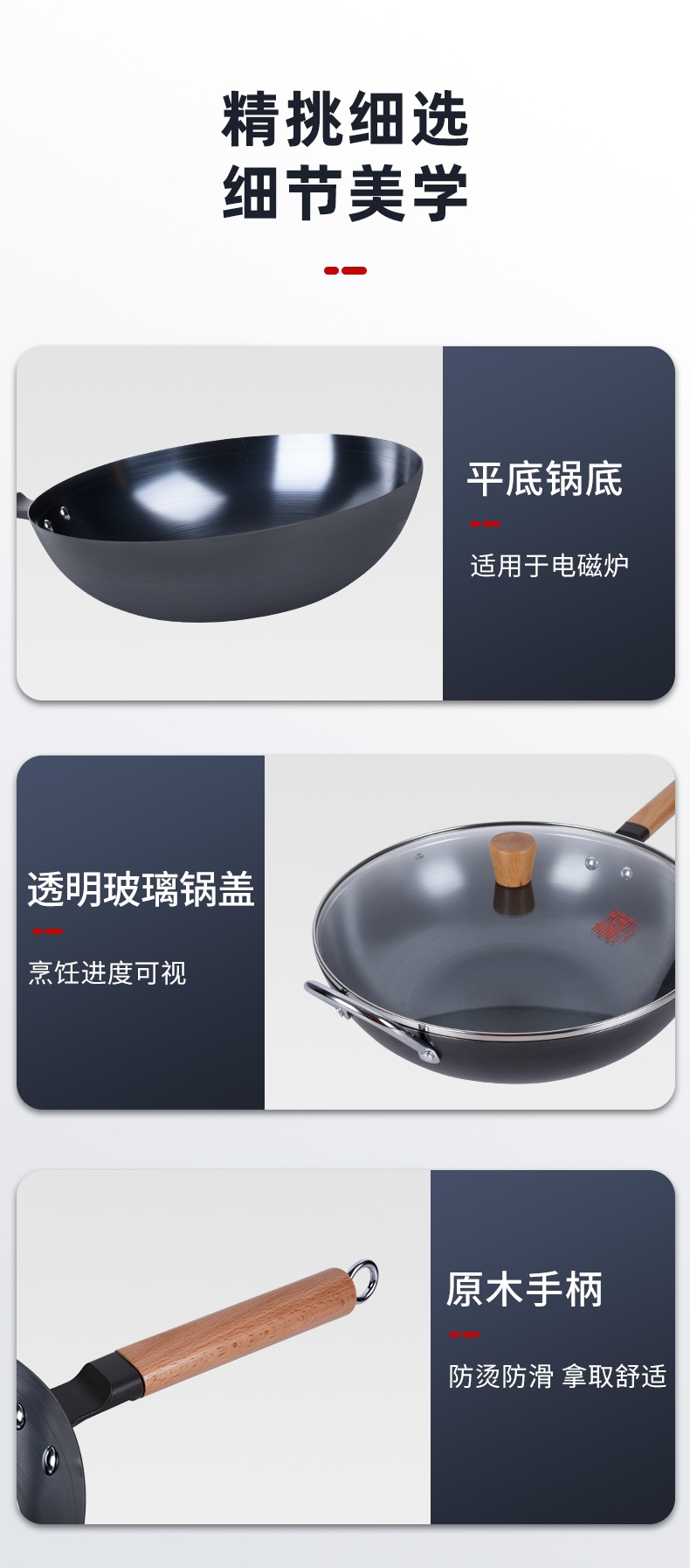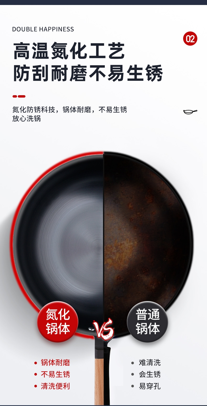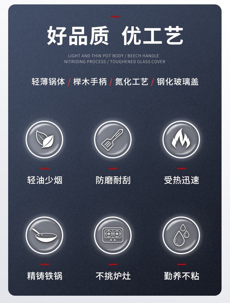 轻薄锅体技术,导热迅速;榉木手柄耐高温,隔热防烫;旋压铆合技术,经久耐用,提拿放心;采用氮化工艺,防刮耐磨,不易生锈,适用于各种灶具;配可视钢化玻璃盖