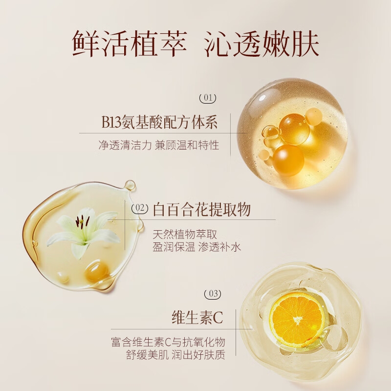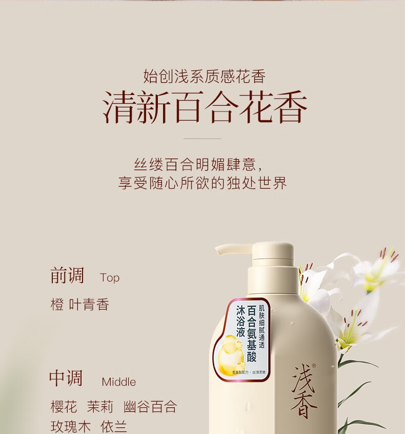 超值家庭装:大容量,高性价比;卓越成分:氨基酸表活,温和亲肤;清雅香氛:浅香百合,打造纯净体香