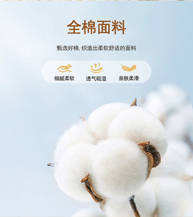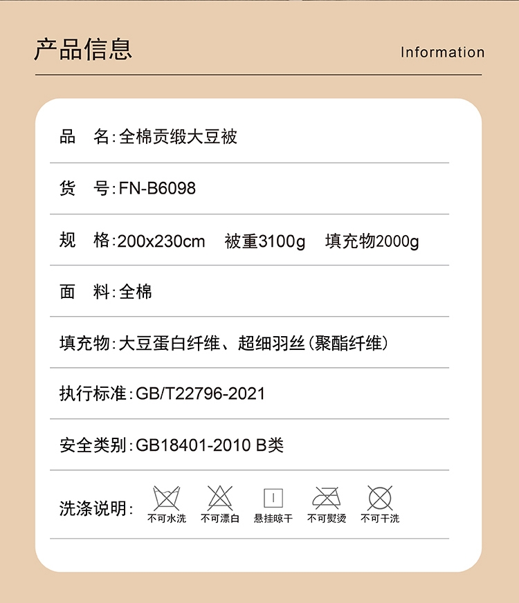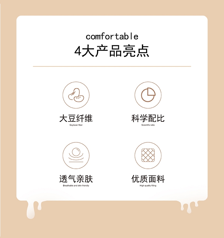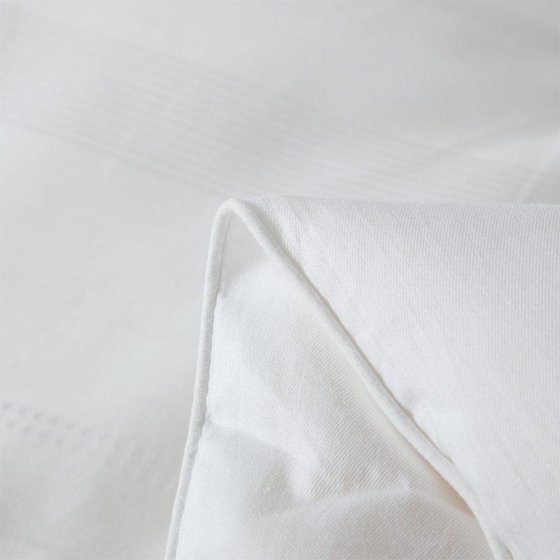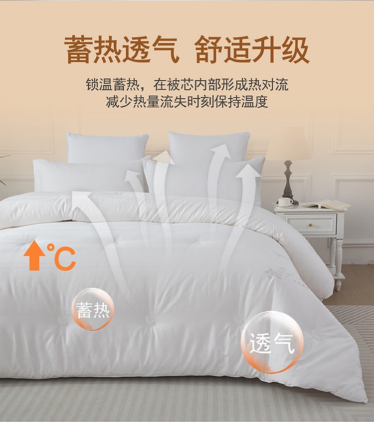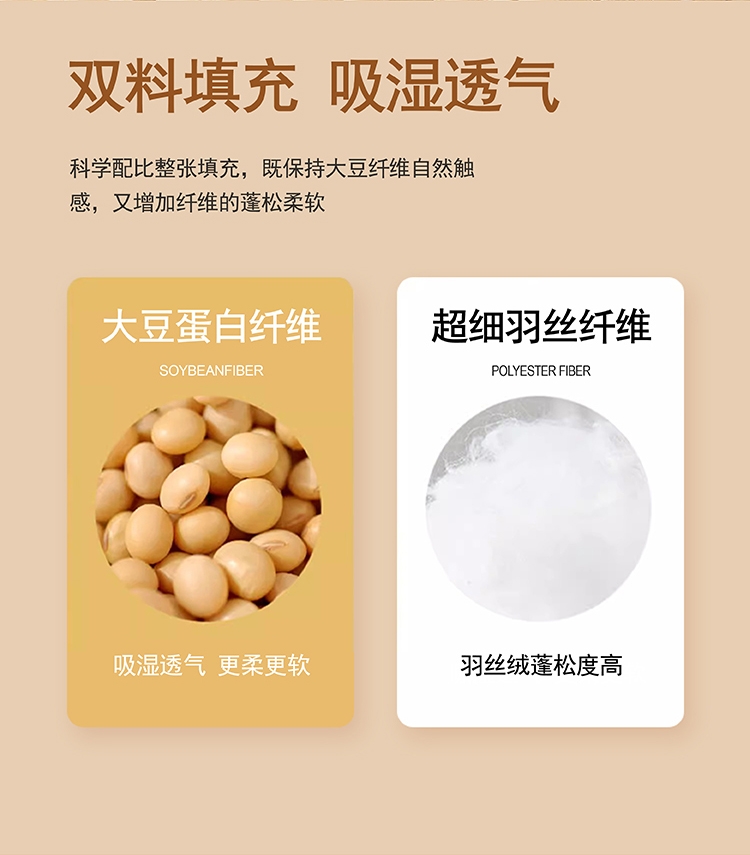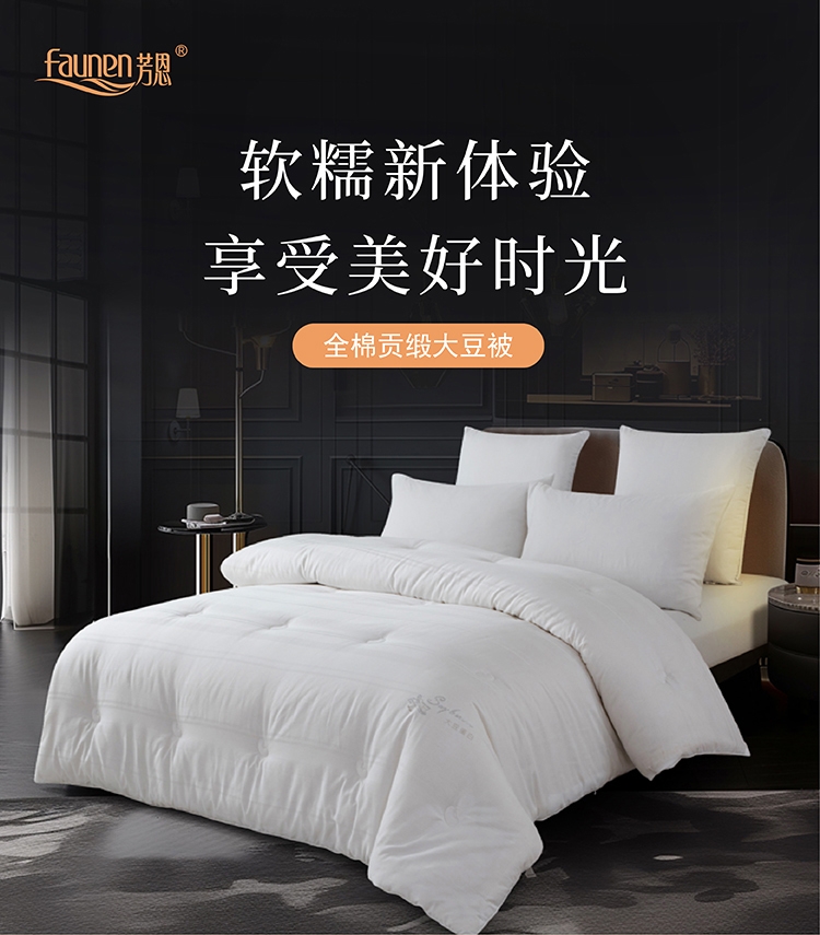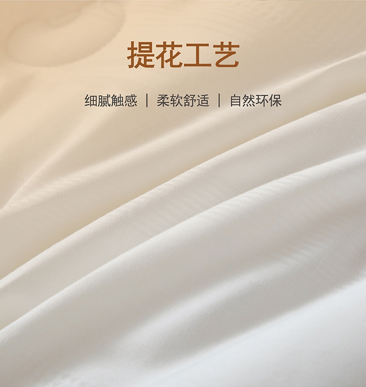 全棉贡缎提花面料,触感柔软,细腻亲肤;整张大豆蛋白纤维、超细羽丝纤维双料填充;细节用心,定点绗缝,本色布被角扣