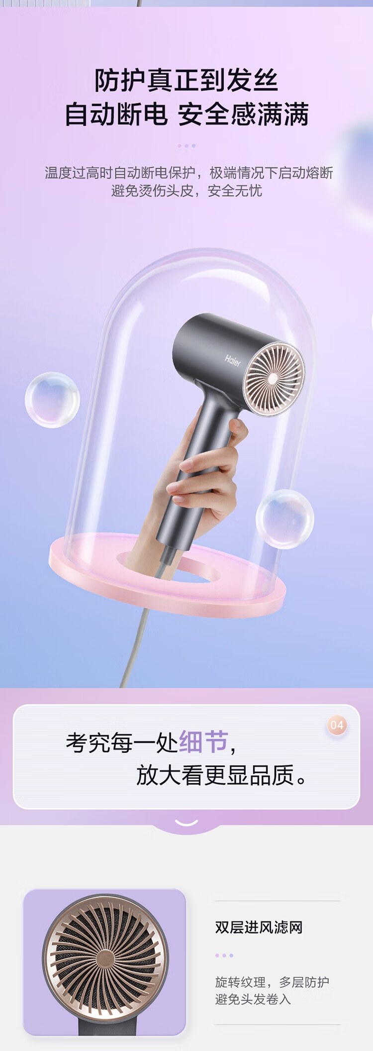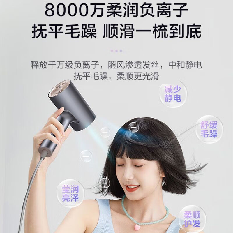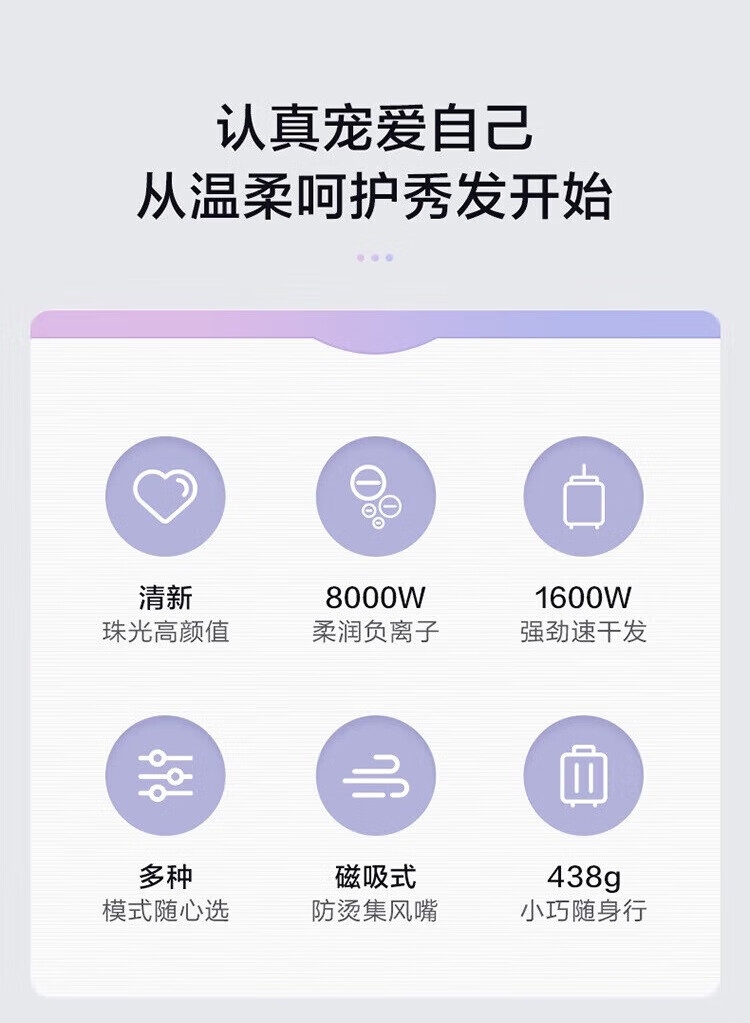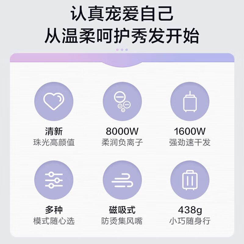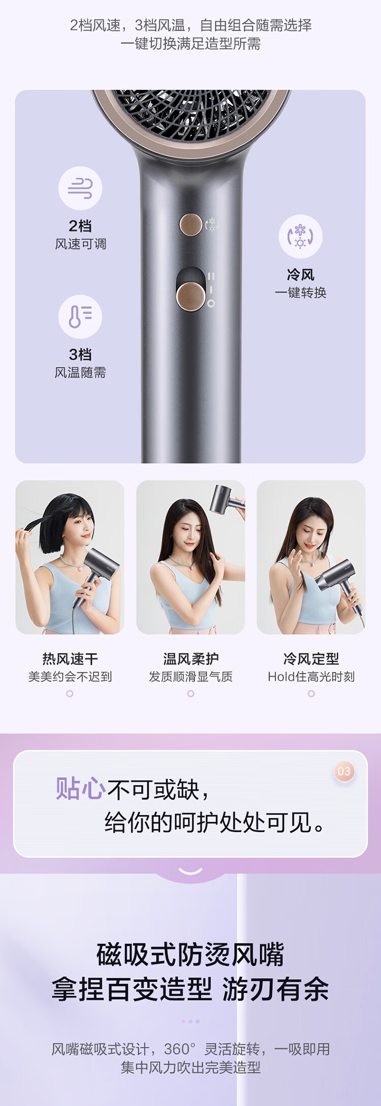 双层防烫集风嘴,用的安心;磁吸式易拆卸,轻松使用;机身轻便易收纳,随身携带无忧;两档风速、三档风温(含一键冷风),满足日常所需