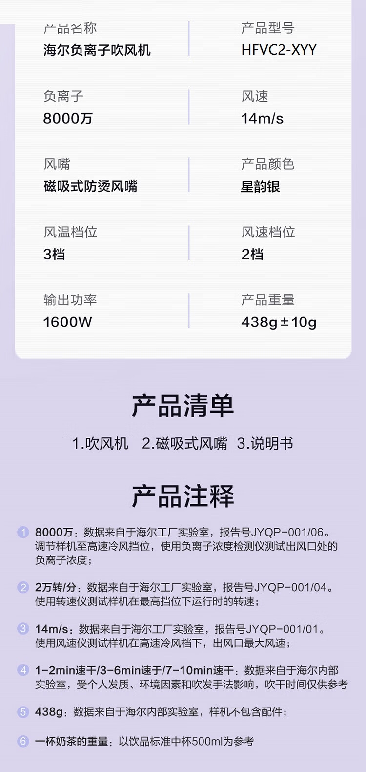 海尔 负离子磁吸风嘴高速吹风机HFVC2-XYY