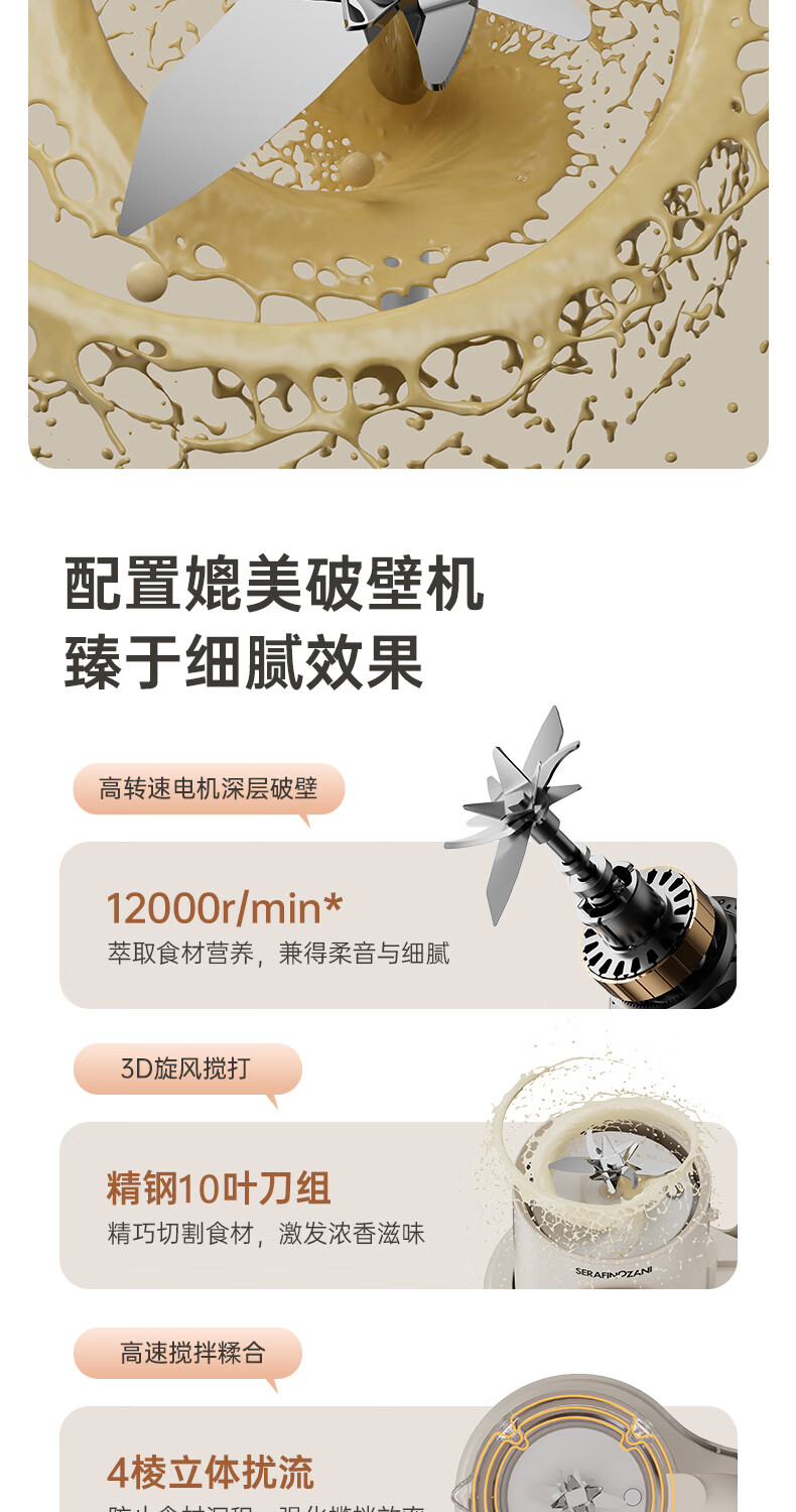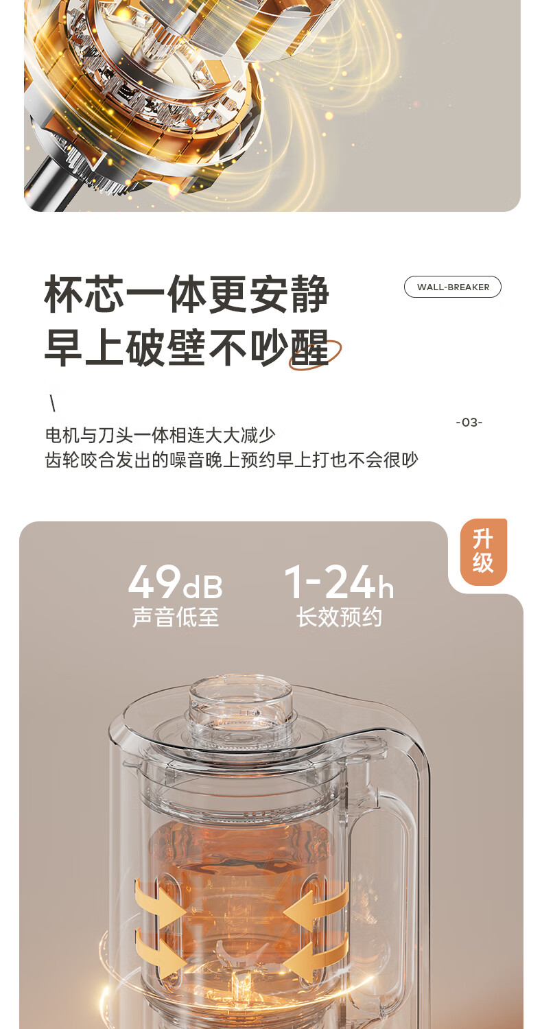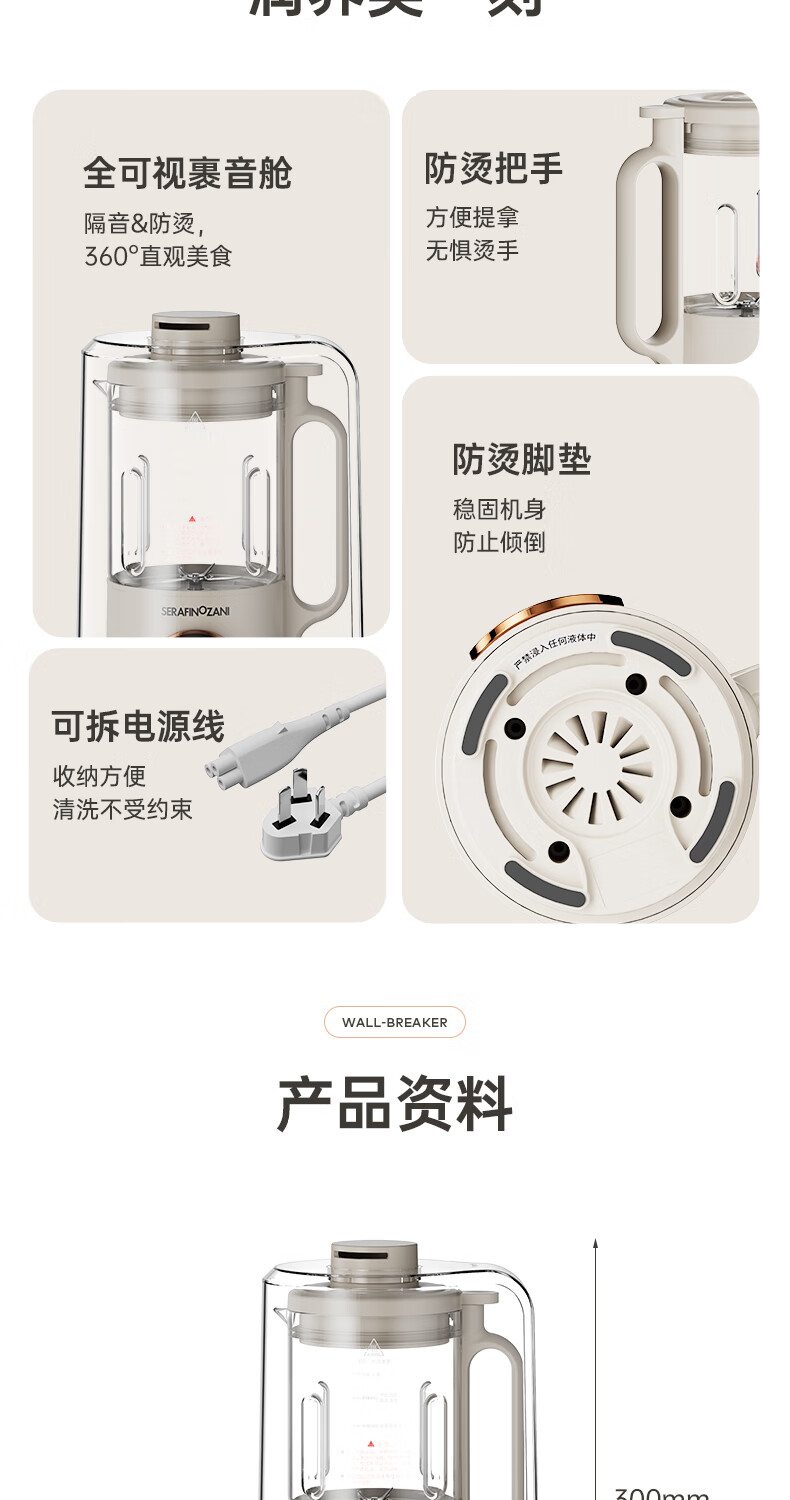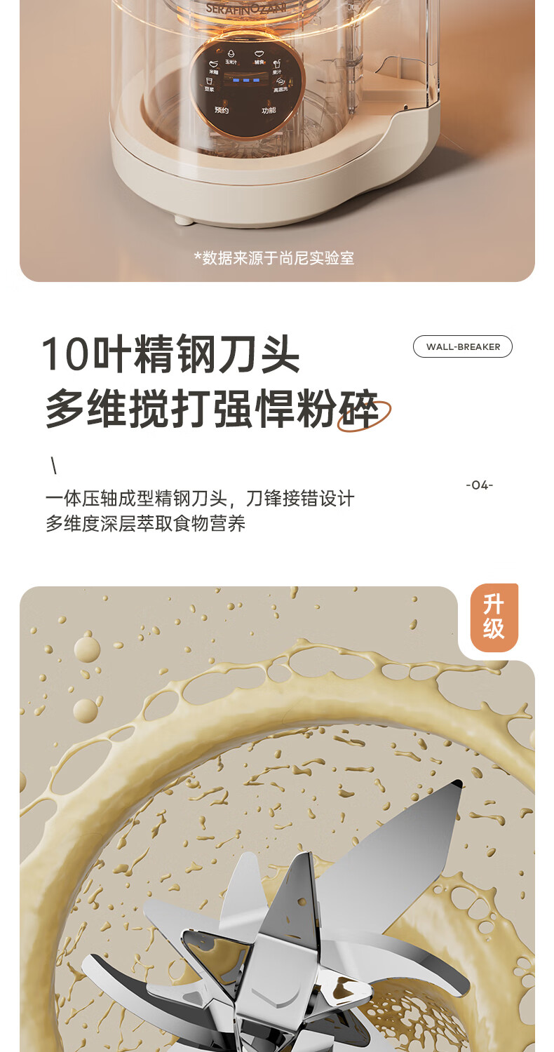 静音功能,密封隔音罩防止噪音外泄,一体式杯体;自带高温清洗,清洗方便,告别异味;12叶304材质刀头,12叶不锈钢刀头,破壁更精细