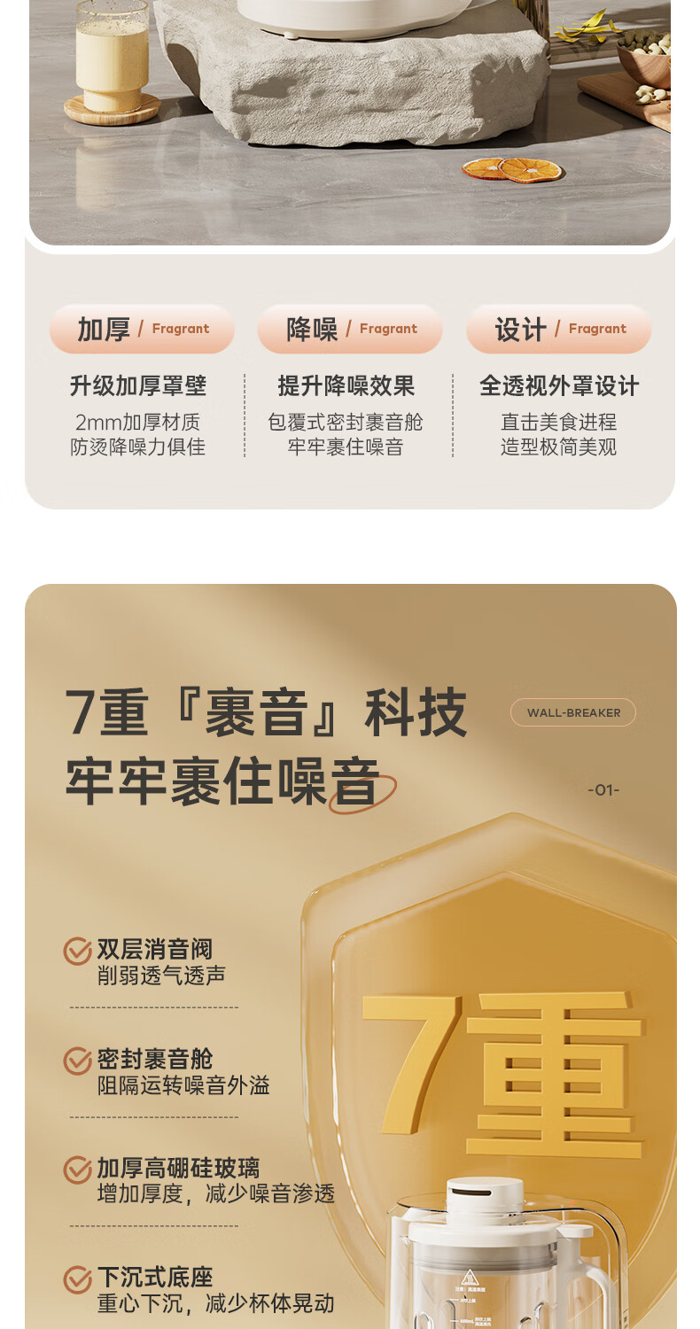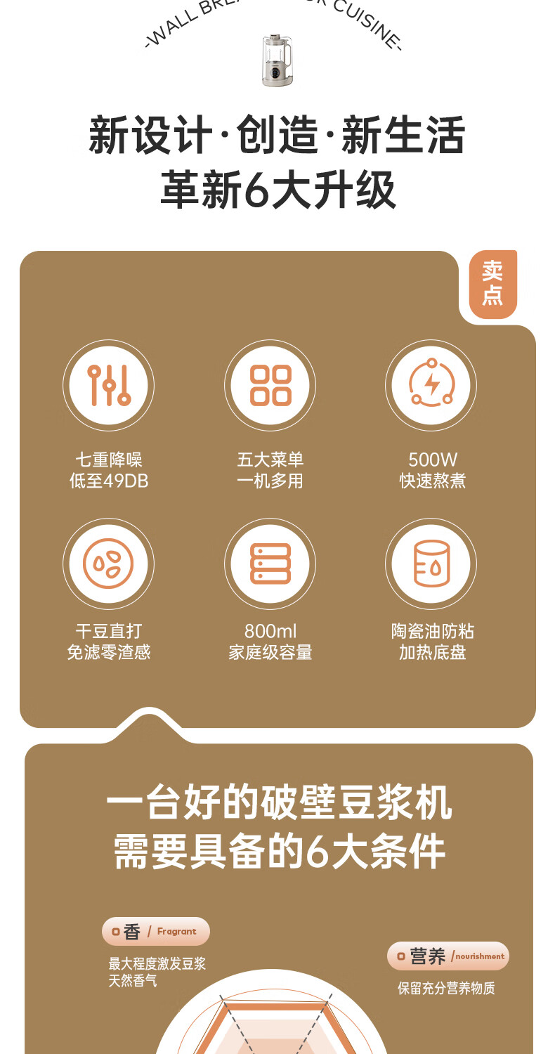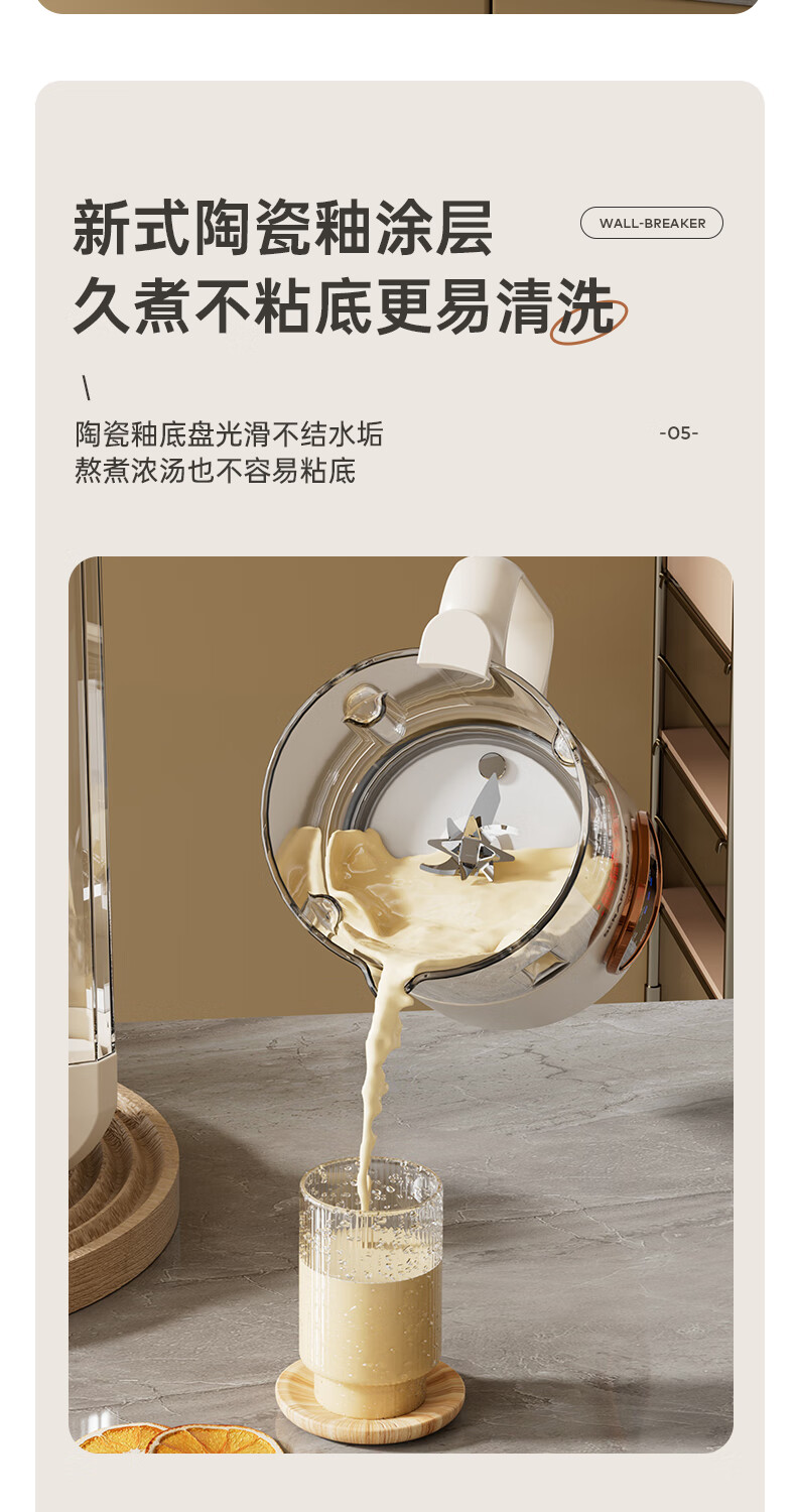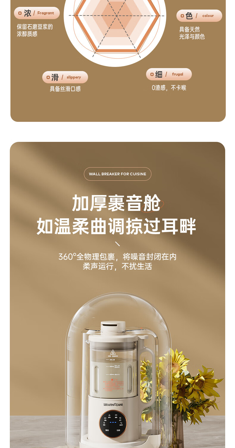 静音功能,密封隔音罩防止噪音外泄,一体式杯体;自带高温清洗,清洗方便,告别异味;12叶304材质刀头,12叶不锈钢刀头,破壁更精细