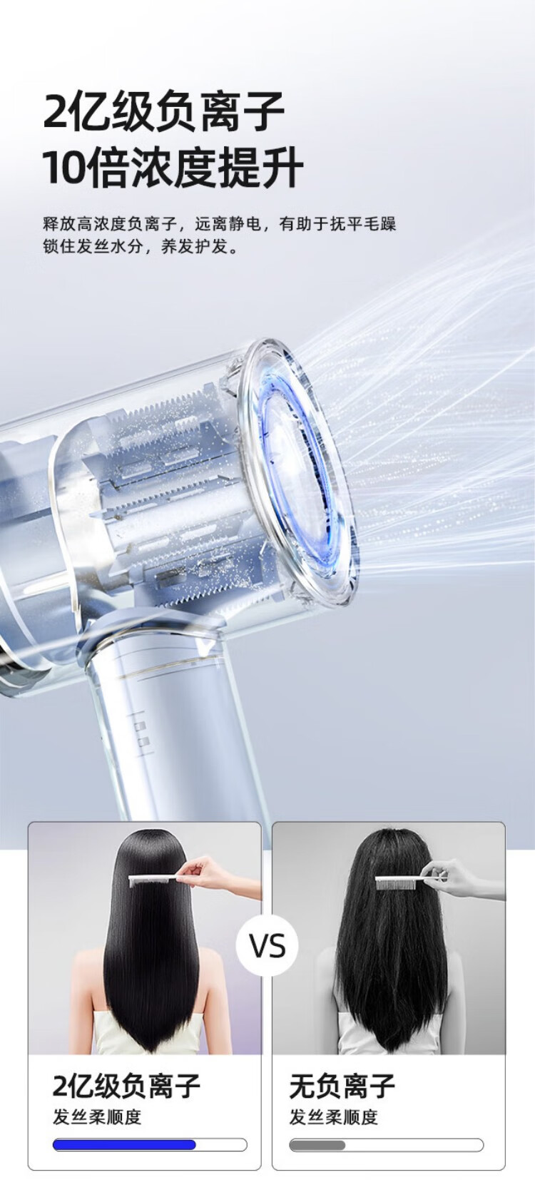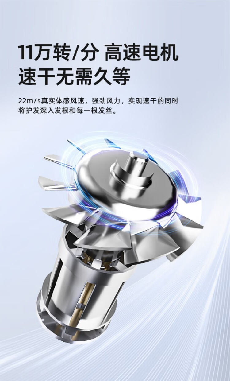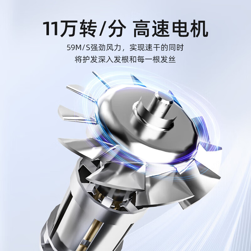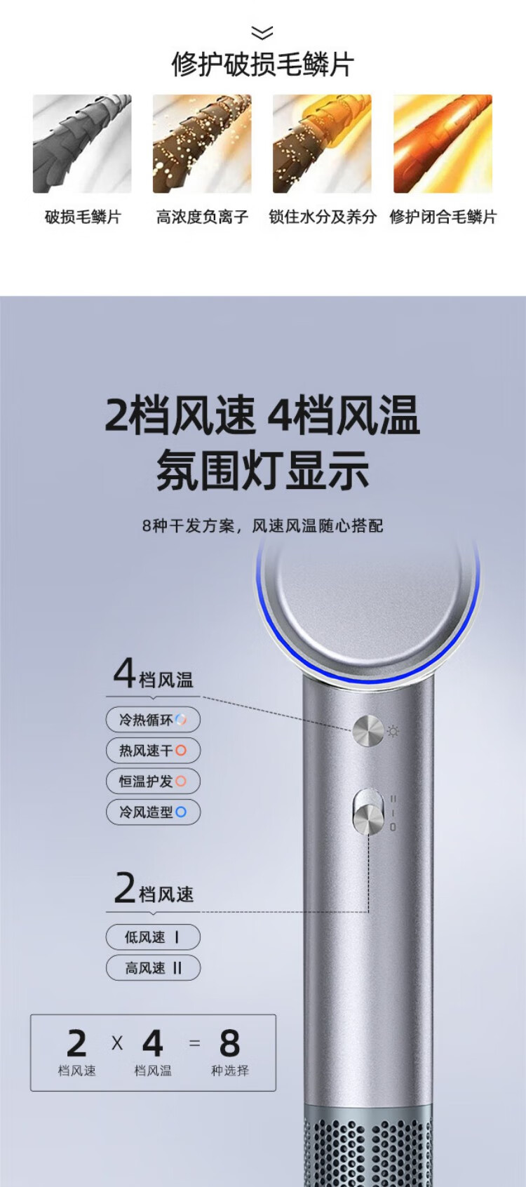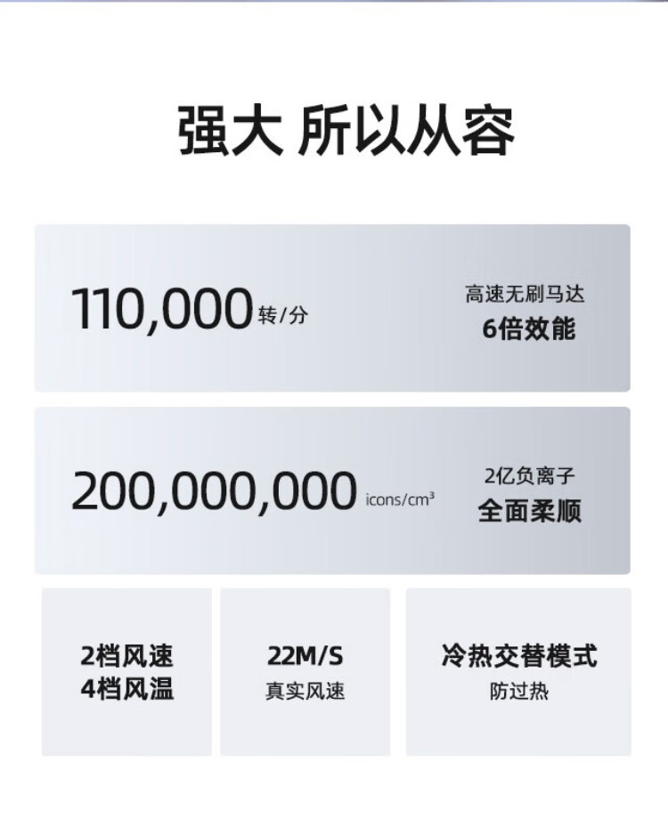 11万转高速马达、2亿负离子温养强韧秀发;采用航空级全合金机身,质感非凡;8种吹风选择:2档风速*4档风温