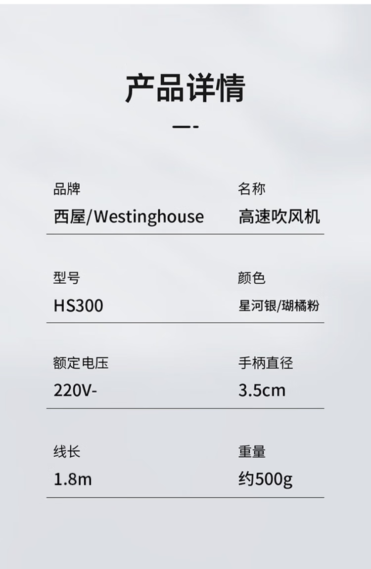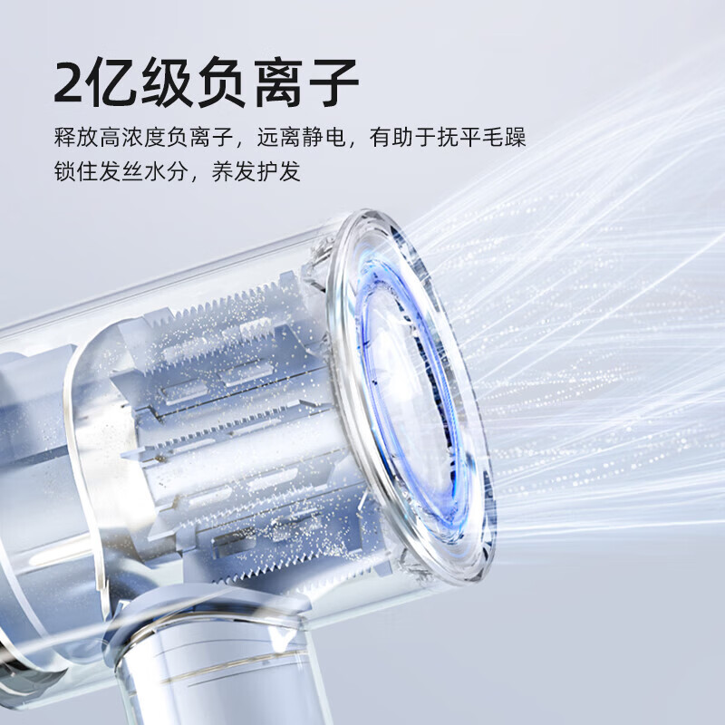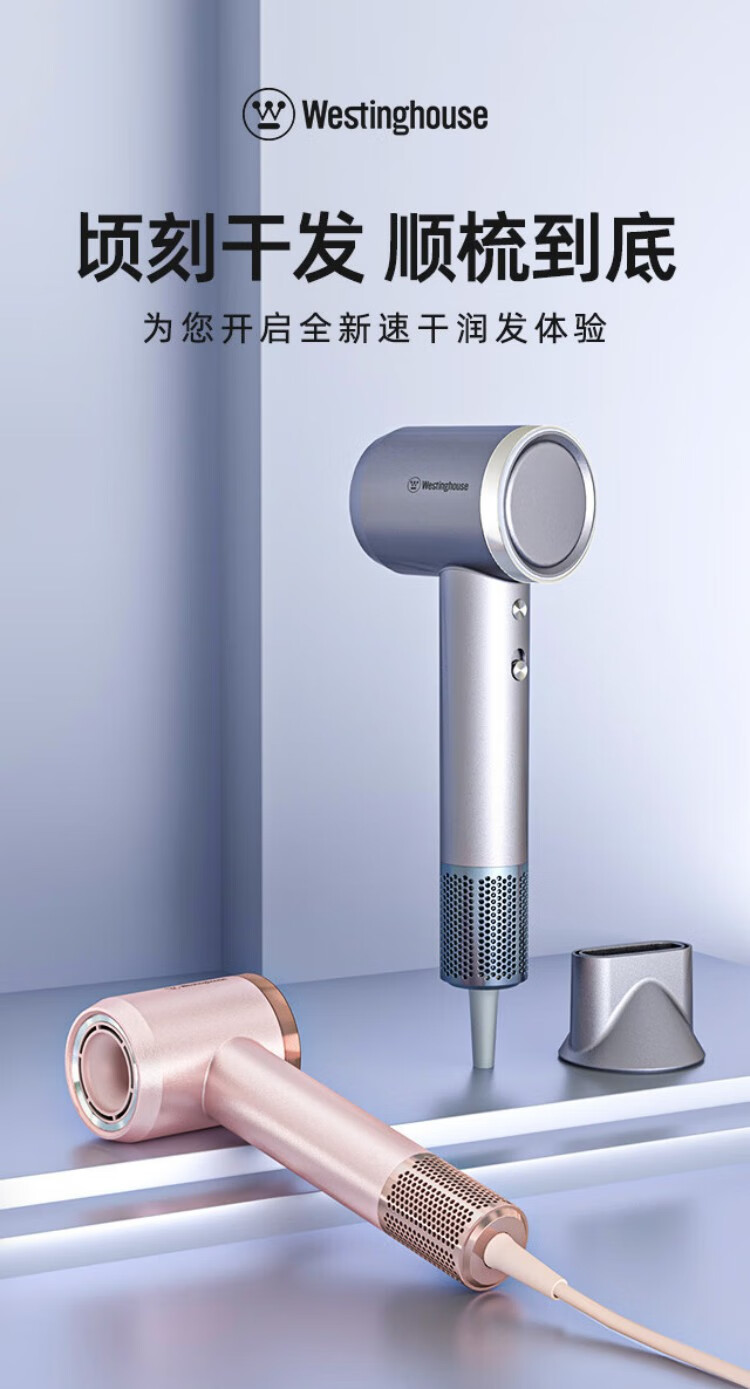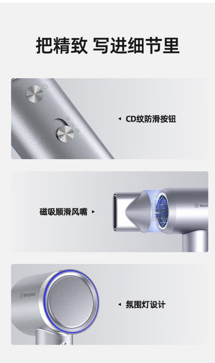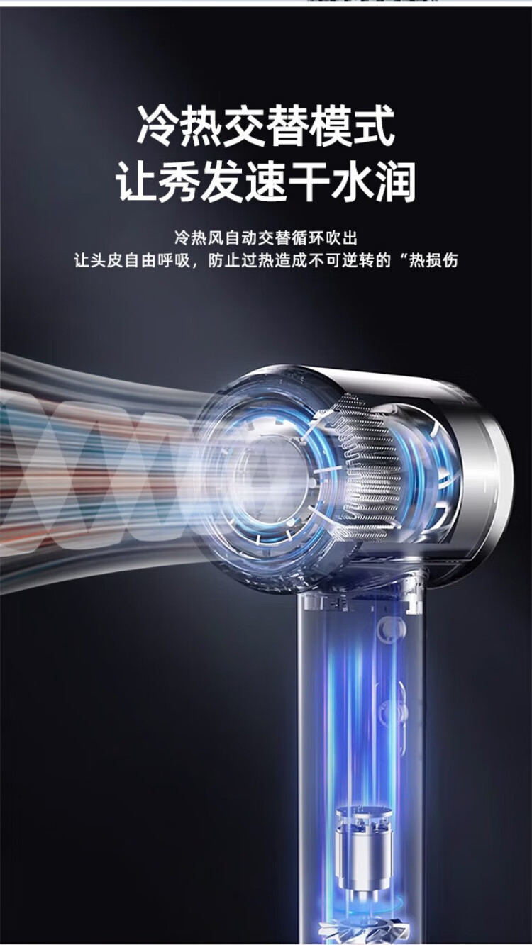 11万转高速马达、2亿负离子温养强韧秀发;采用航空级全合金机身,质感非凡;8种吹风选择:2档风速*4档风温