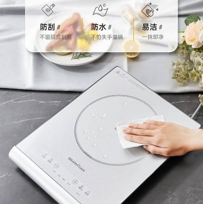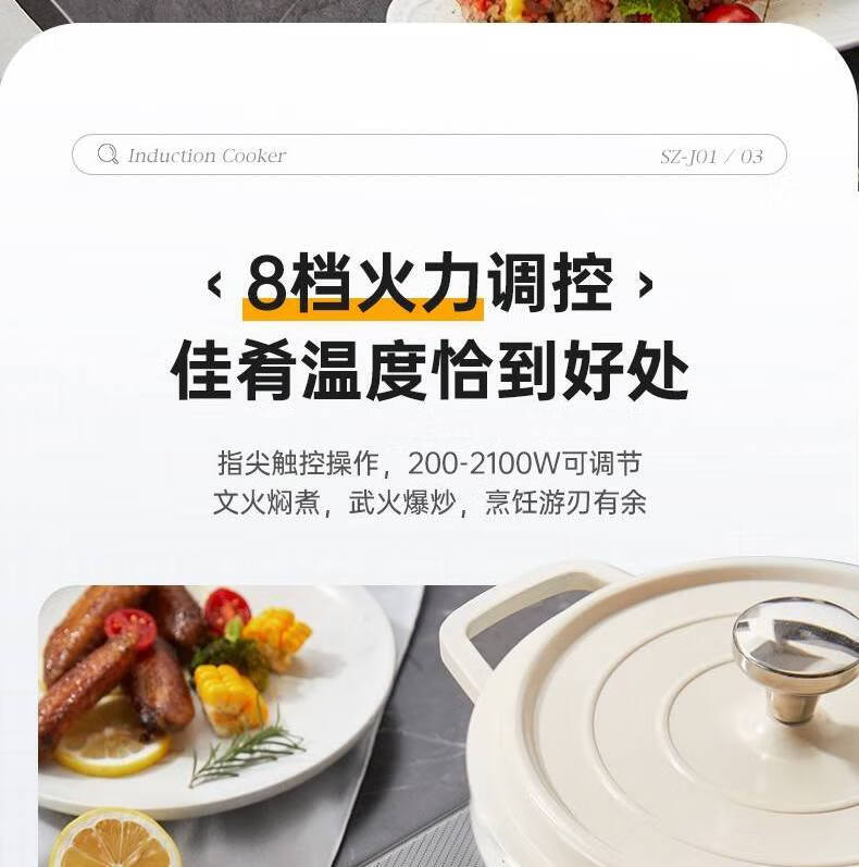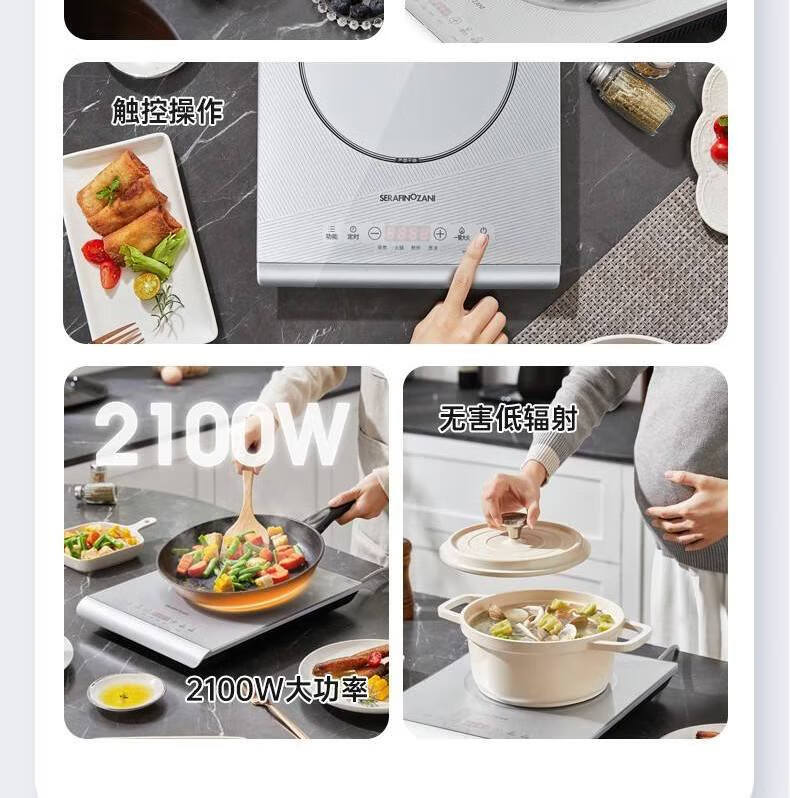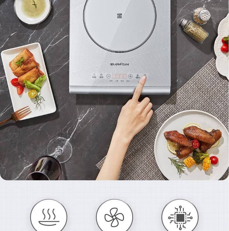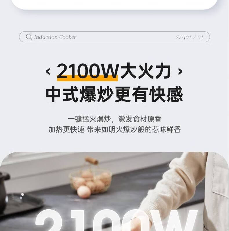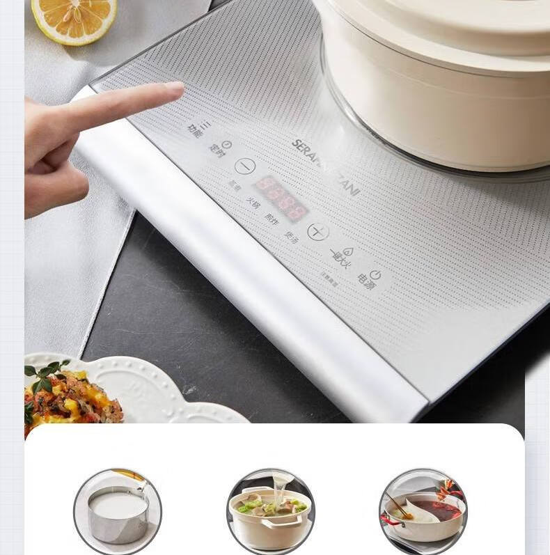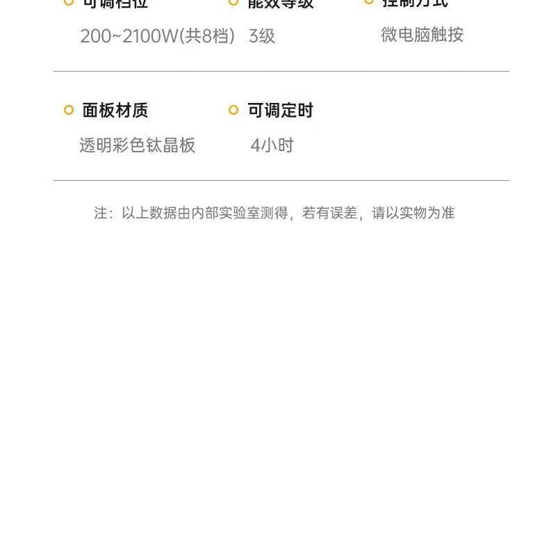 月光银透明面板&触摸屏设计;大功率8档火力,200-2100W持续加热;防水设计,六维防水,四维散热