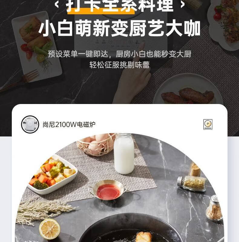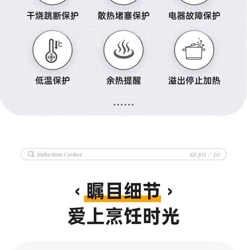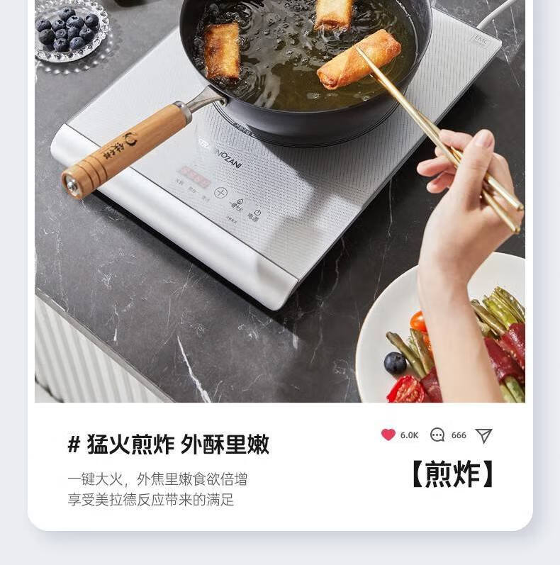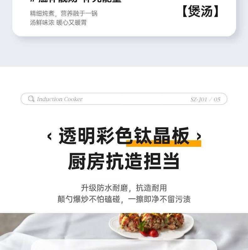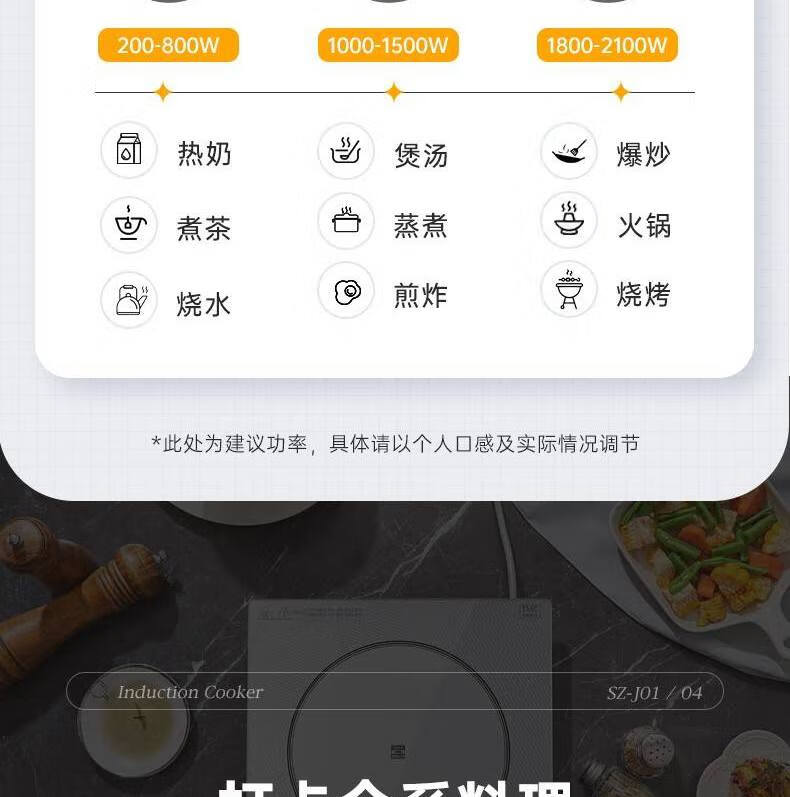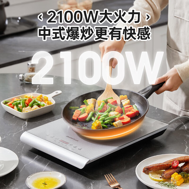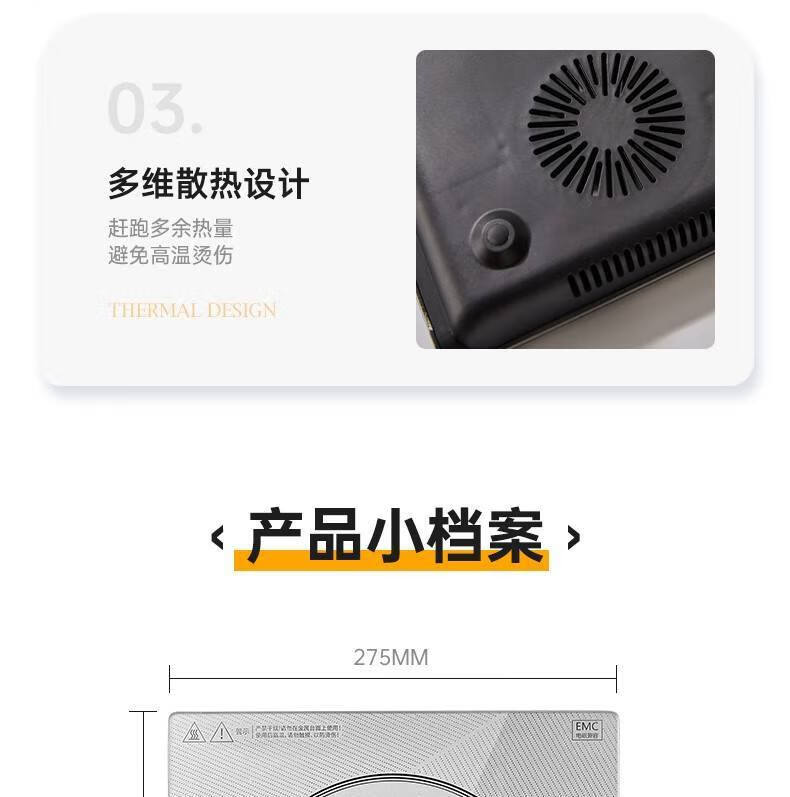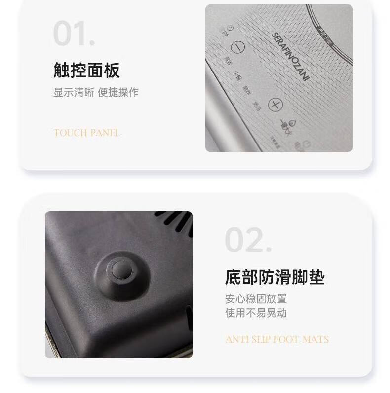 月光银透明面板&触摸屏设计;大功率8档火力,200-2100W持续加热;防水设计,六维防水,四维散热