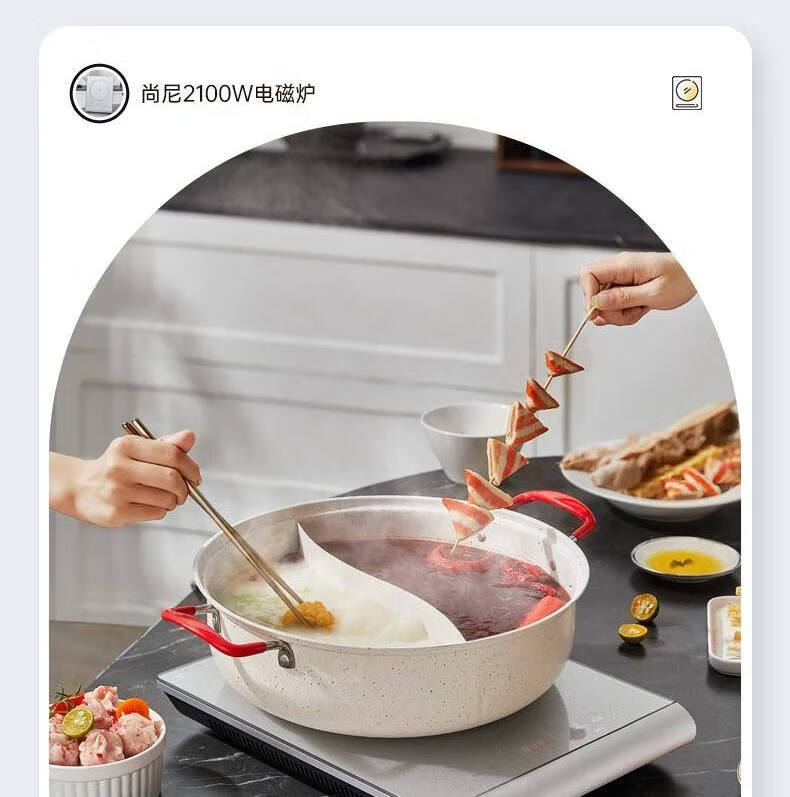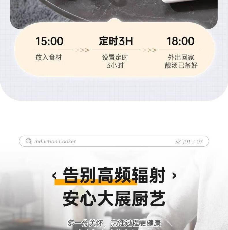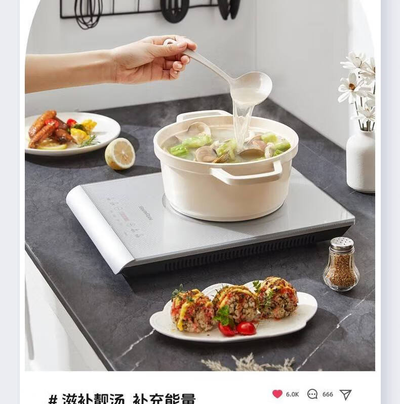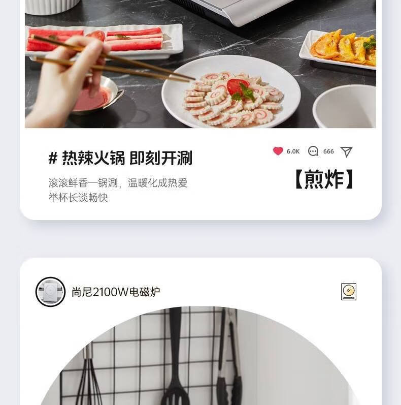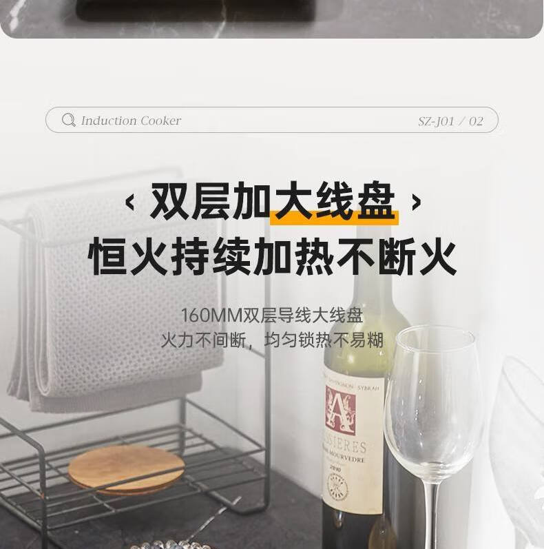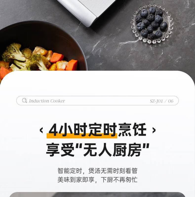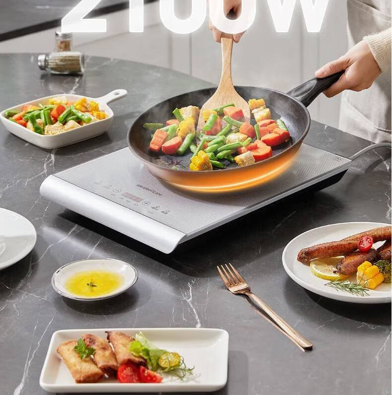 月光银透明面板&触摸屏设计;大功率8档火力,200-2100W持续加热;防水设计,六维防水,四维散热