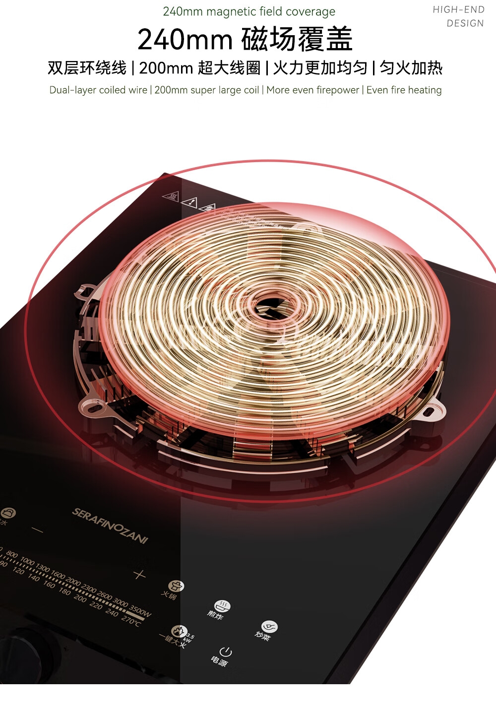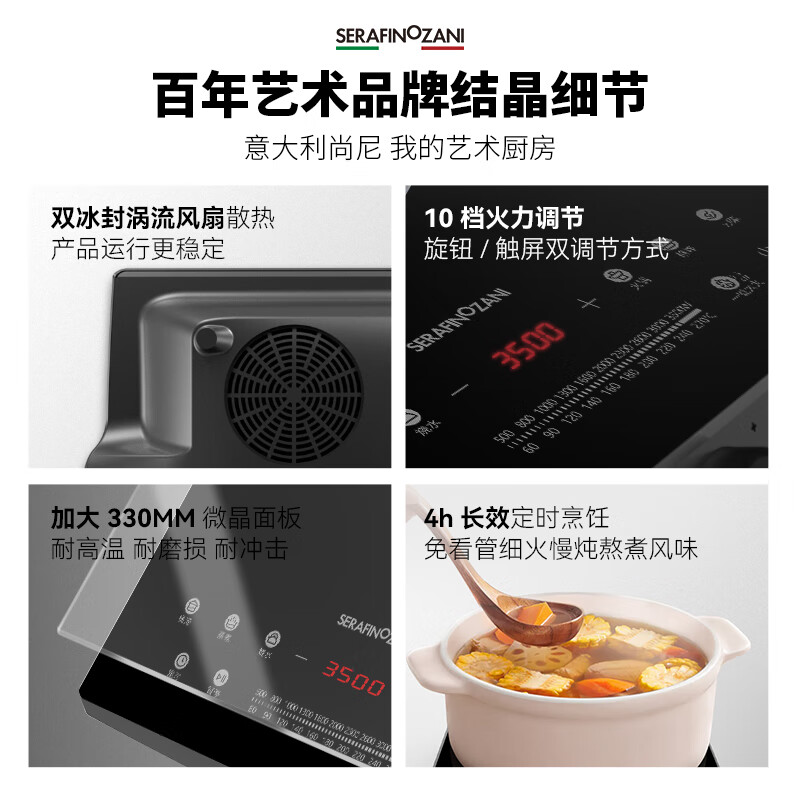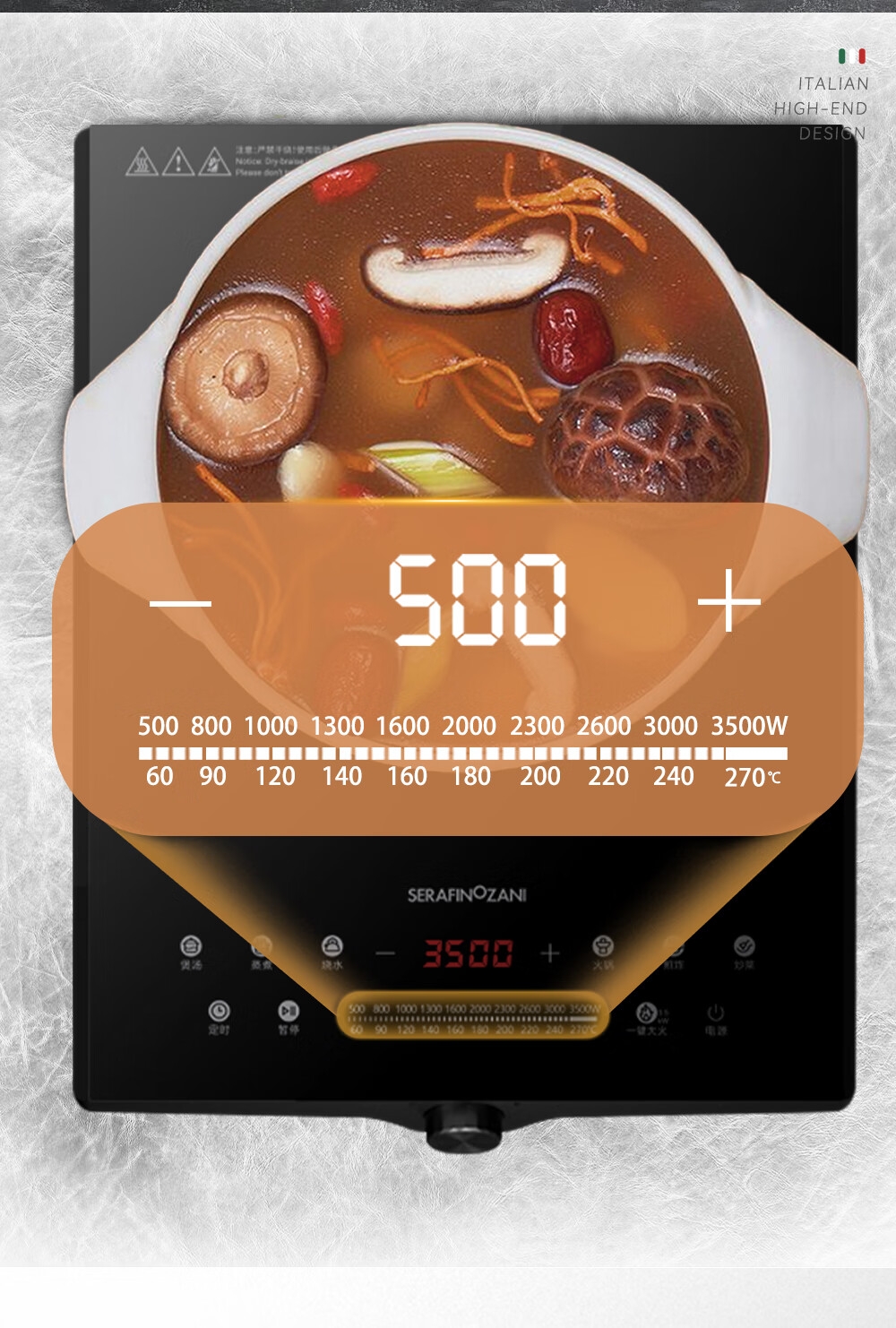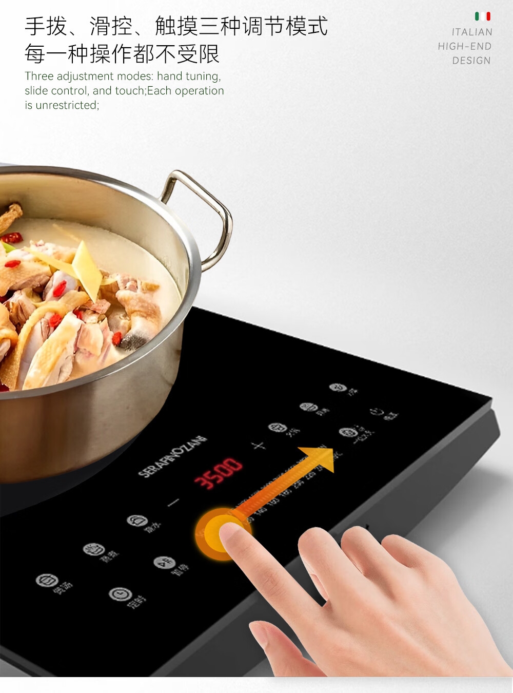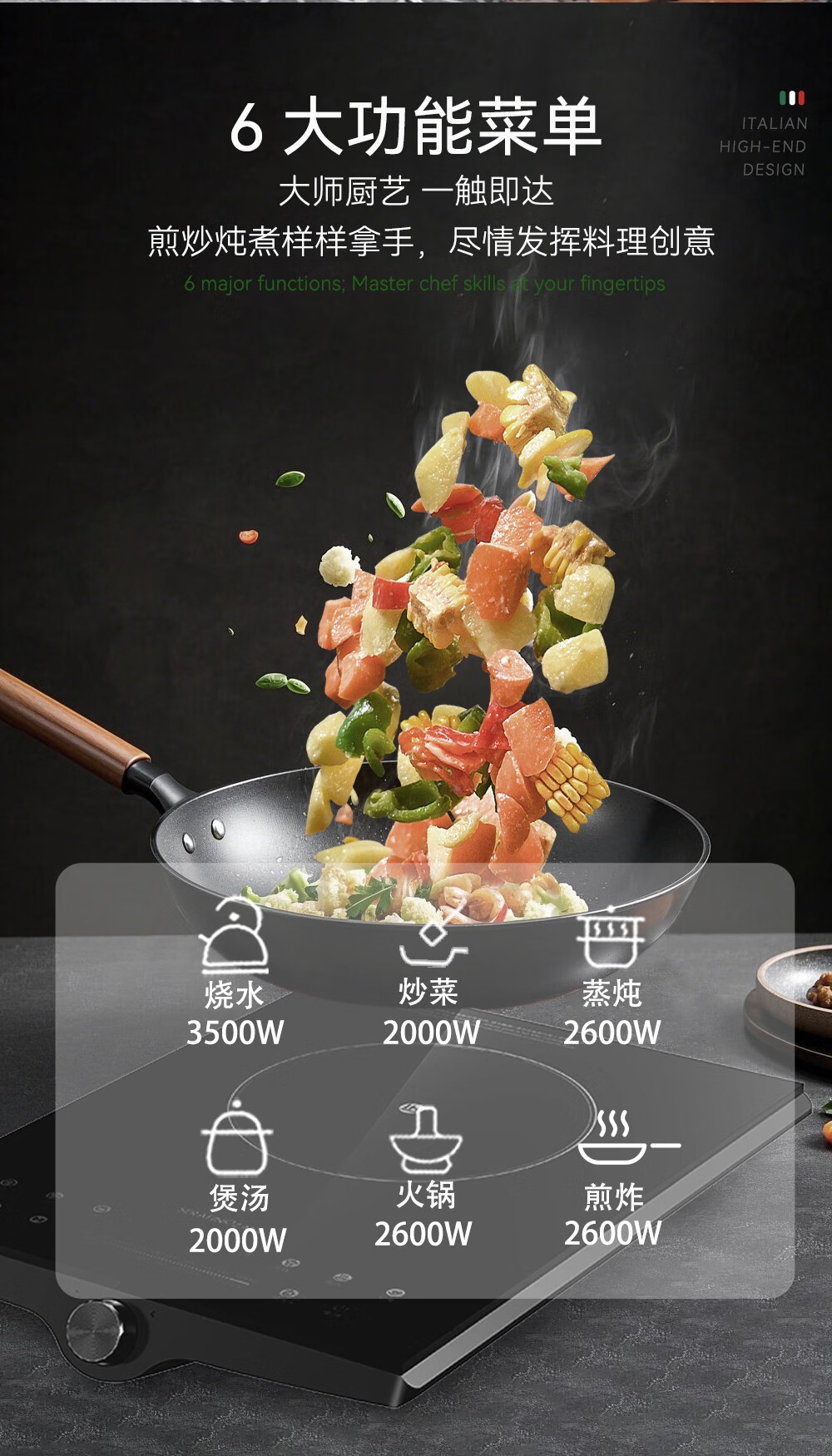 超大功率,3500W大火力;6大烹饪智能模式,触控旋钮双模式操控,10档火力;智能定时,0-4小时智能定时