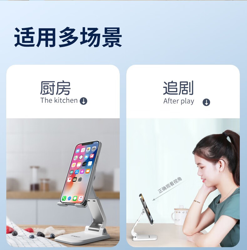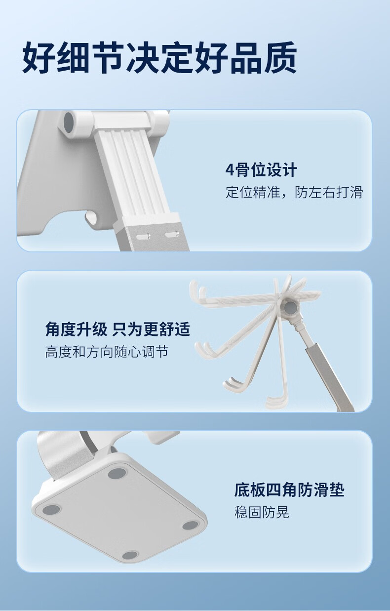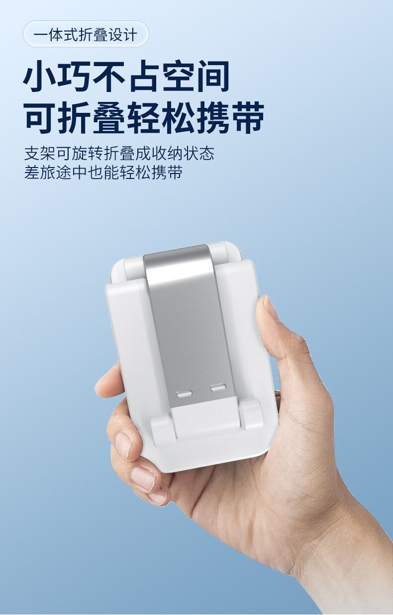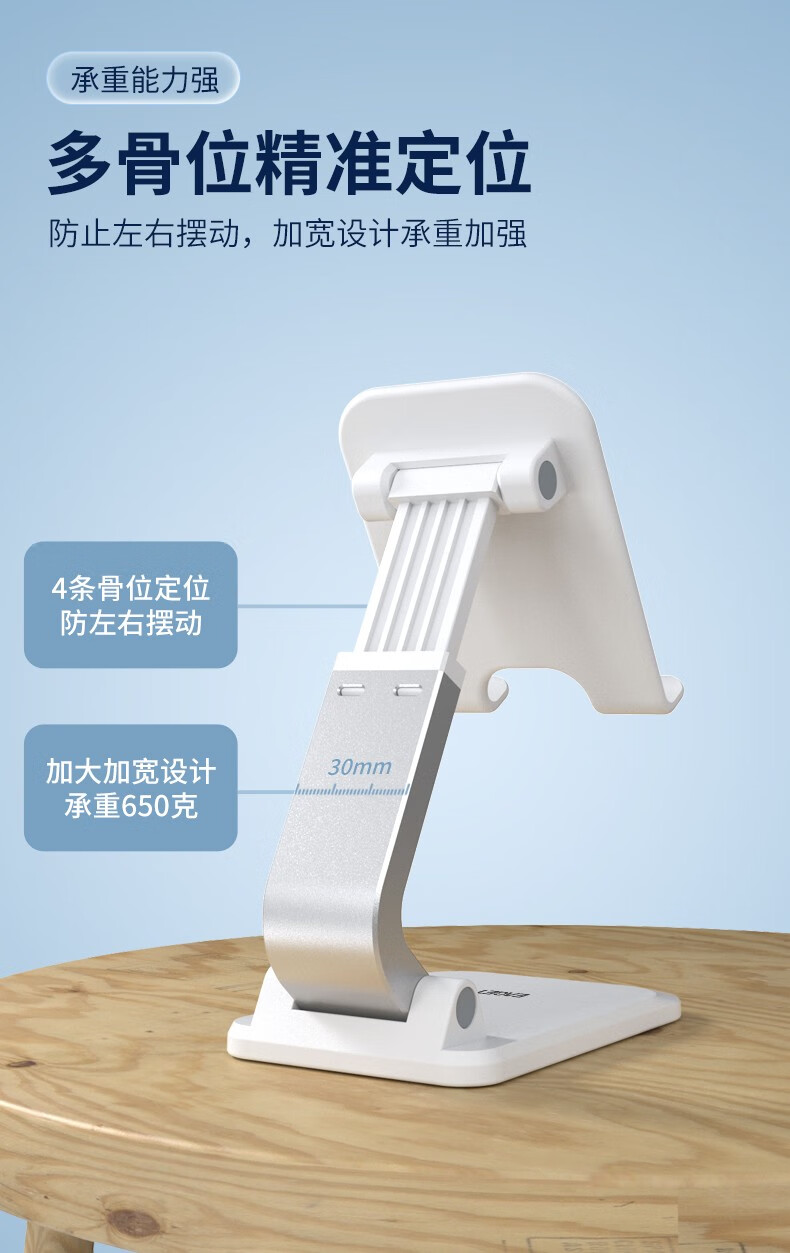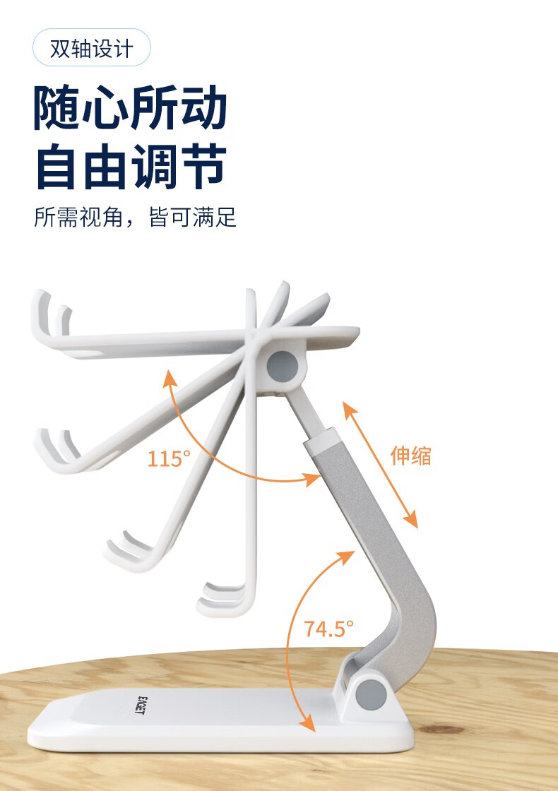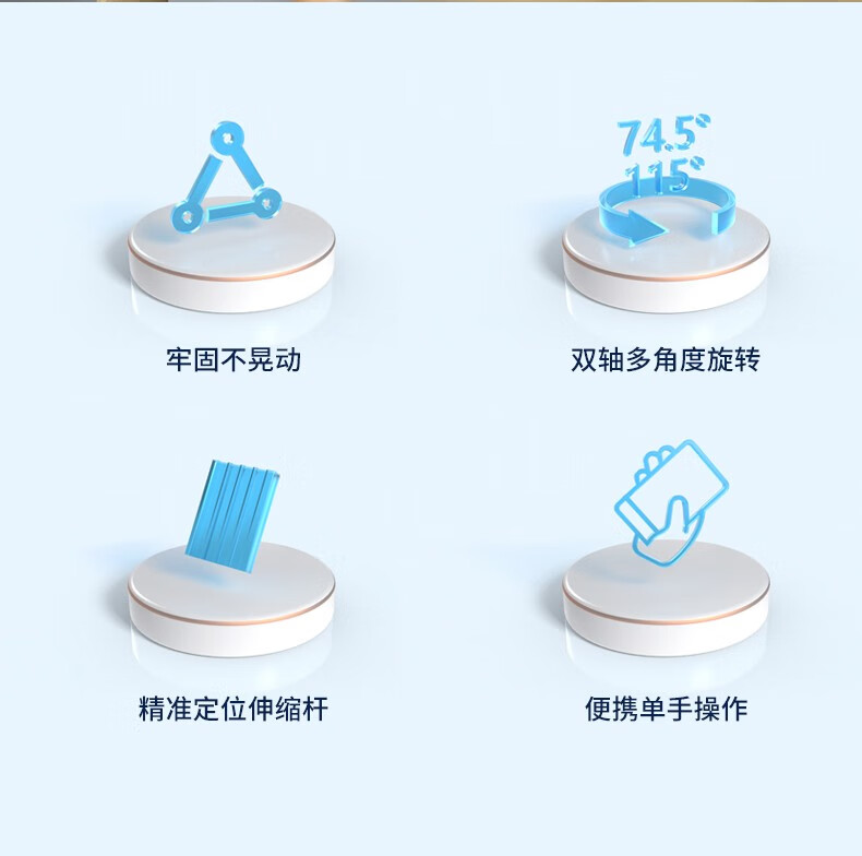 折叠伸缩,角度随心,双轴多角度旋转,牢固不晃动;4骨位设计,双轴多角度旋转,精准定位伸缩杆;便携单手操作