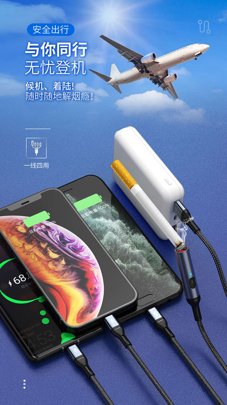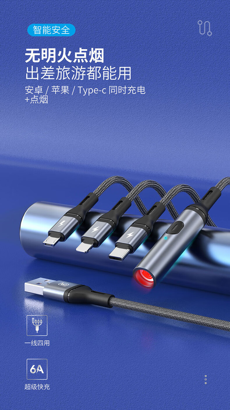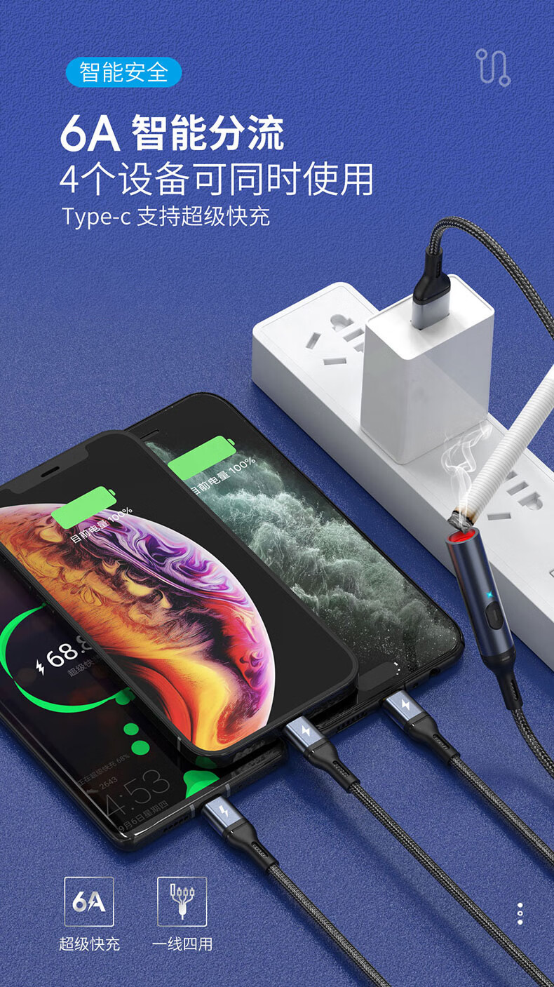 6A 智能分流,4个设备可同时使用;;防风无明火点烟,出差旅游都能用;铝合金外壳SR一体成型加固耐用不断裂 延长使用