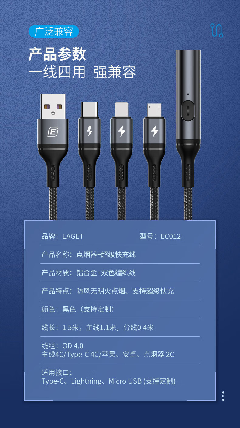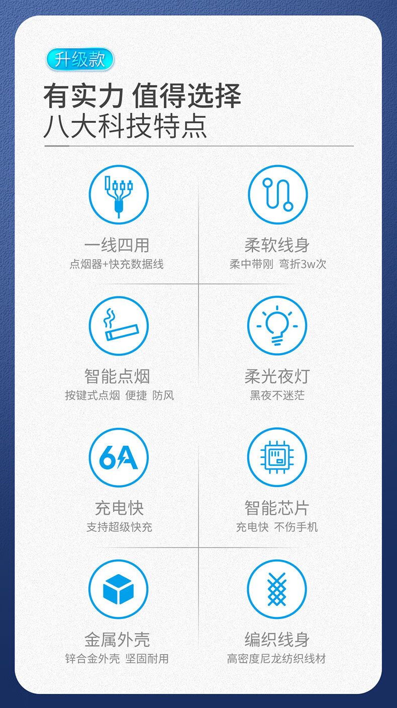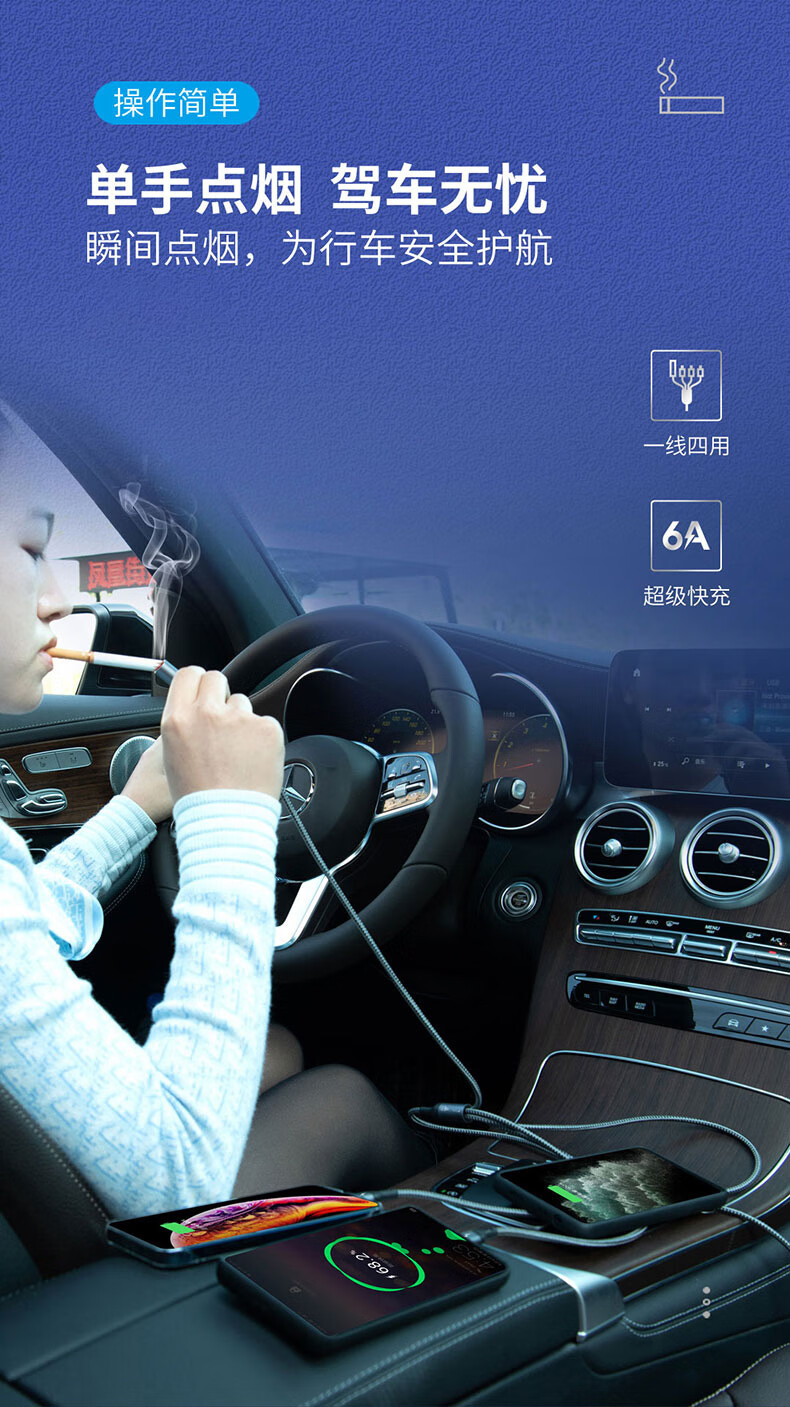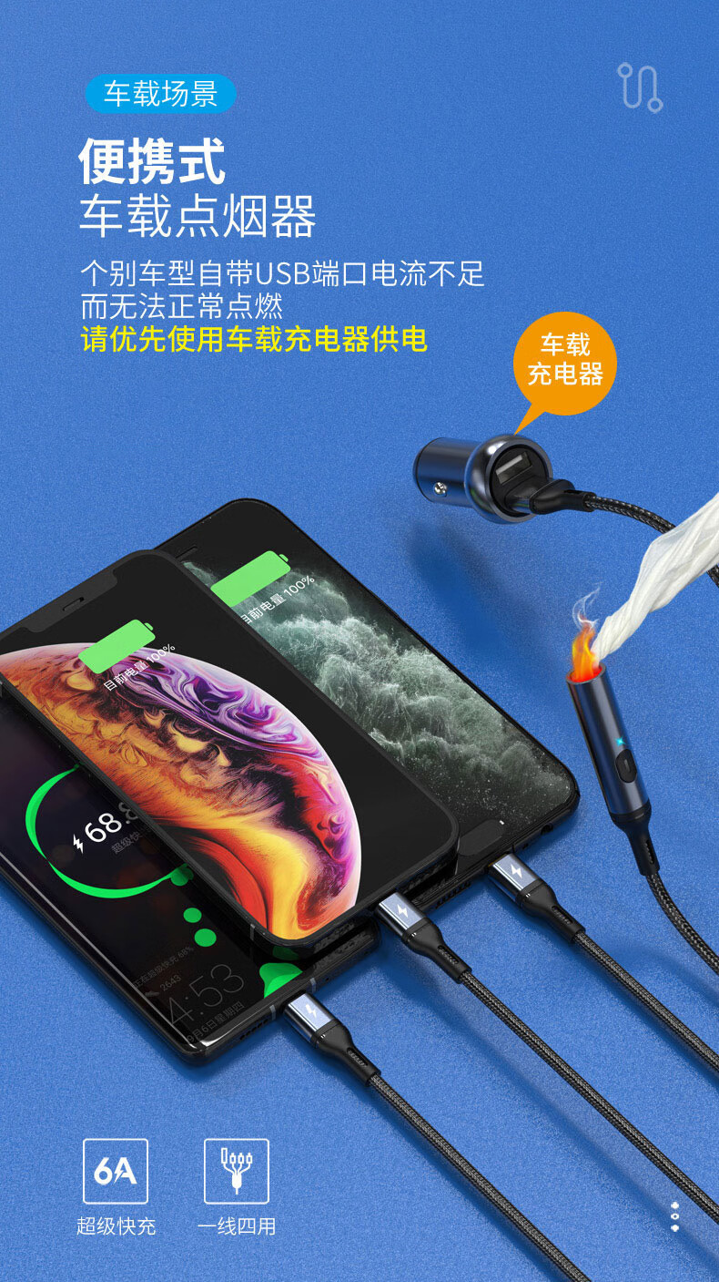 6A 智能分流,4个设备可同时使用;;防风无明火点烟,出差旅游都能用;铝合金外壳SR一体成型加固耐用不断裂 延长使用