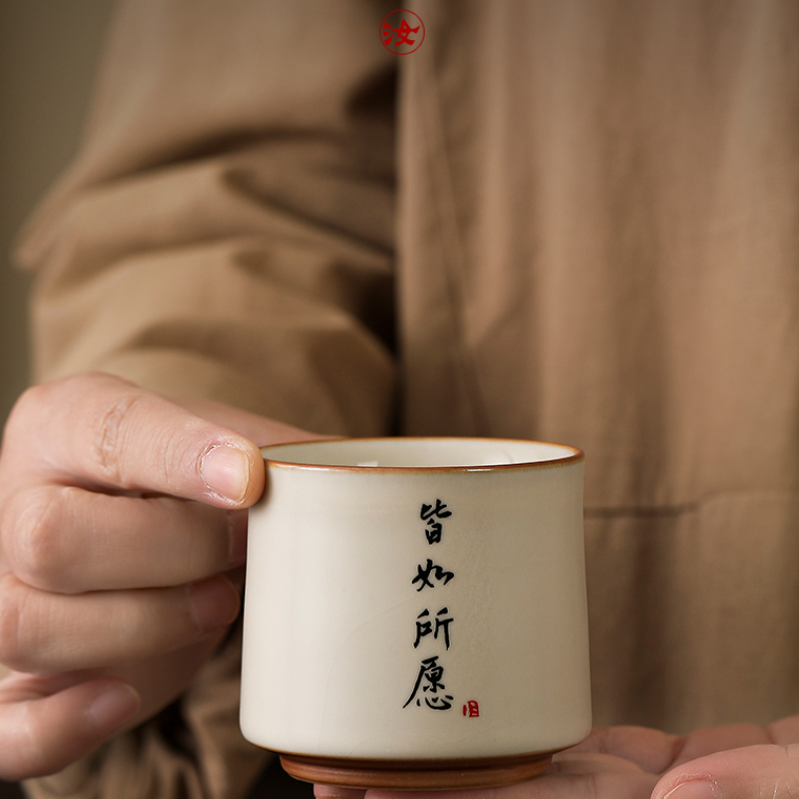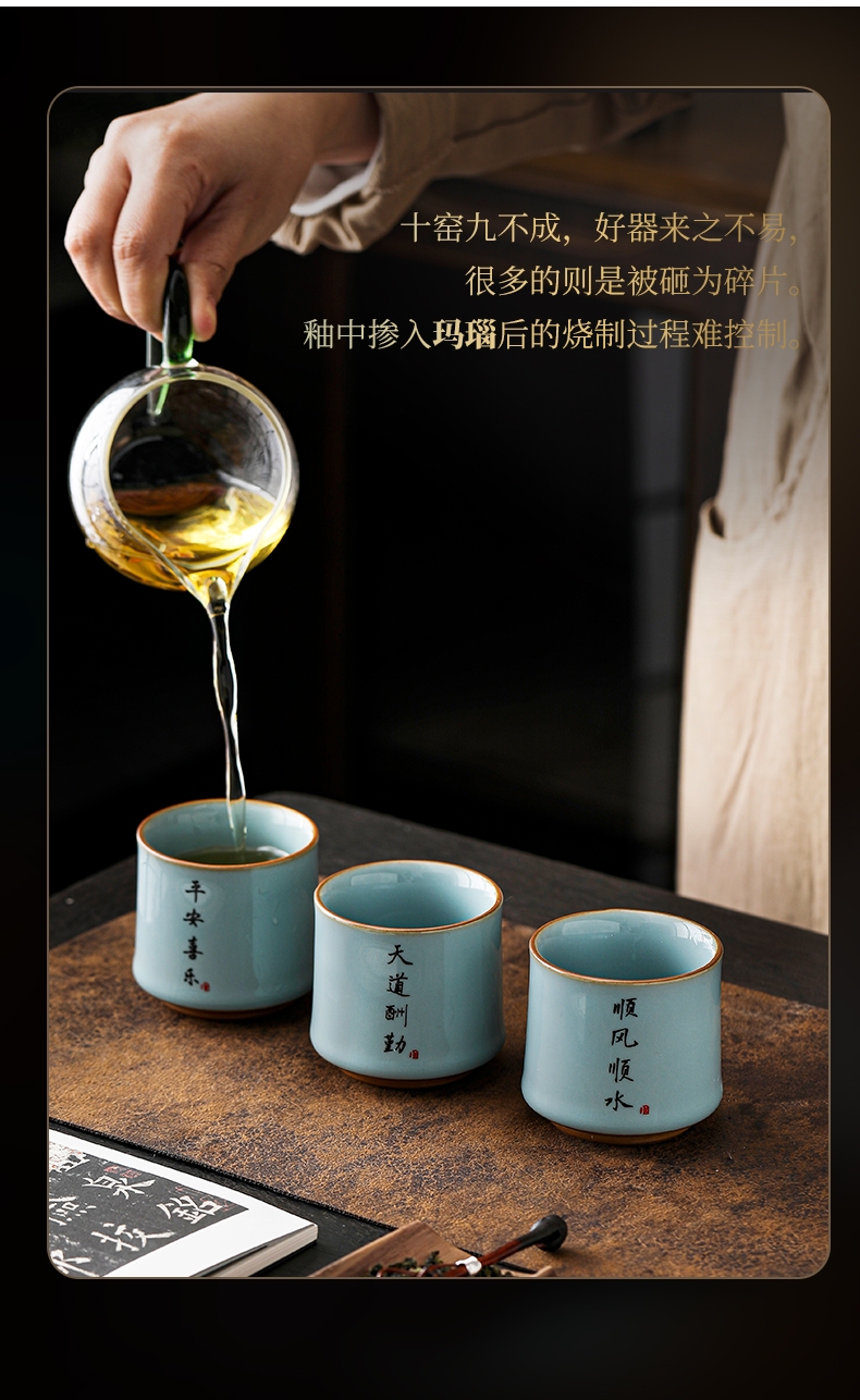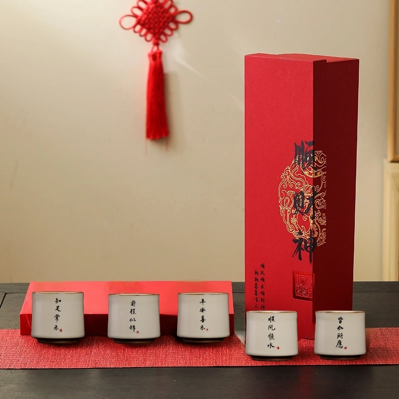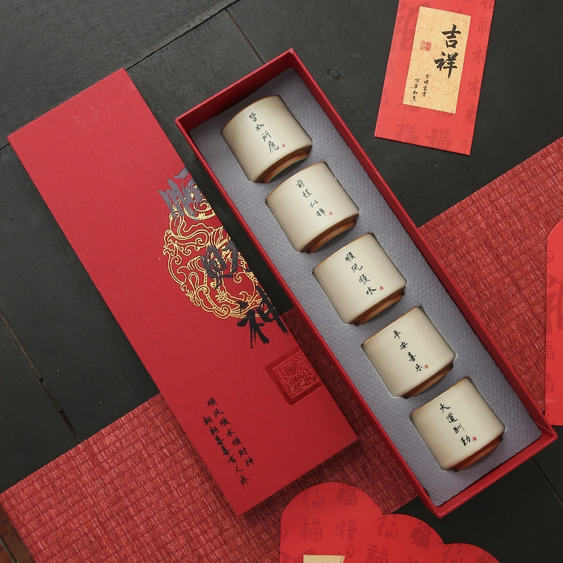 严选泥料经数十道工序,三次施釉,两道窑烧,大器天成;外壁玛瑙入釉,蕴润柔和,如脂似玉,肥厚莹润。;禅意开片,茶养金线,开片成画,承载岁月诗情。;创意书法入瓷,寄心情于茶水间,谈笑间抒发人生感悟;红色喜庆礼盒设计,寄托美好祝福,送礼佳品。