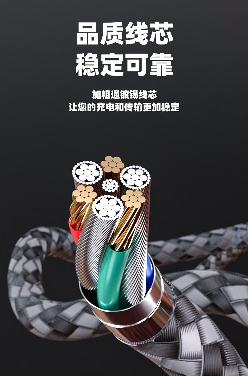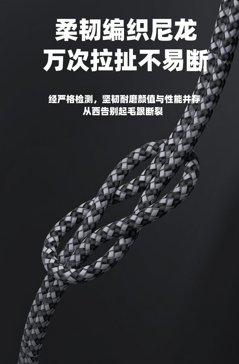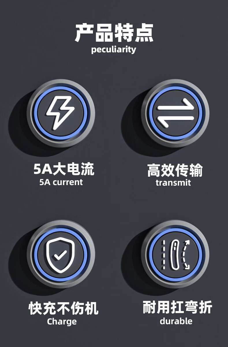 5A大电流,高效传输 耐用抗弯折;铝合金外壳 快充抗氧化;尼龙精编线 品质保障