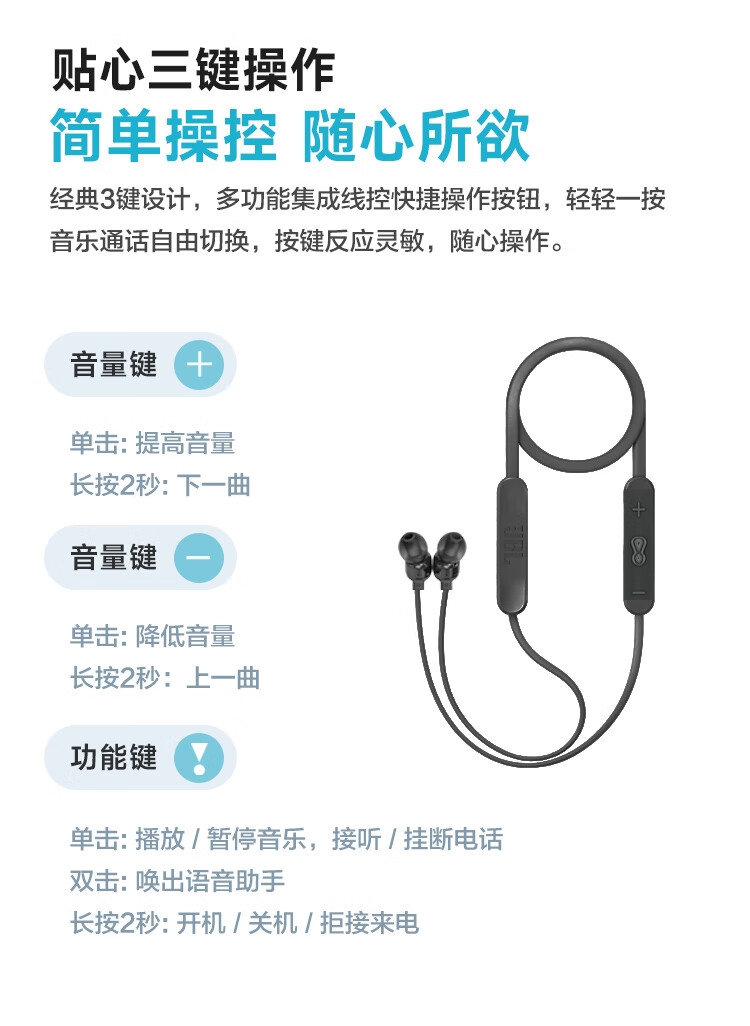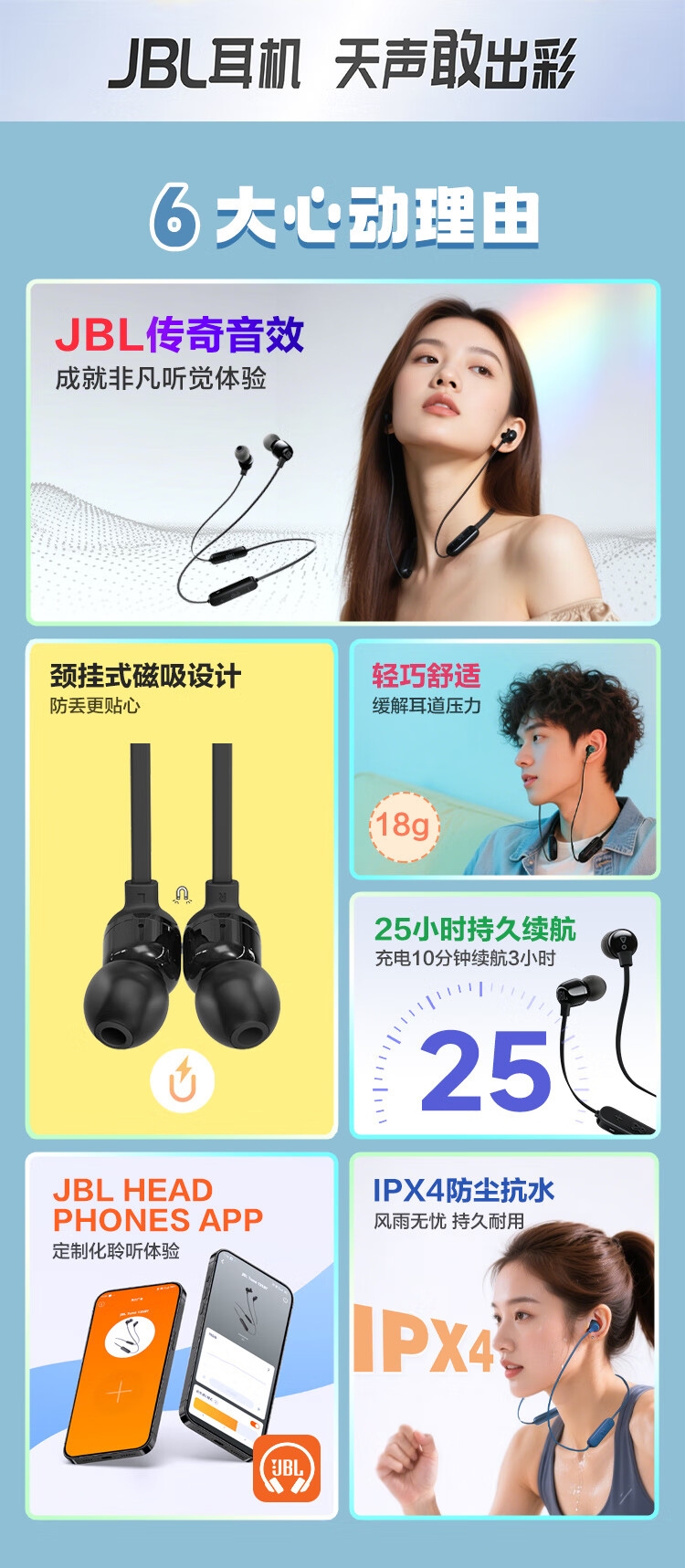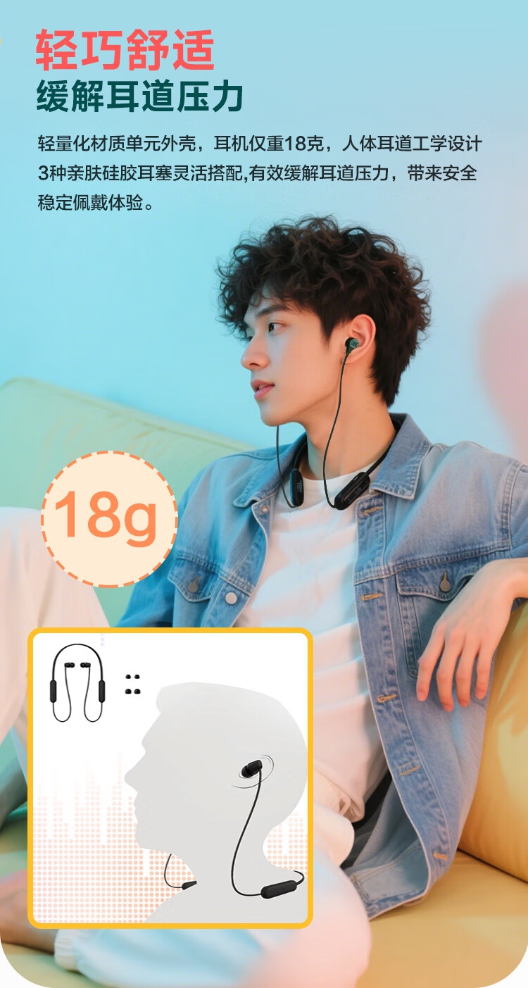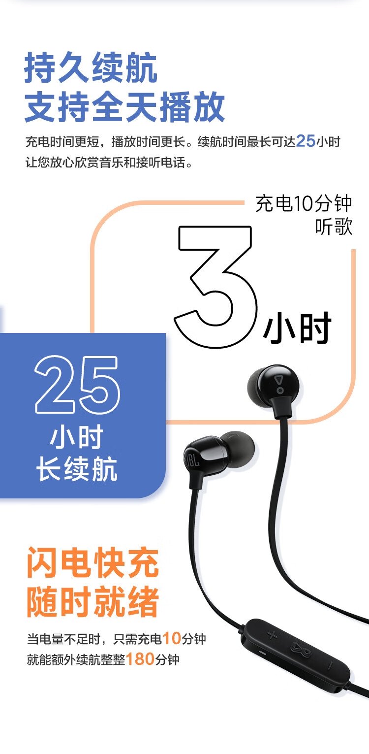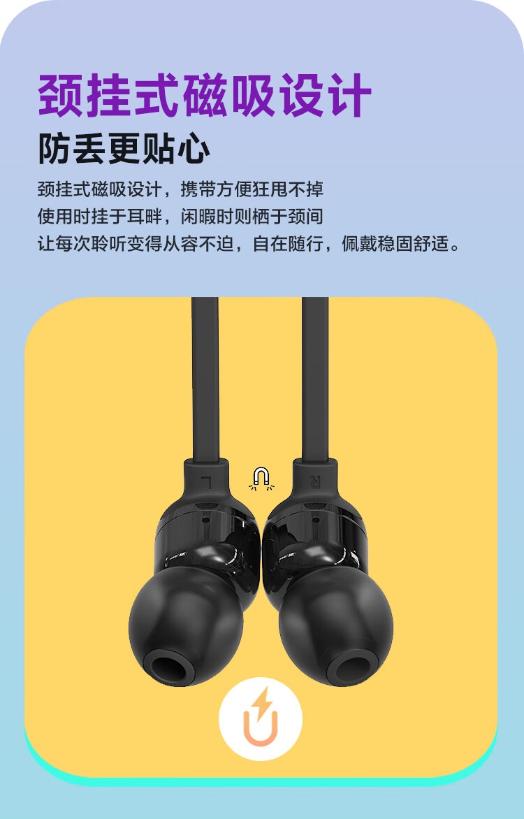 25小时持久续航 充电10分钟续航3小时;颈挂式磁吸设计 防丢更贴心;轻巧舒适 缓解耳道压力;IPX4防尘抗水 风雨无忧 持久耐用
