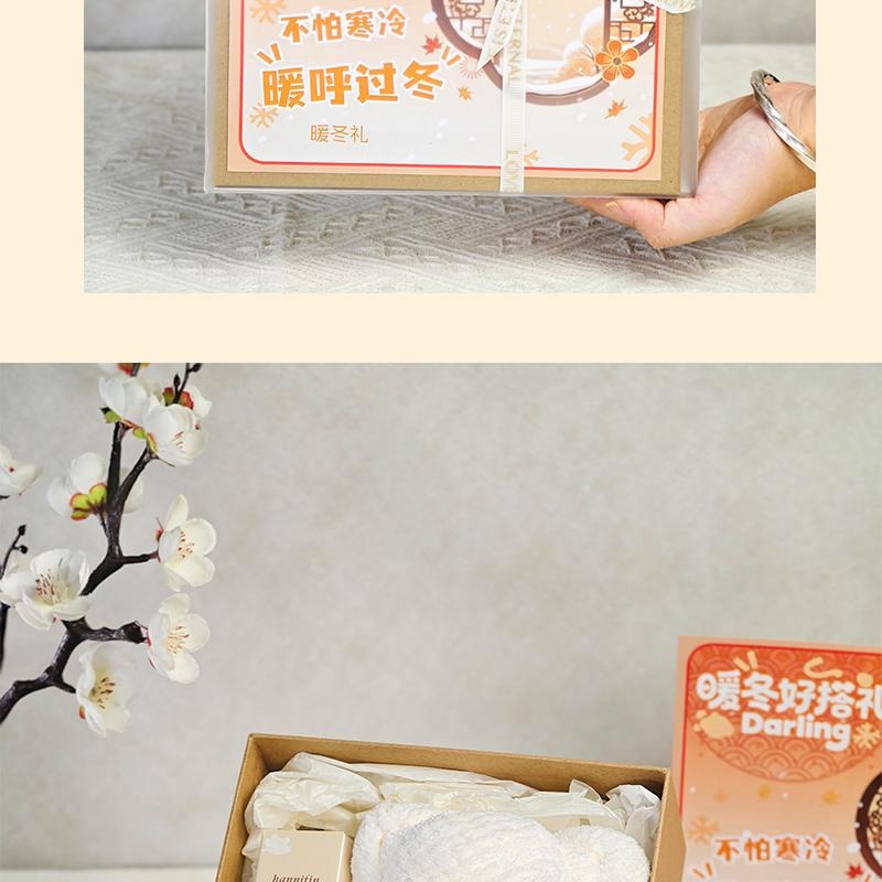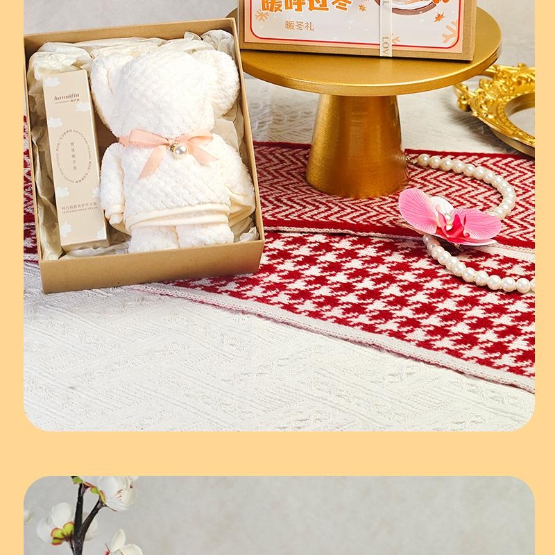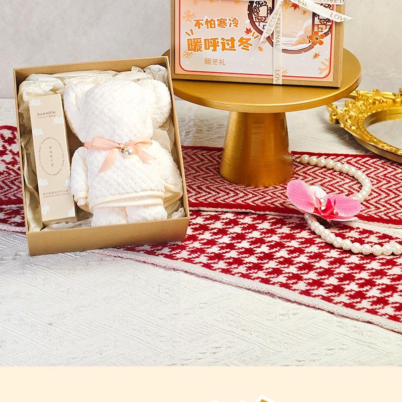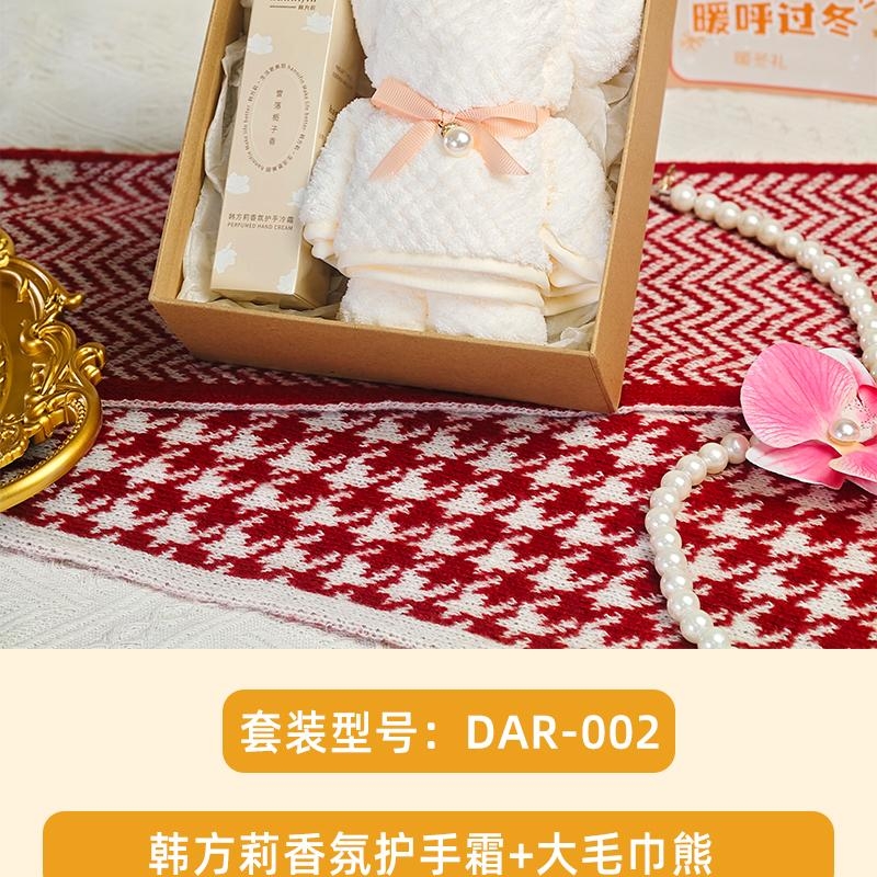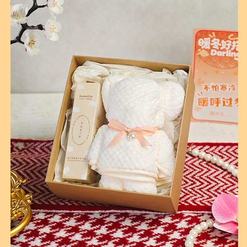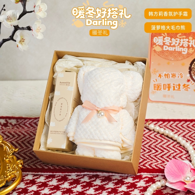 组合:大毛巾熊75*34cm、韩方莉香氛护手霜50克、牛皮绑绳礼盒+暖冬贺卡