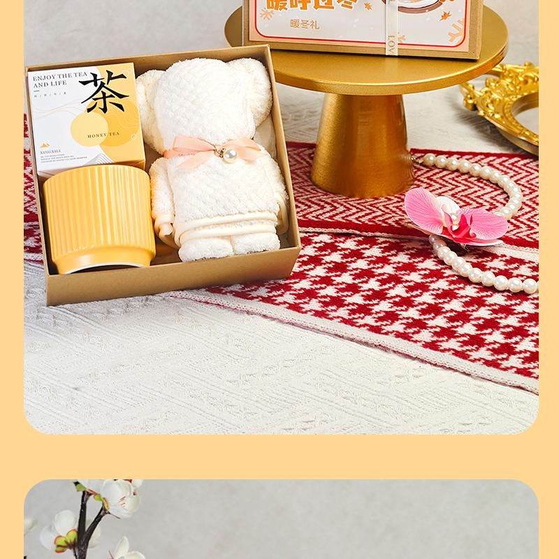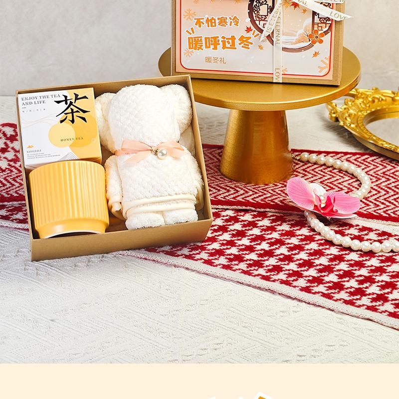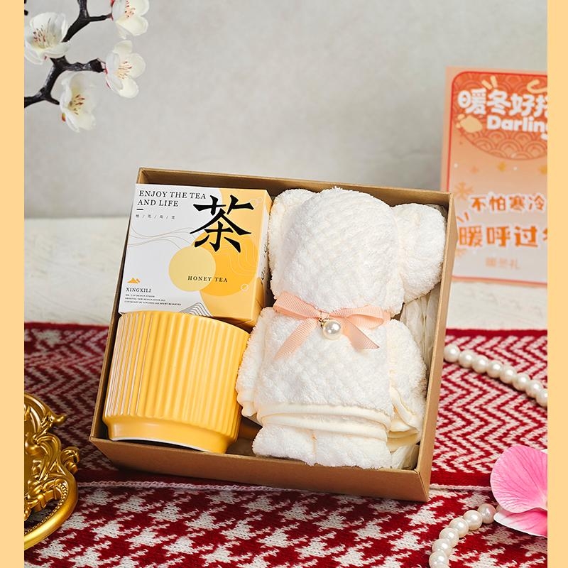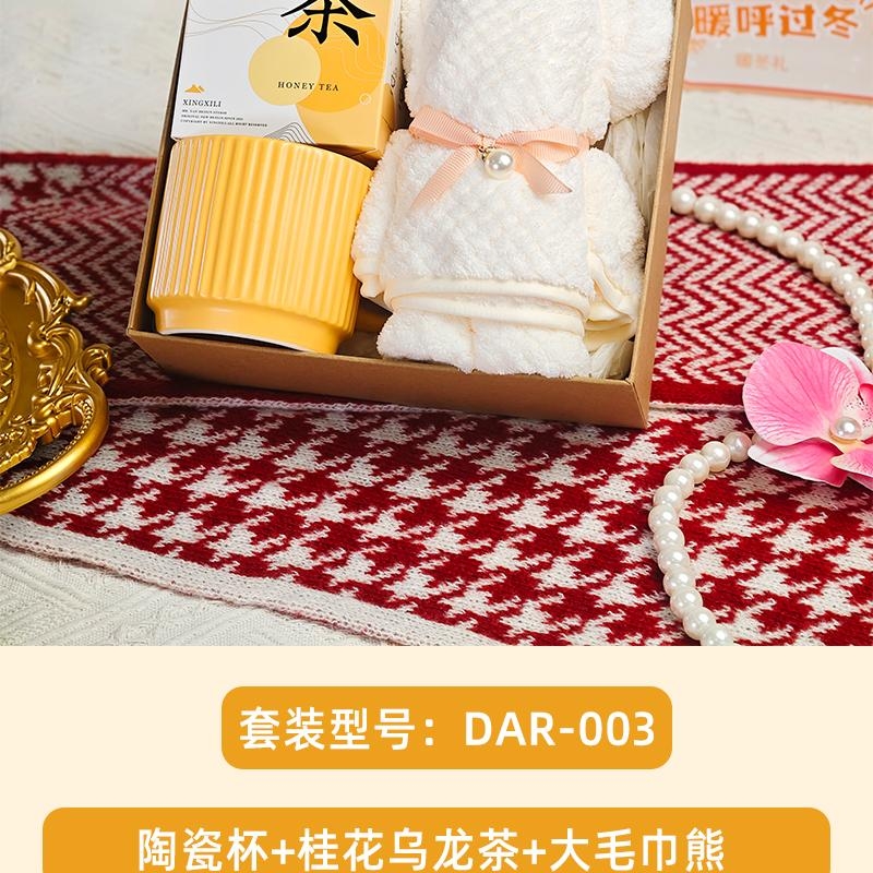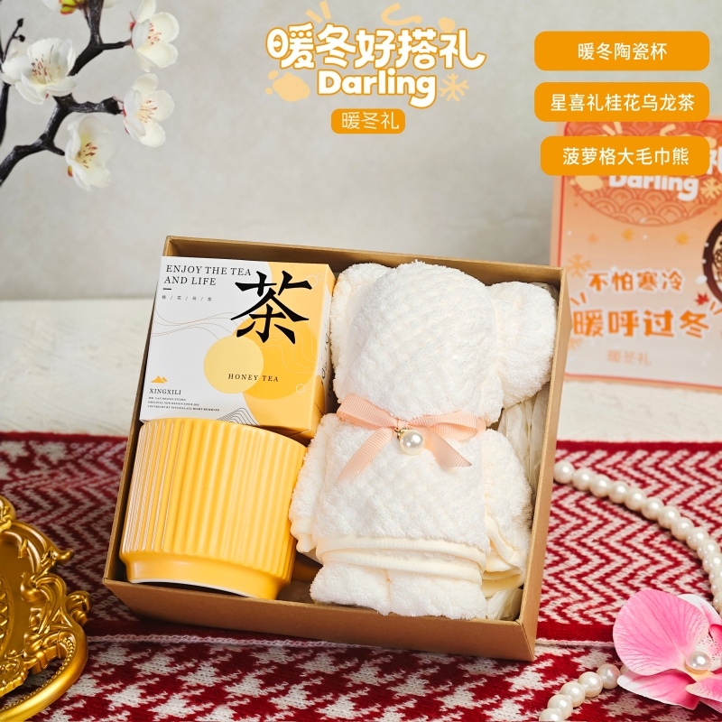 组合:陶瓷杯350ml、桂花乌龙茶3克*3袋、大毛巾熊75*34cm、牛皮绑绳礼盒+暖冬贺卡