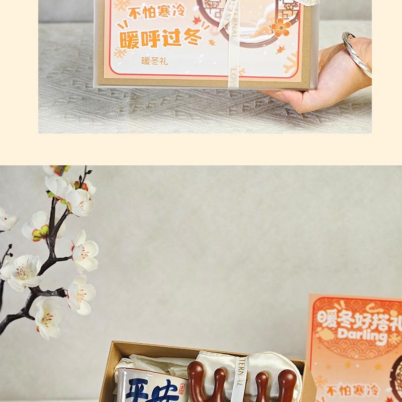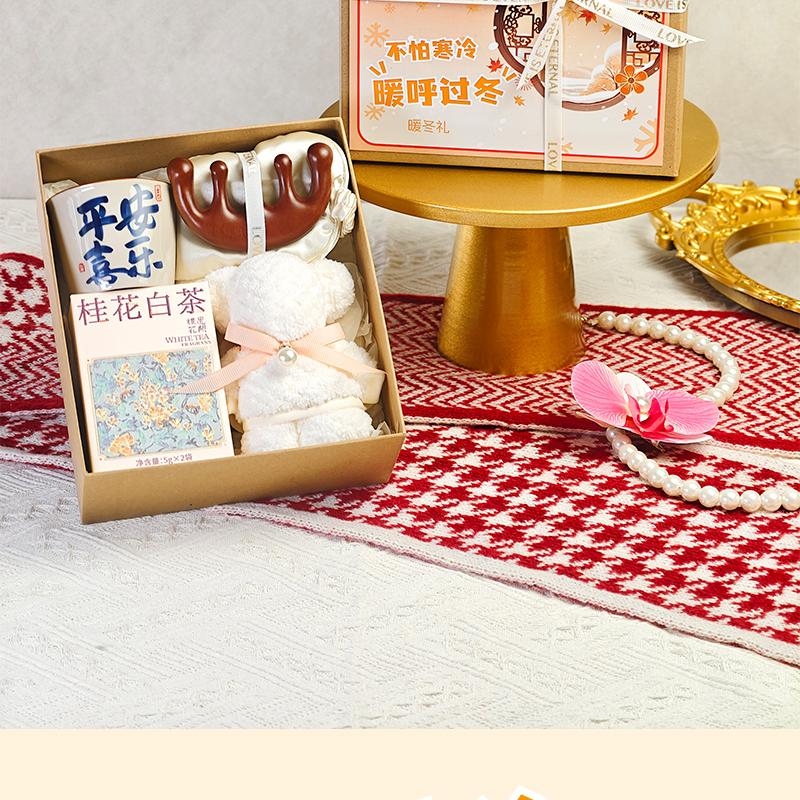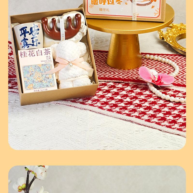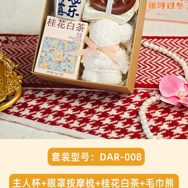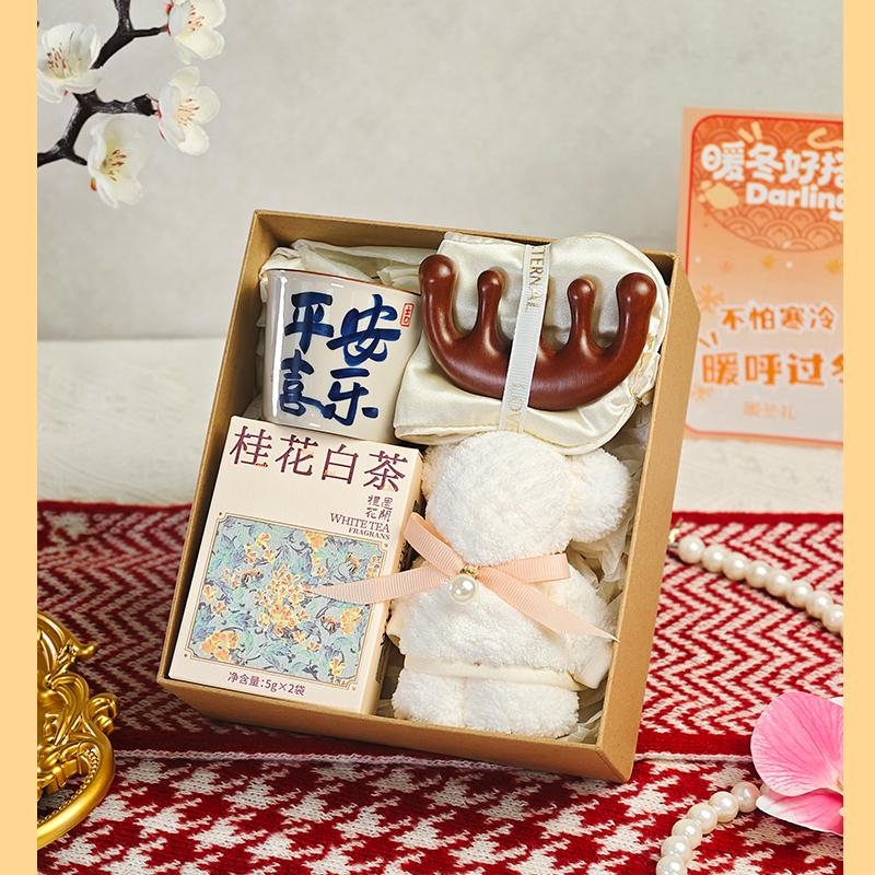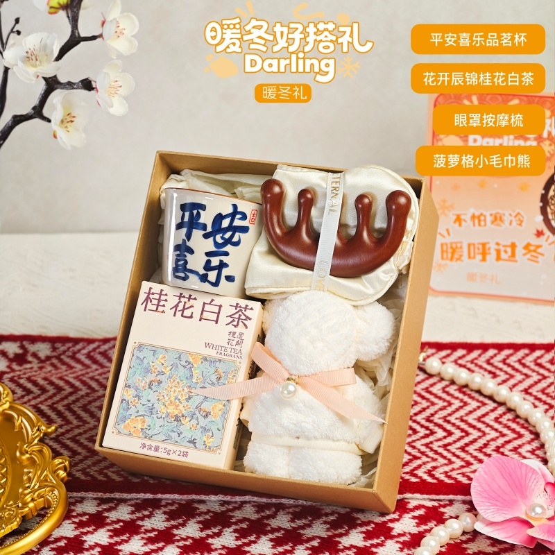 组合:喜乐主人杯、眼罩按摩梳、桂花白茶5克*2袋、小毛巾熊30*30cm、牛皮绑绳礼盒+暖冬贺卡