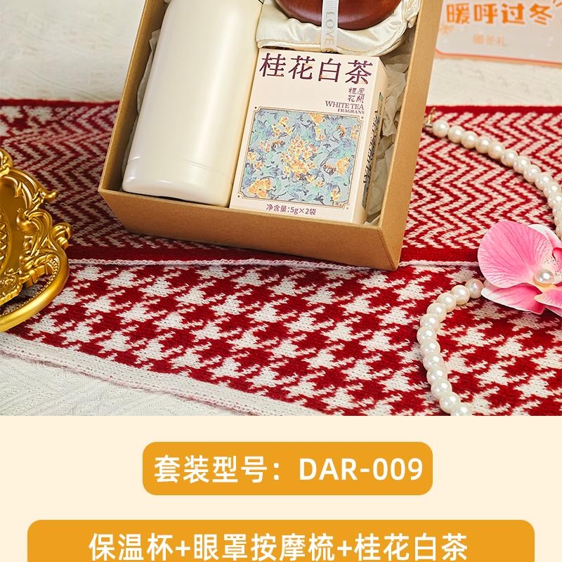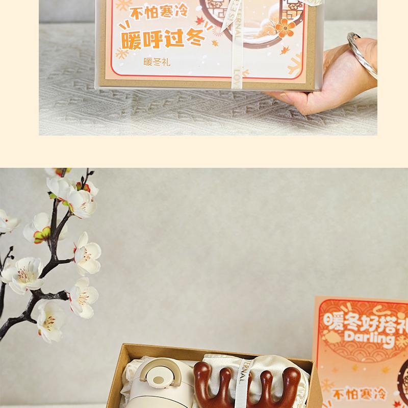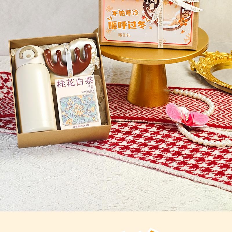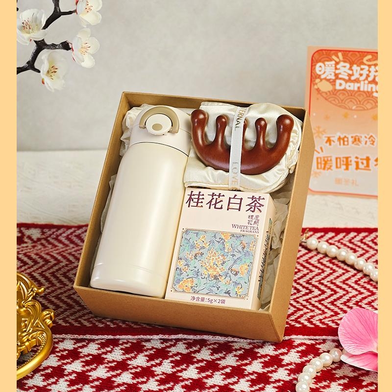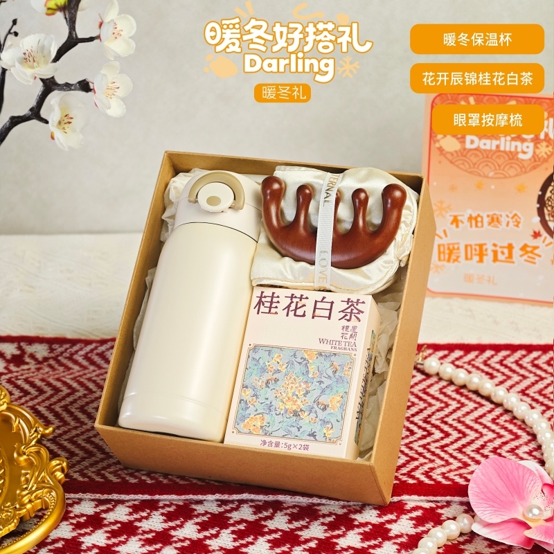 组合:保温杯350ml、眼罩按摩梳、桂花白茶5克*2袋、牛皮绑绳礼盒+暖冬贺卡