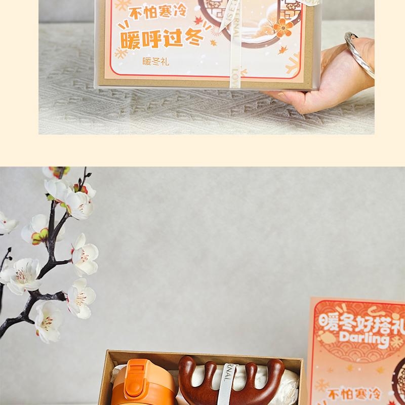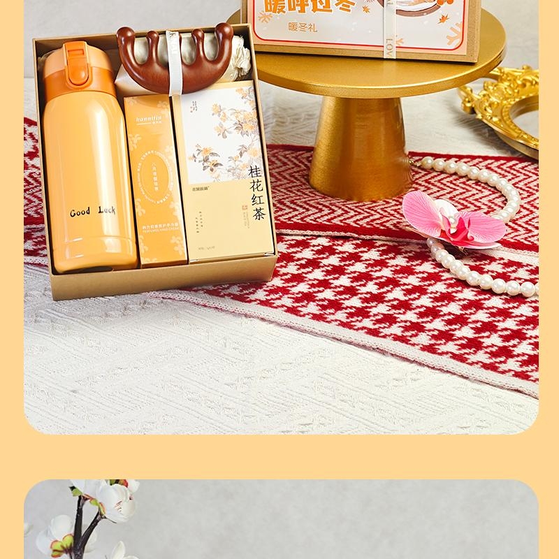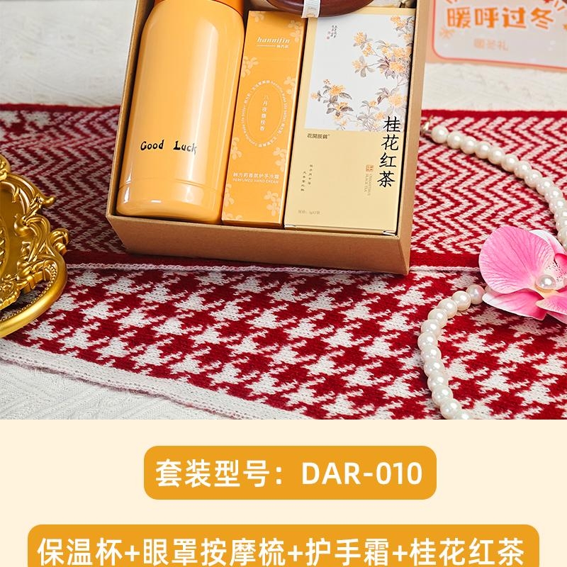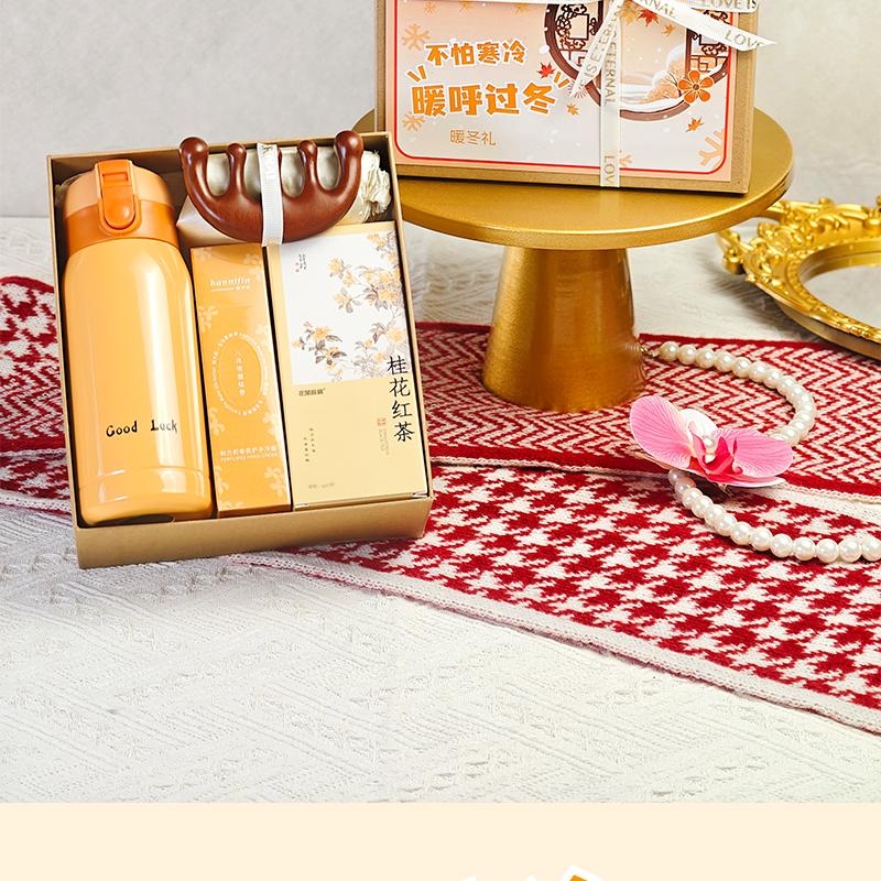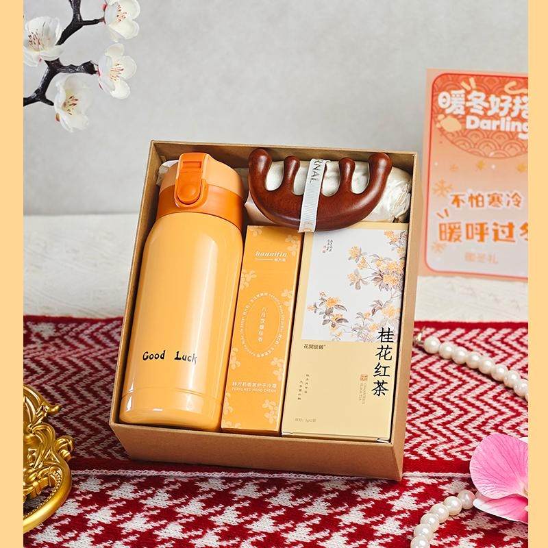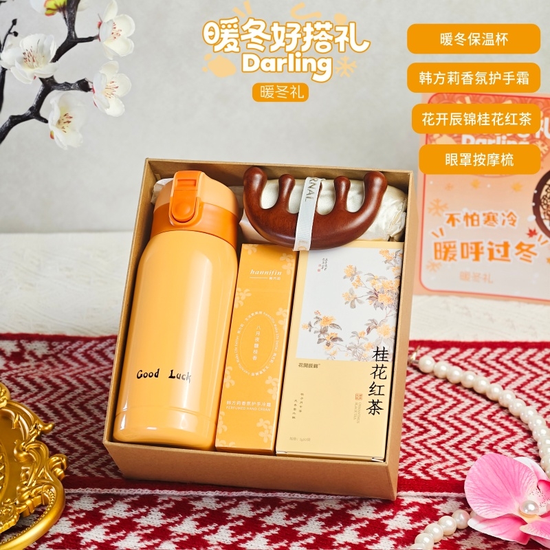 组合:保温杯350ml、眼罩按摩梳、大毛巾熊75*34cm、韩方莉香氛护手霜50克、花开辰锦桂花红茶5g*2袋、牛皮绑绳礼盒+暖冬贺卡