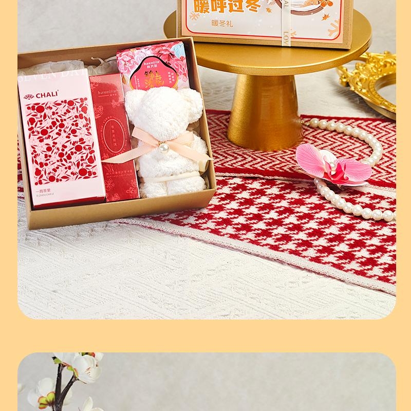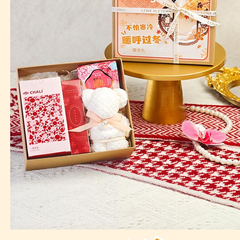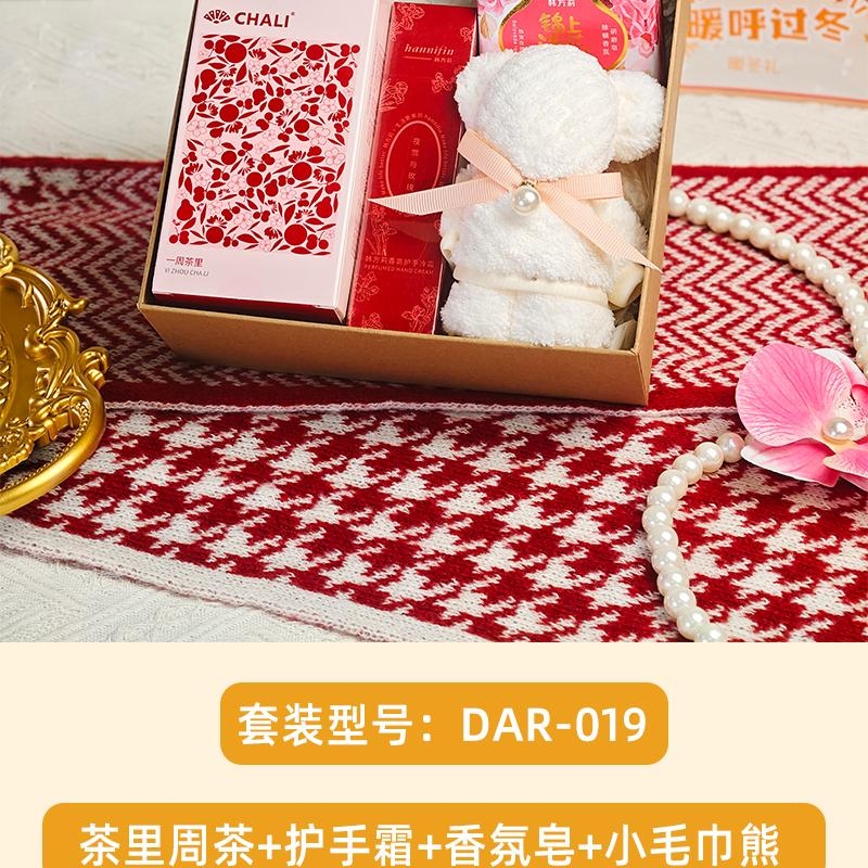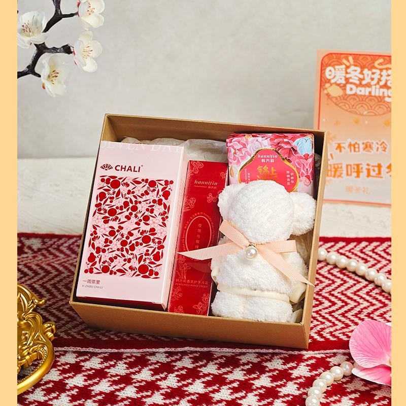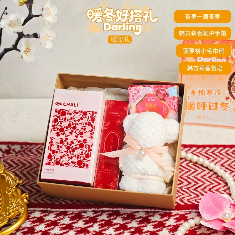 组合:小毛巾熊30*30cm、韩方莉香氛皂120克、韩方莉香氛护手霜50克、茶里国风周茶2克*7袋(七种口味)、牛皮绑绳礼盒+暖冬贺卡