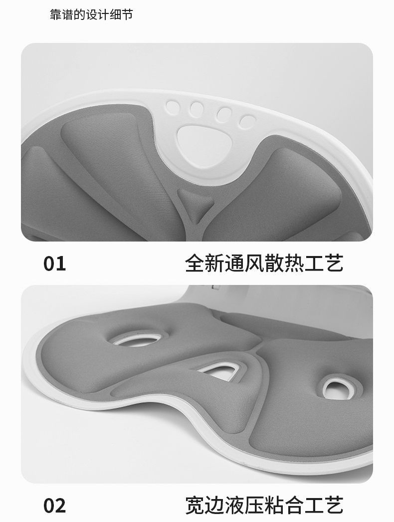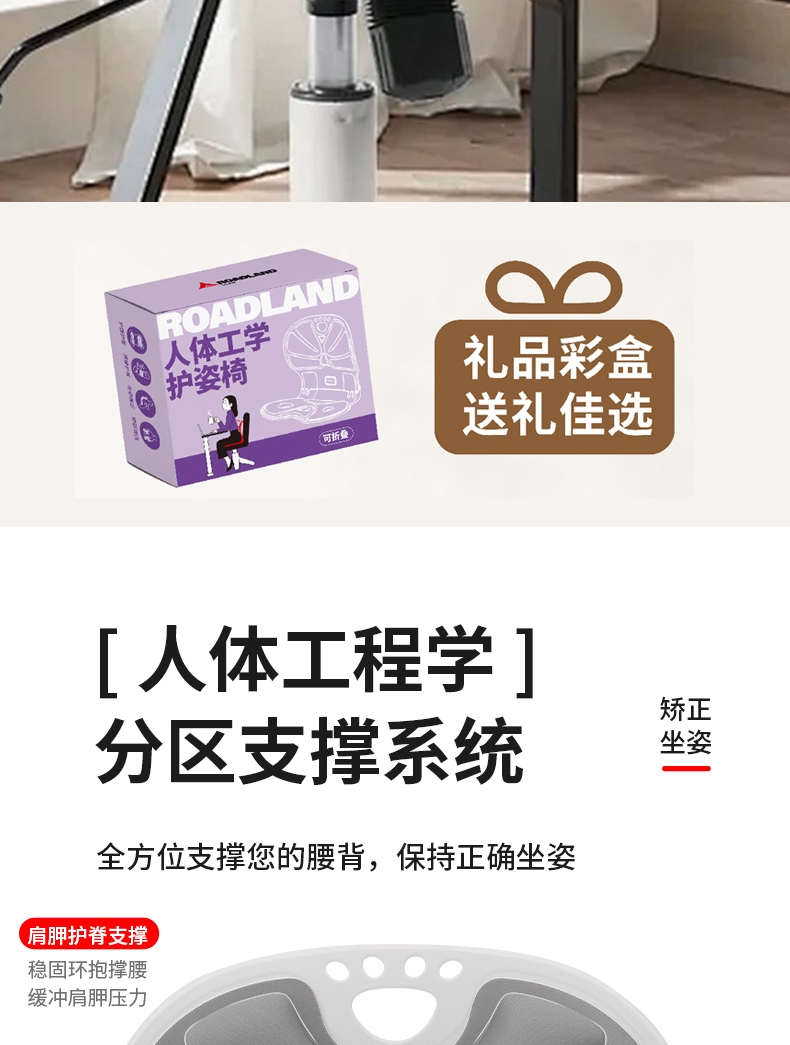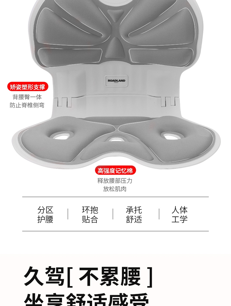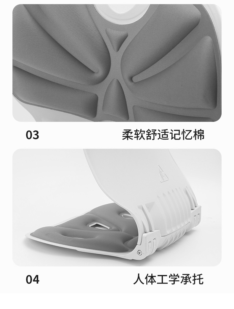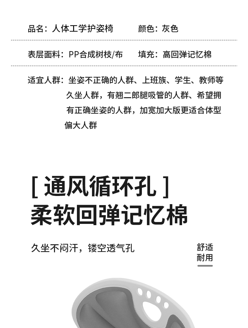 人体工程学分区支撑系统 全方位支撑您的腰背,保持正;可折叠设计 轻量便携出门;通风循环孔 柔软回弹记忆棉