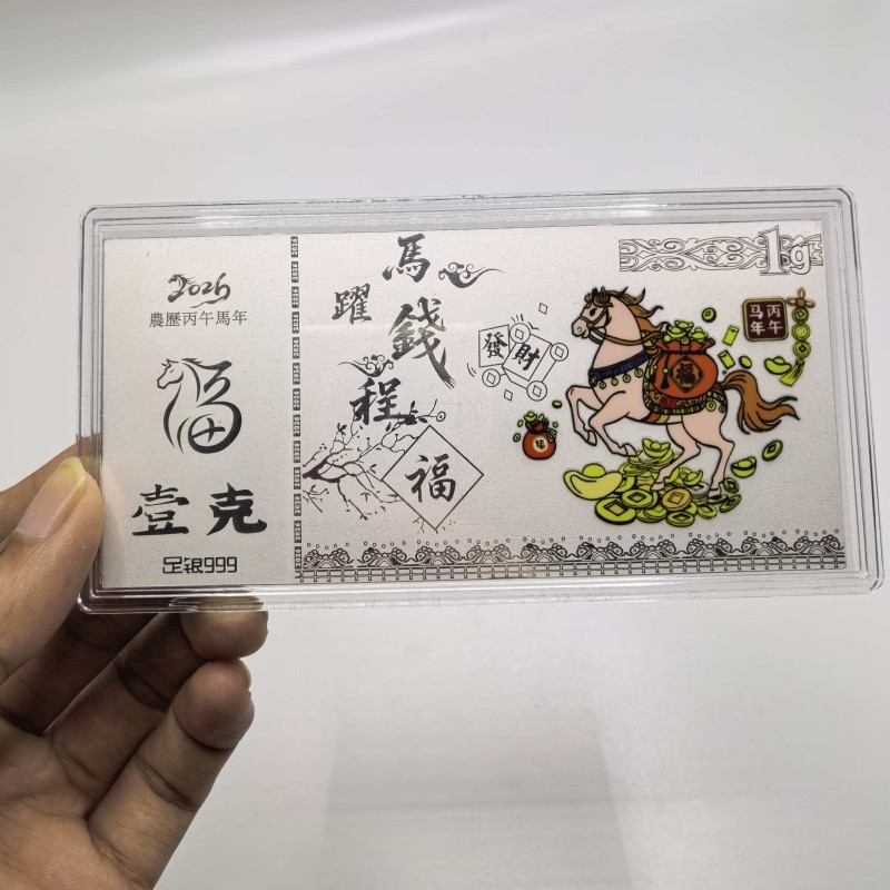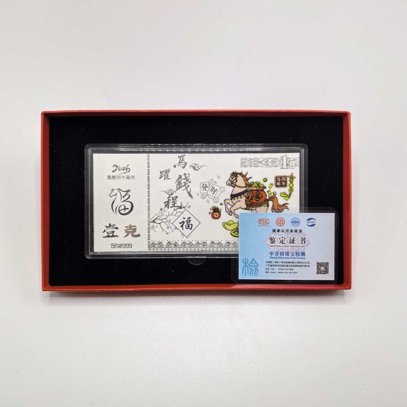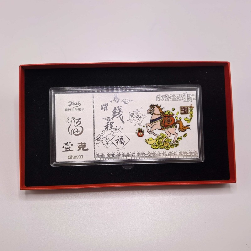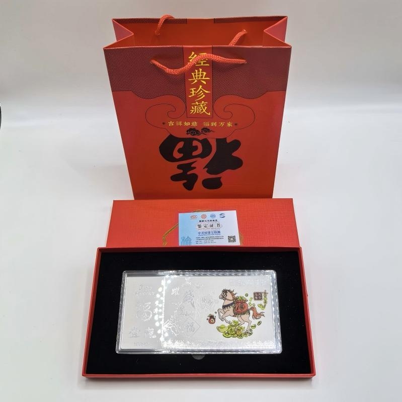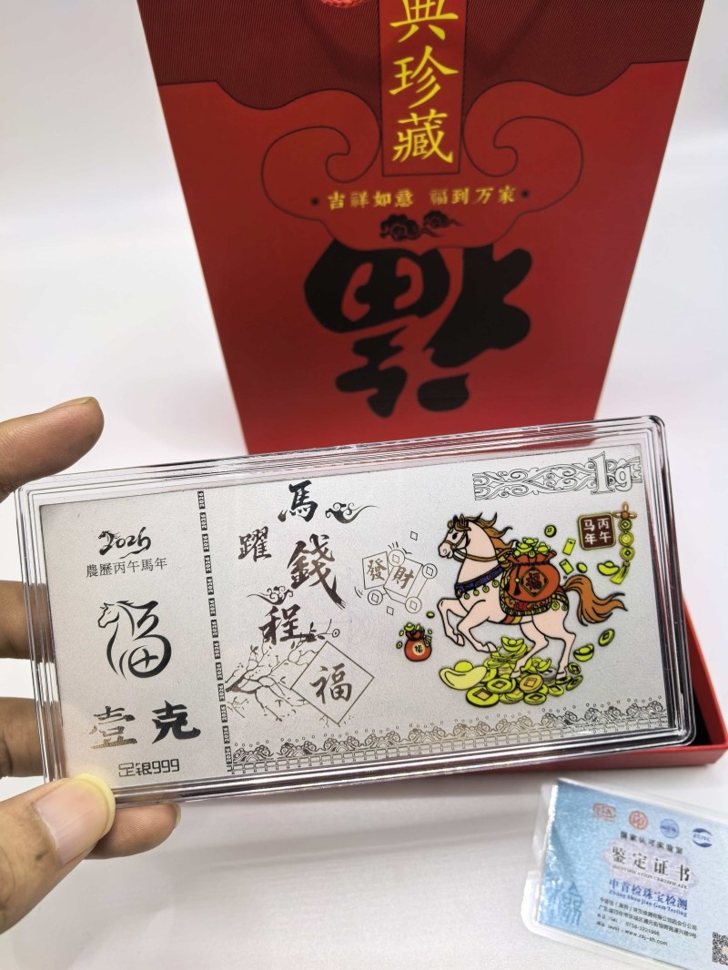 以999足银匠心铸造却寓意万千!奔腾骏马跃然钞上;伴祥云铜钱与"福"字环绕,寓意"跃马钱程,财源广发;红盒金袋装载吉祥,是新春赠礼、收藏传家的祥瑞之选;经典珍藏,福到万家!