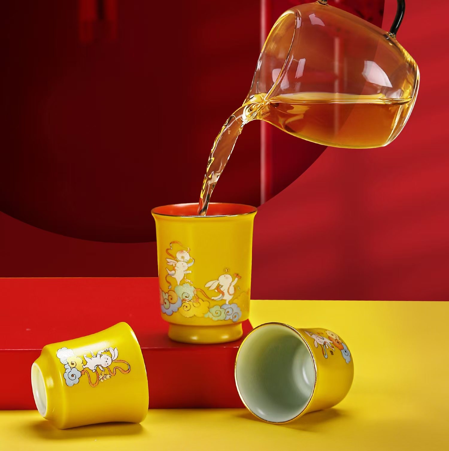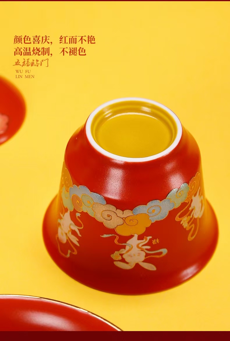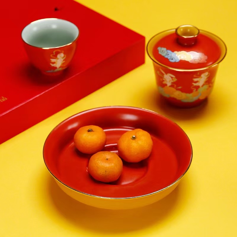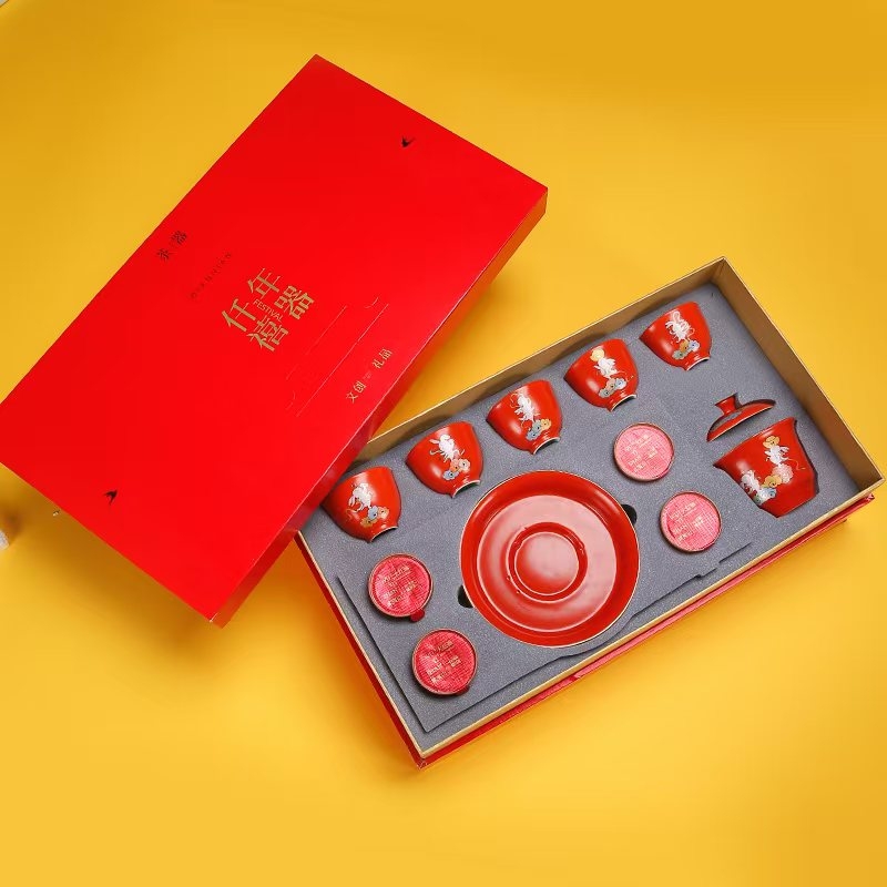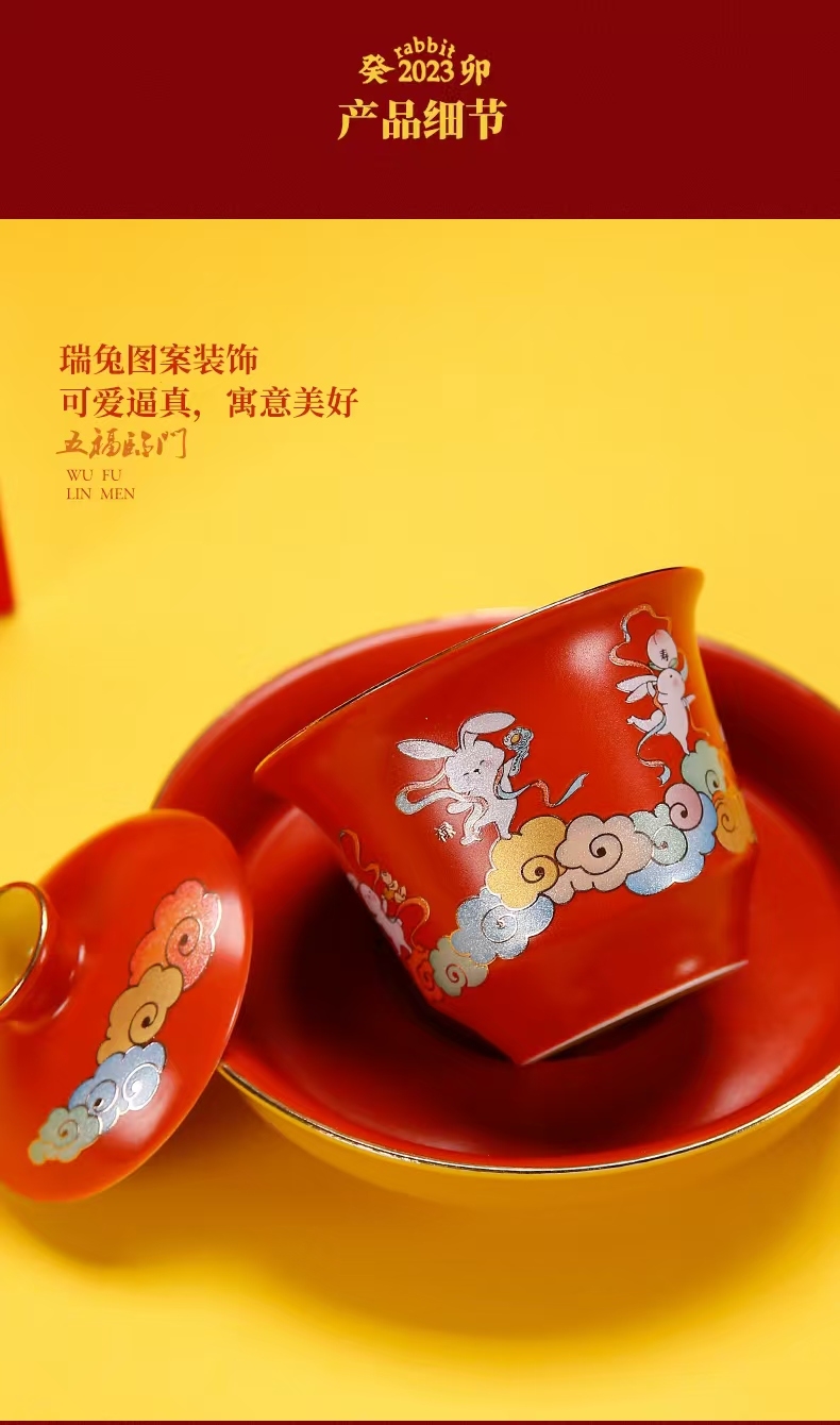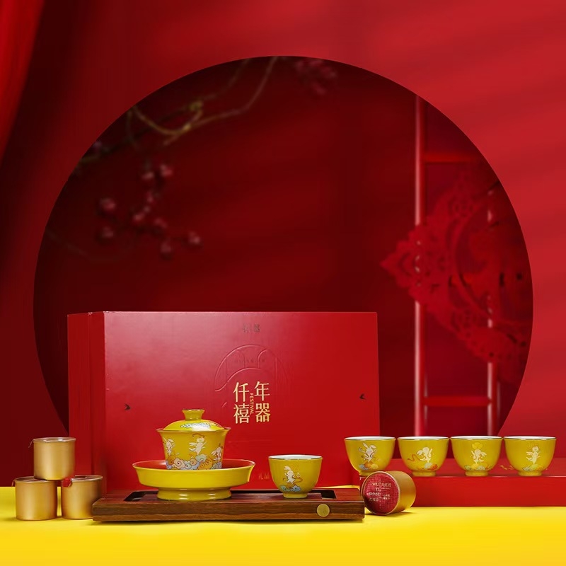开门红喜庆色彩,仟禧年器。年底专用高档商务礼品;独家专利技术新品,无片汝窑,加入稀土,瓷身油质感强;堆金花纸两次烧成画面,精致高雅。搭配4罐小罐茶,