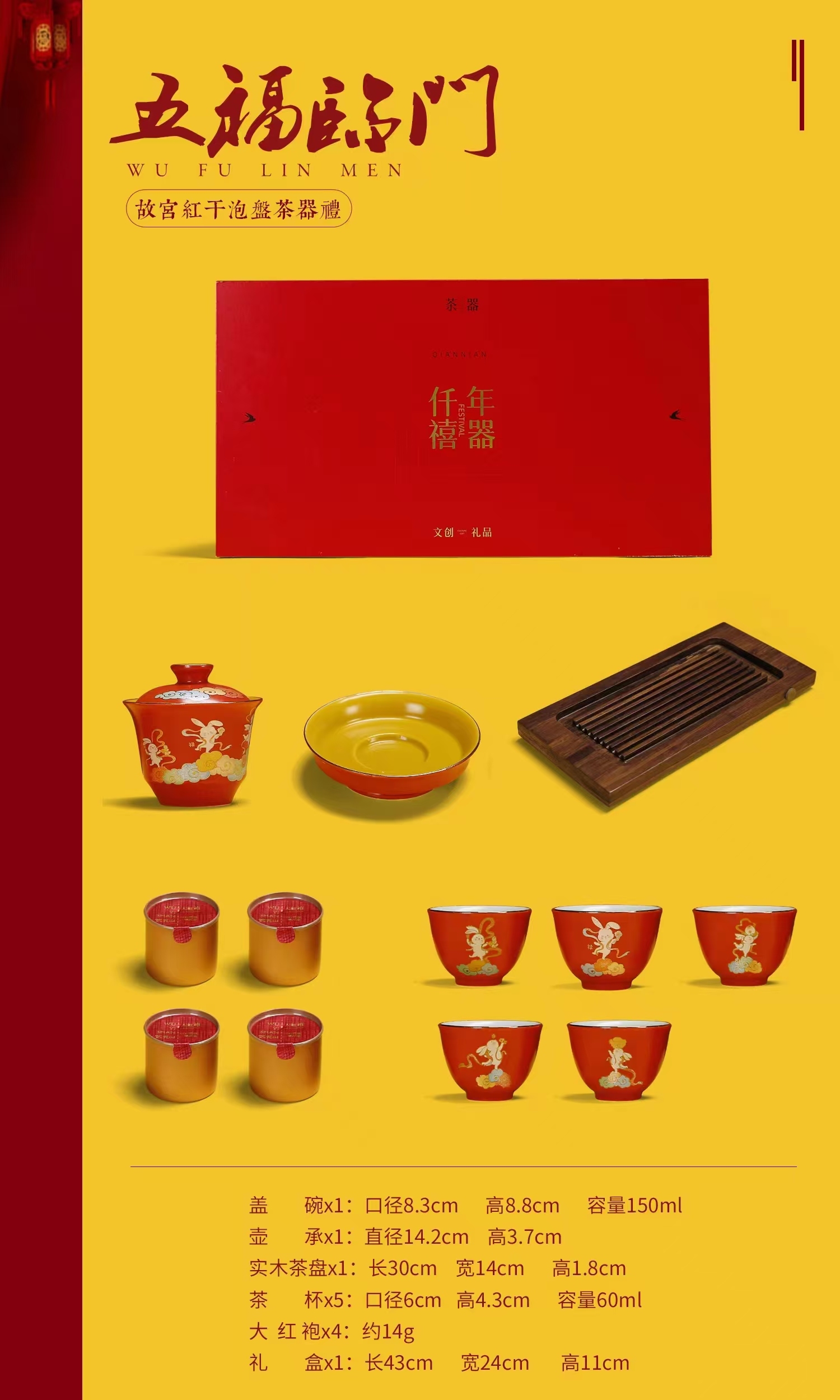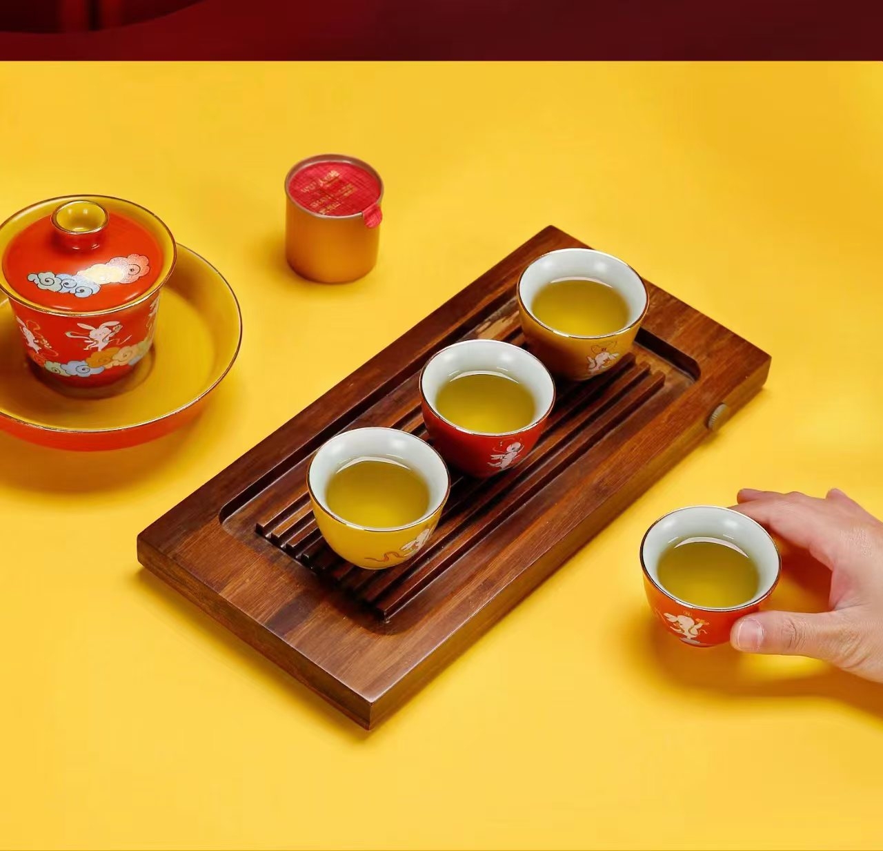 配置:1盖碗 5杯 1壶承 1木茶盘 4小罐茶 1礼盒手提袋