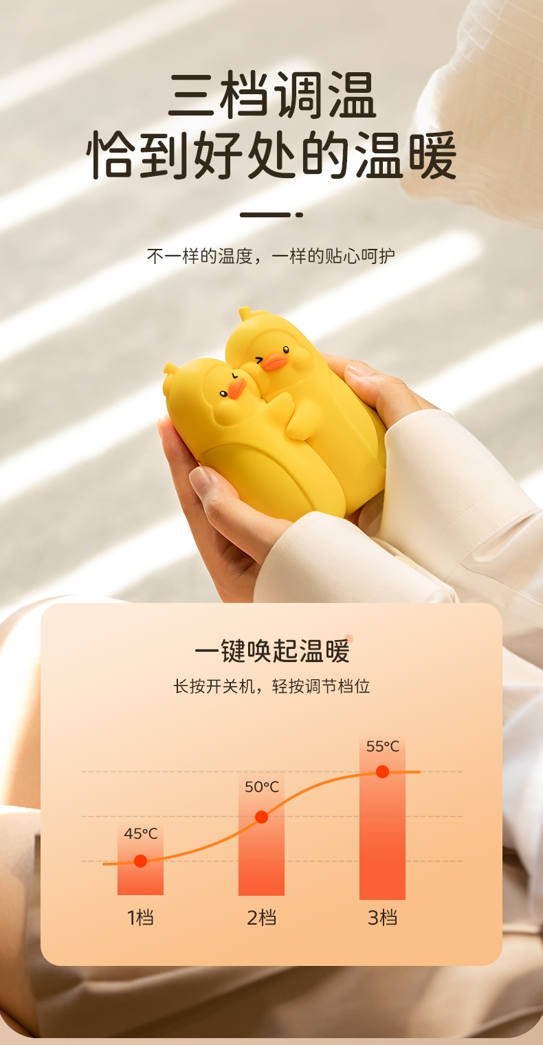 三档调节、45/50/55度可调;智能控温、6000mAh、可爱治愈;过充保护、防火材质、安全防爆