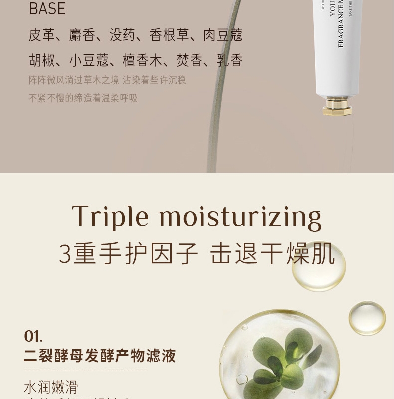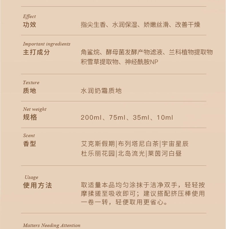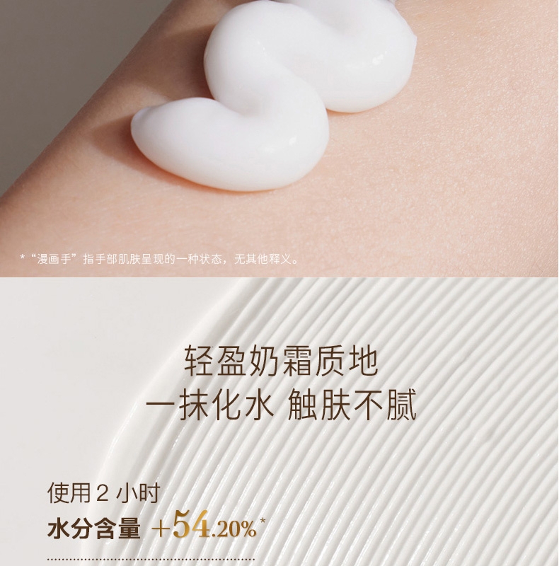 水润奶霜质地莹润保湿渗透清爽保湿;多种植萃护肤减轻肌肤干燥紧绷感;特调香氛指尖淡雅留香