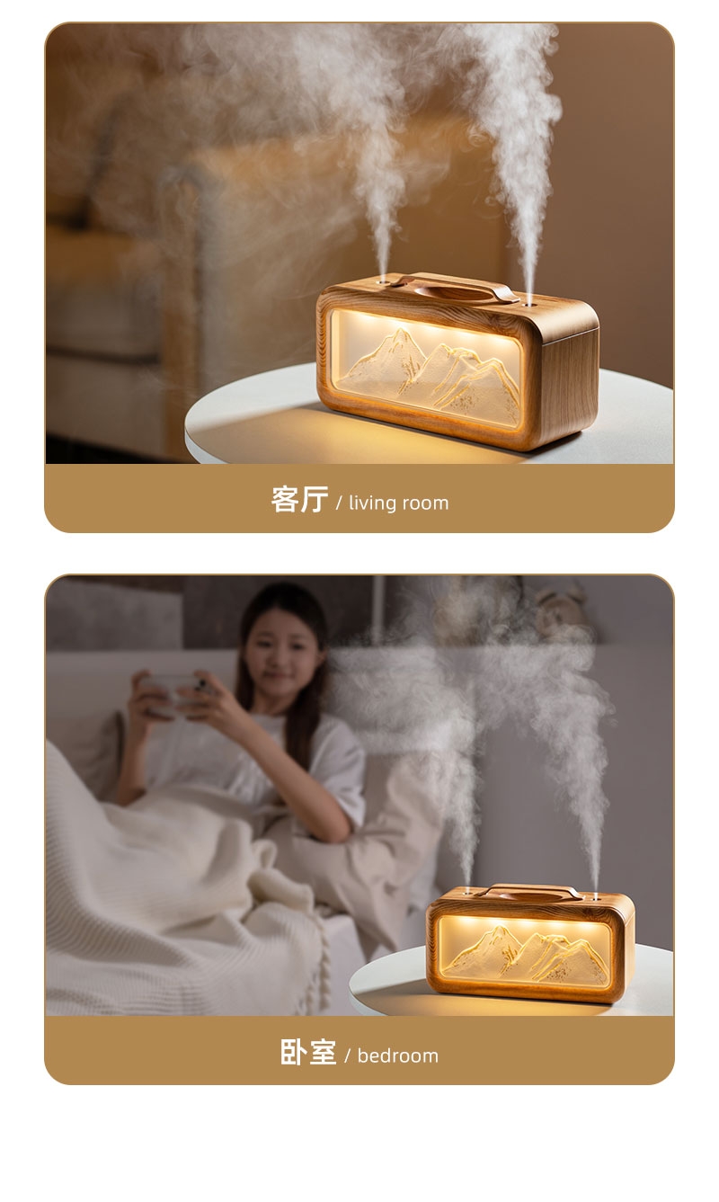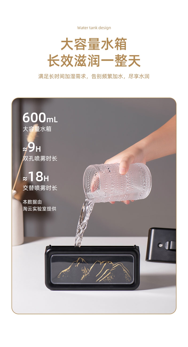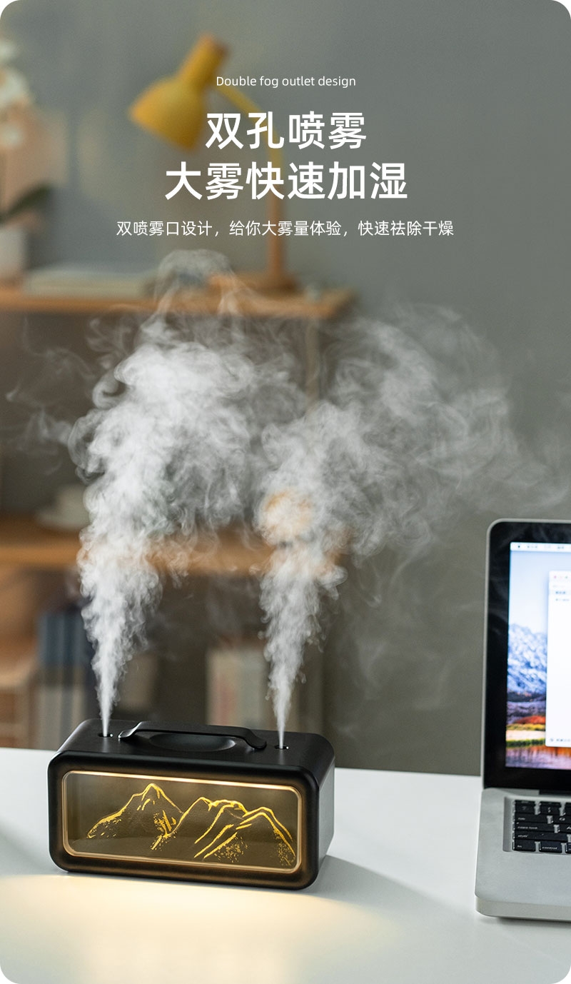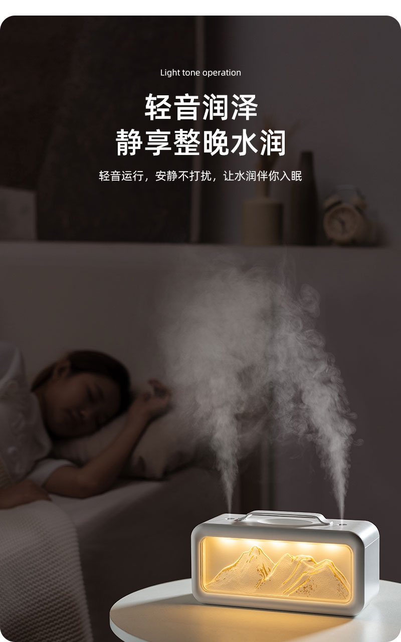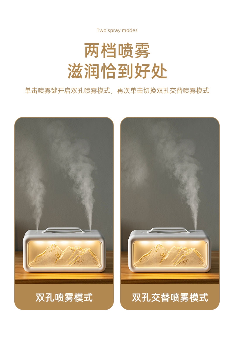 高颜值外观、双喷雾口;便携小巧、600ML大容量;细腻喷雾加湿、温暖小夜灯
