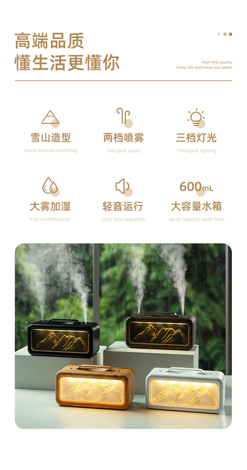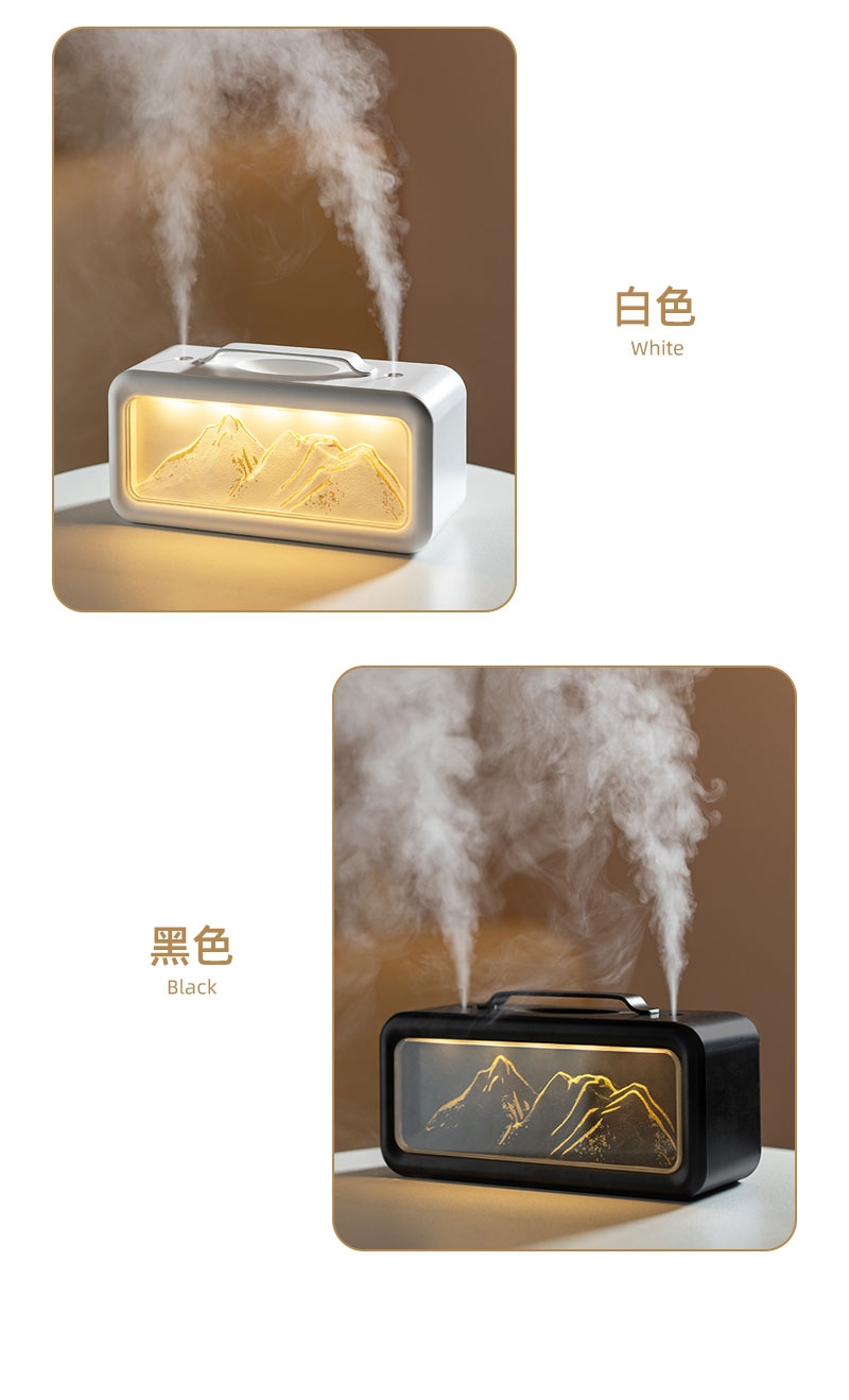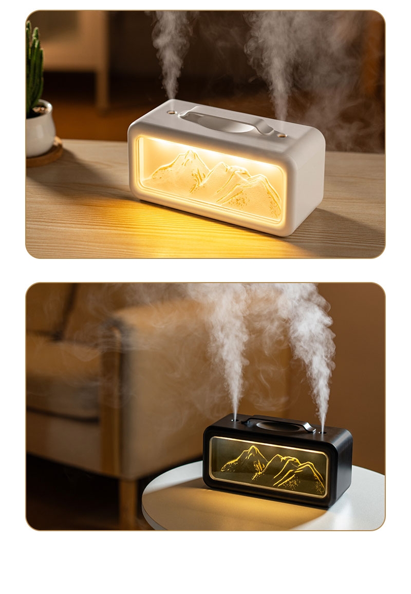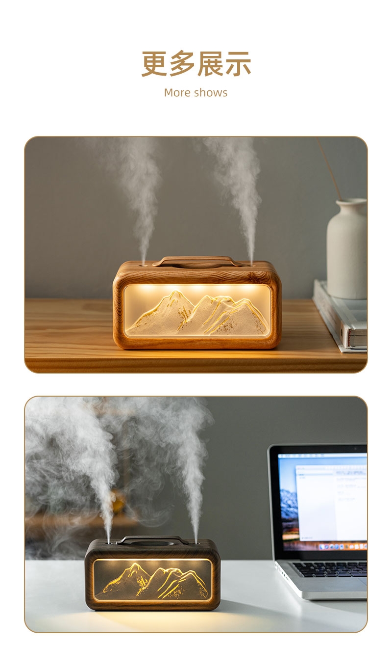 高颜值外观、双喷雾口;便携小巧、600ML大容量;细腻喷雾加湿、温暖小夜灯