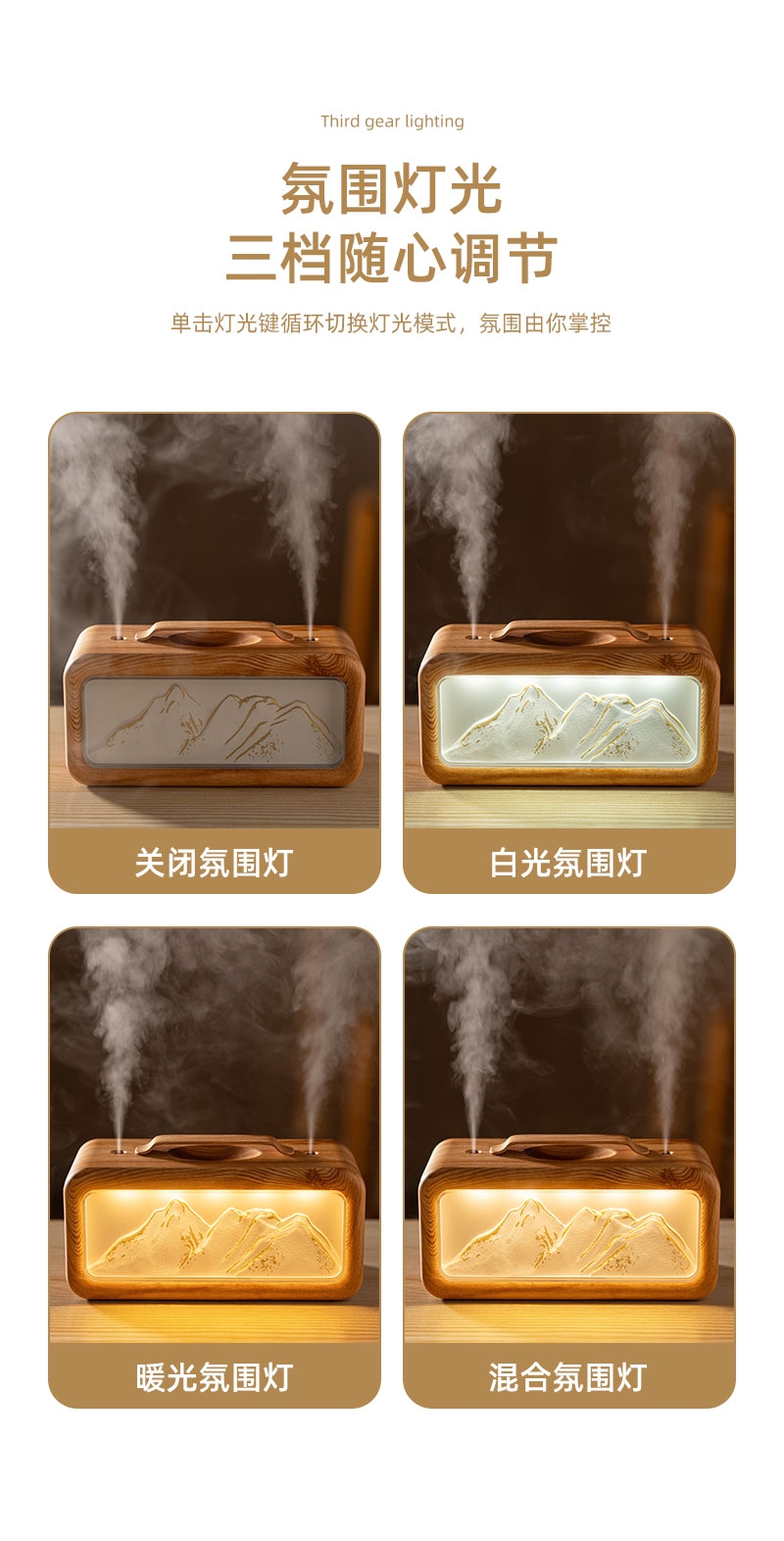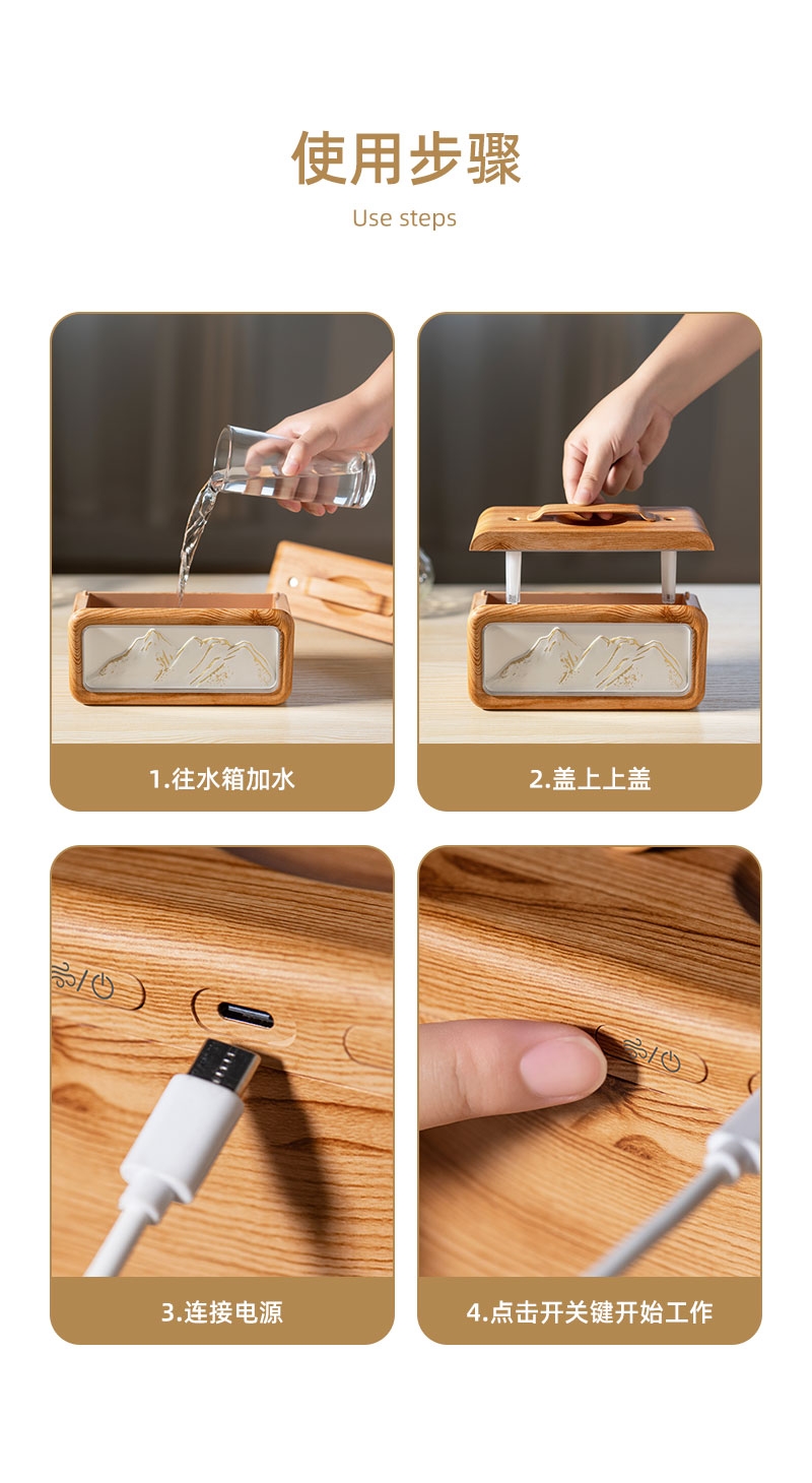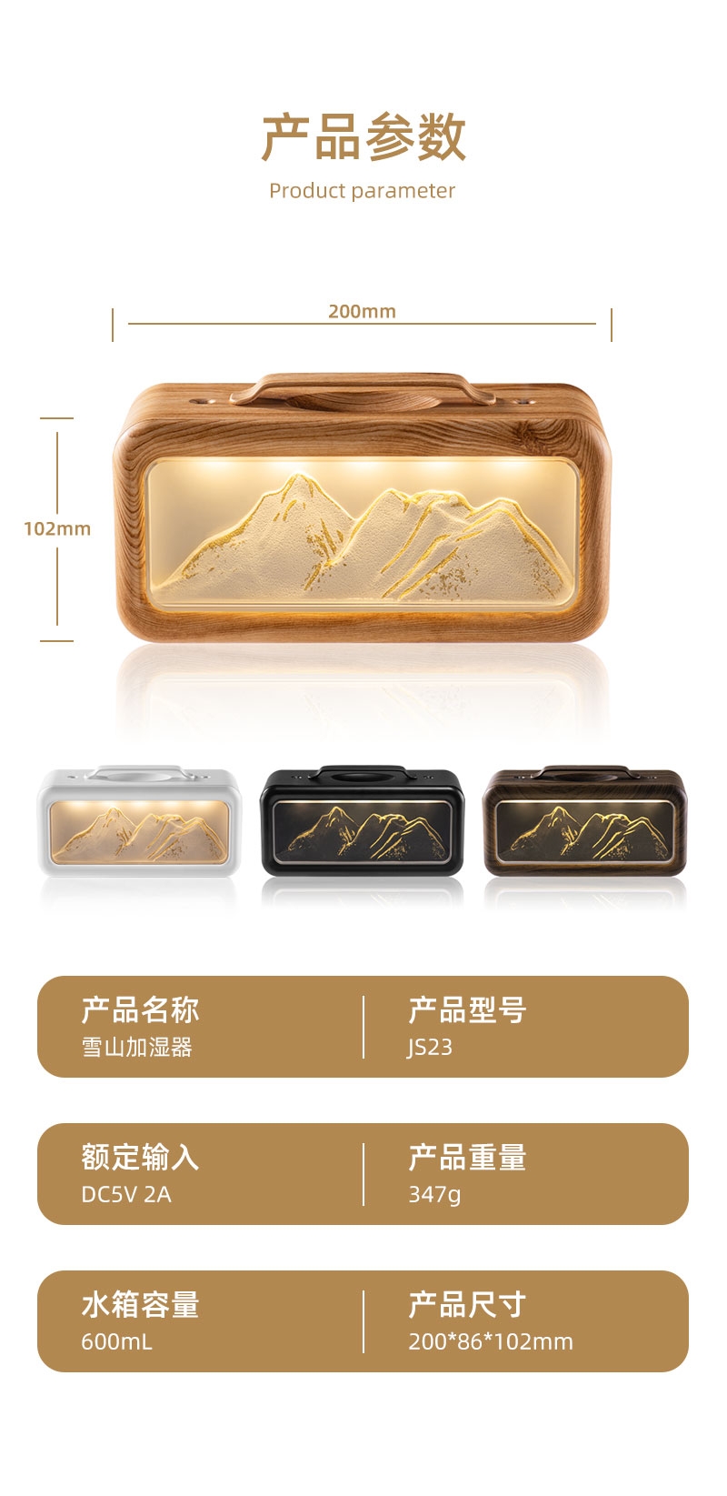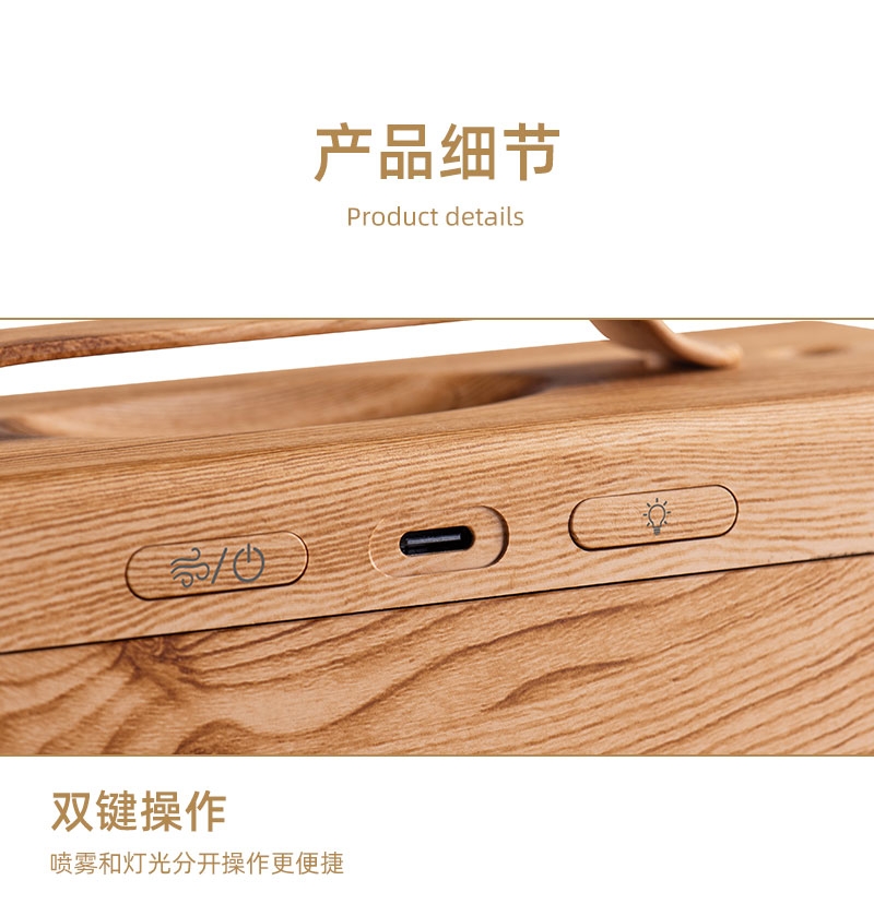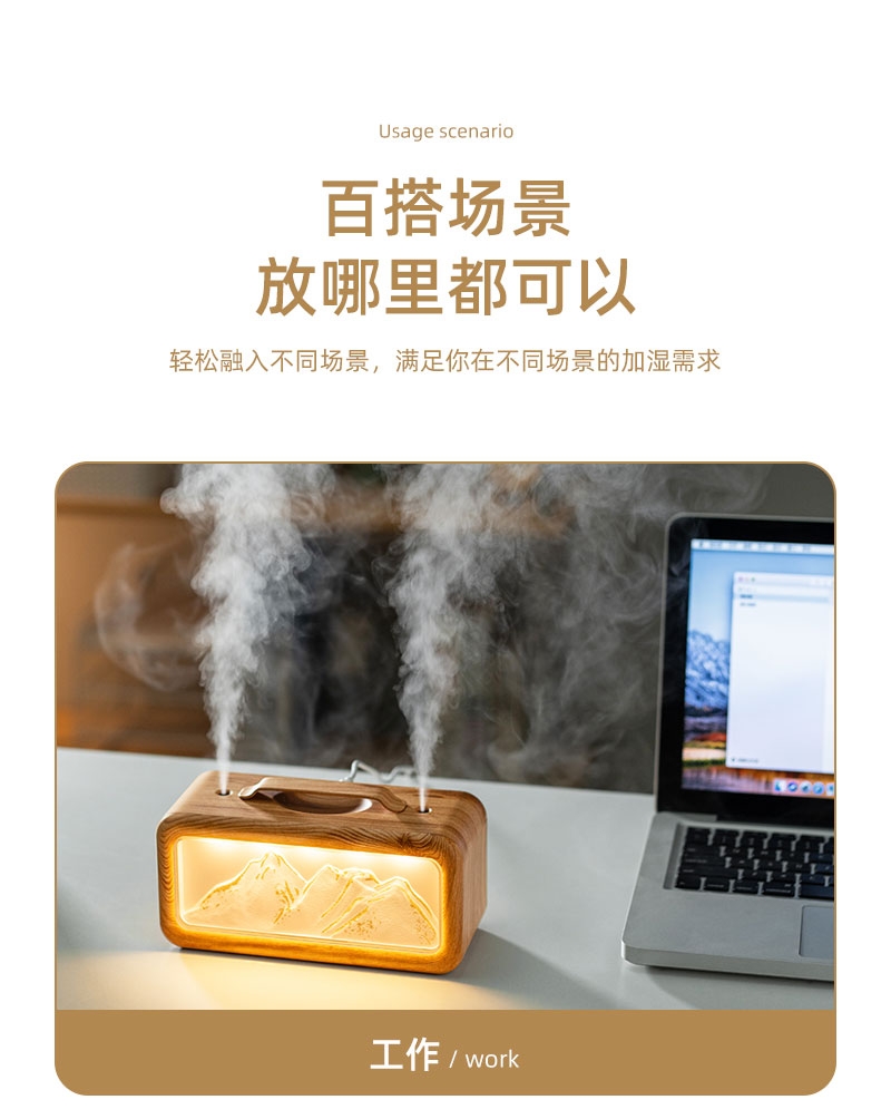 高颜值外观、双喷雾口;便携小巧、600ML大容量;细腻喷雾加湿、温暖小夜灯