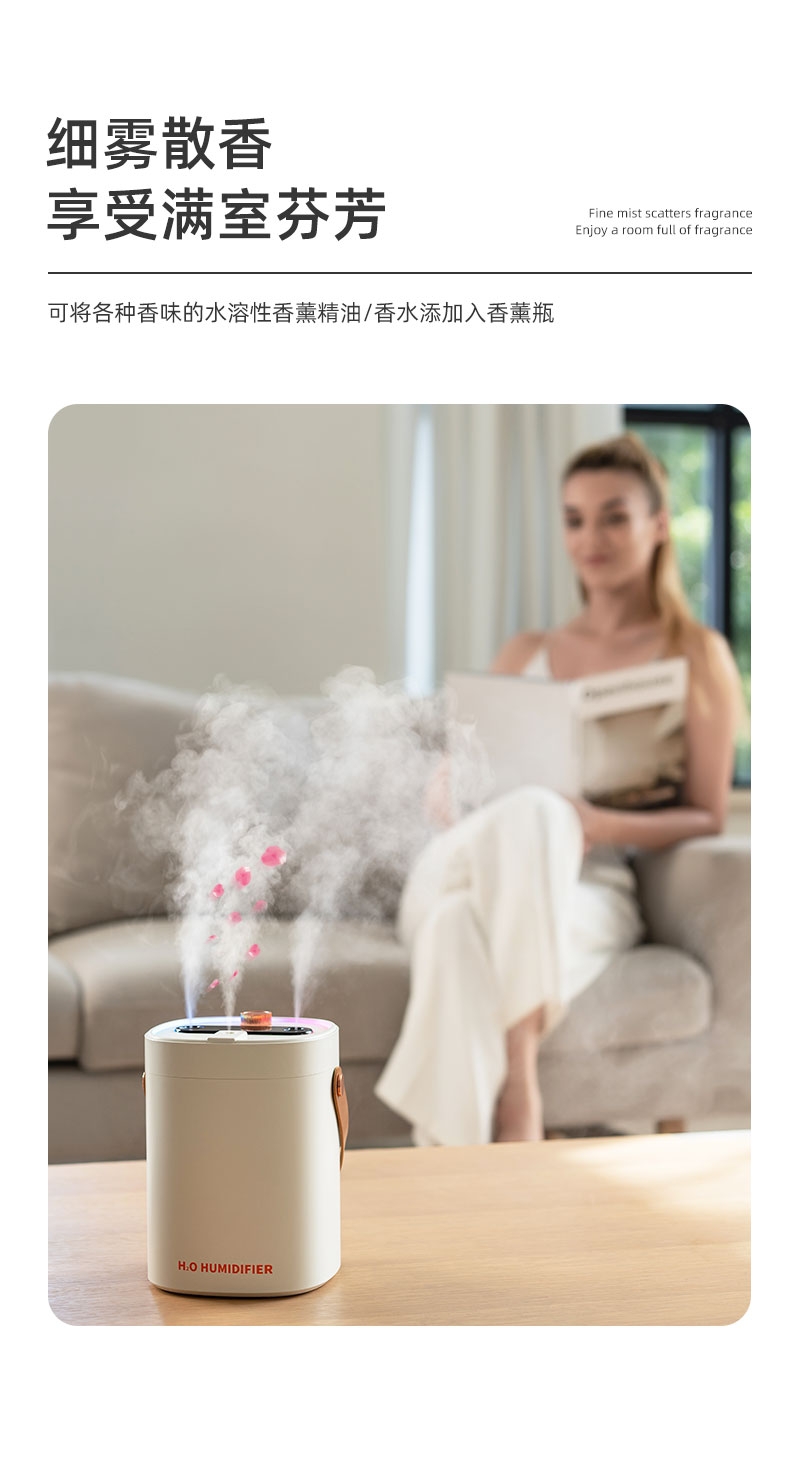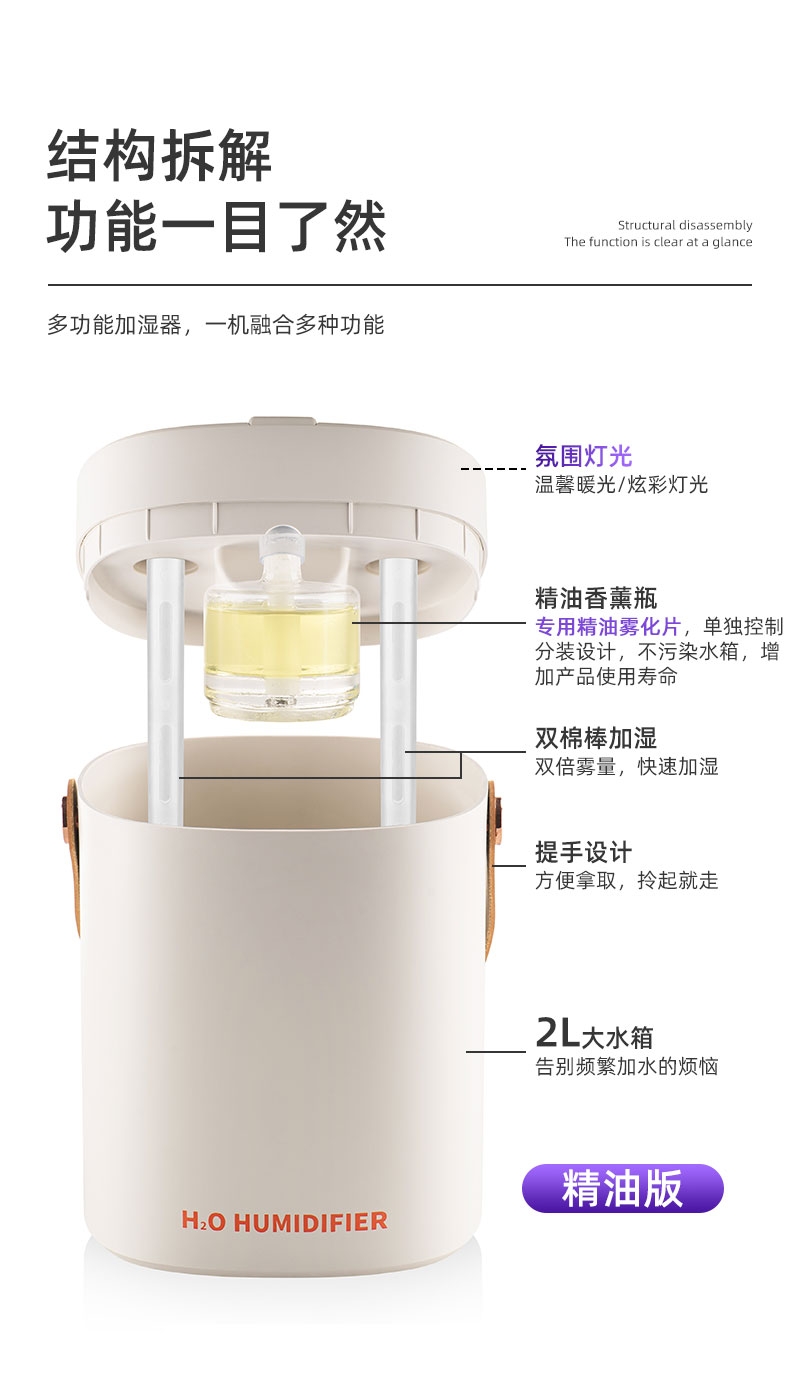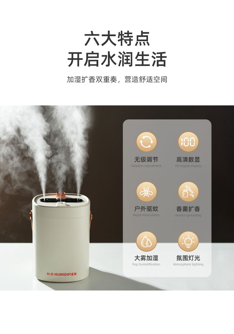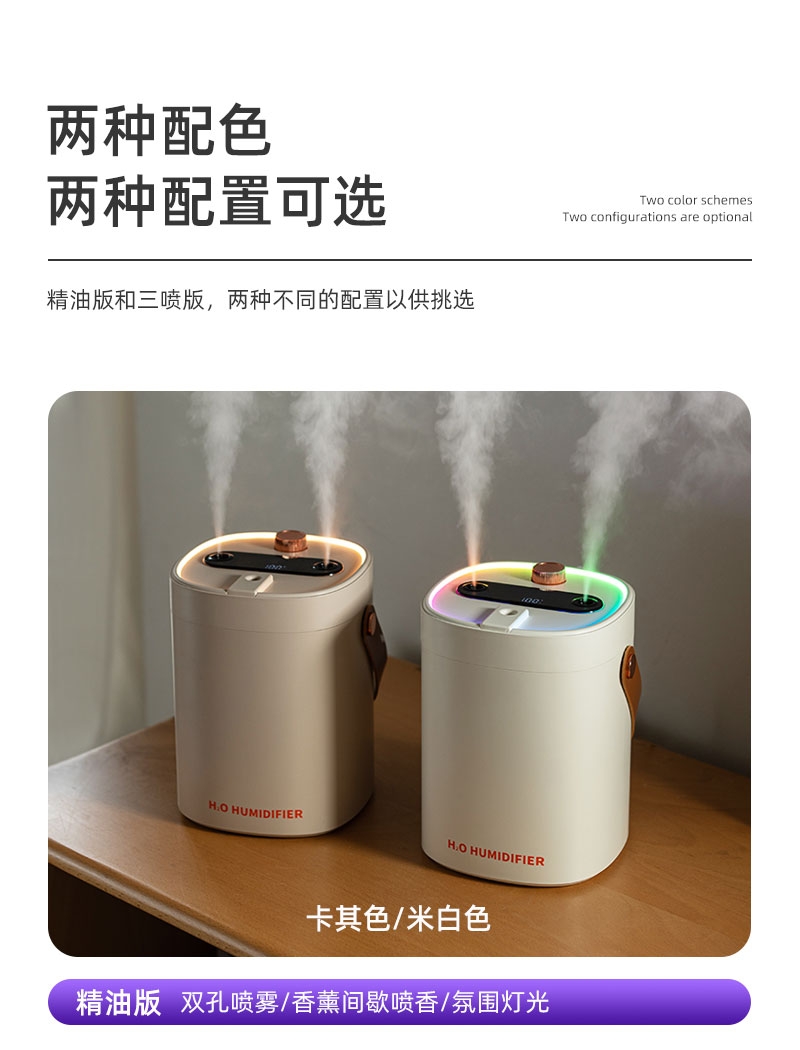 简约高档外观、三喷雾口;七彩小夜灯可调、2000ML大容量;喷香款有独立口可使用精油或者驱蚊液等