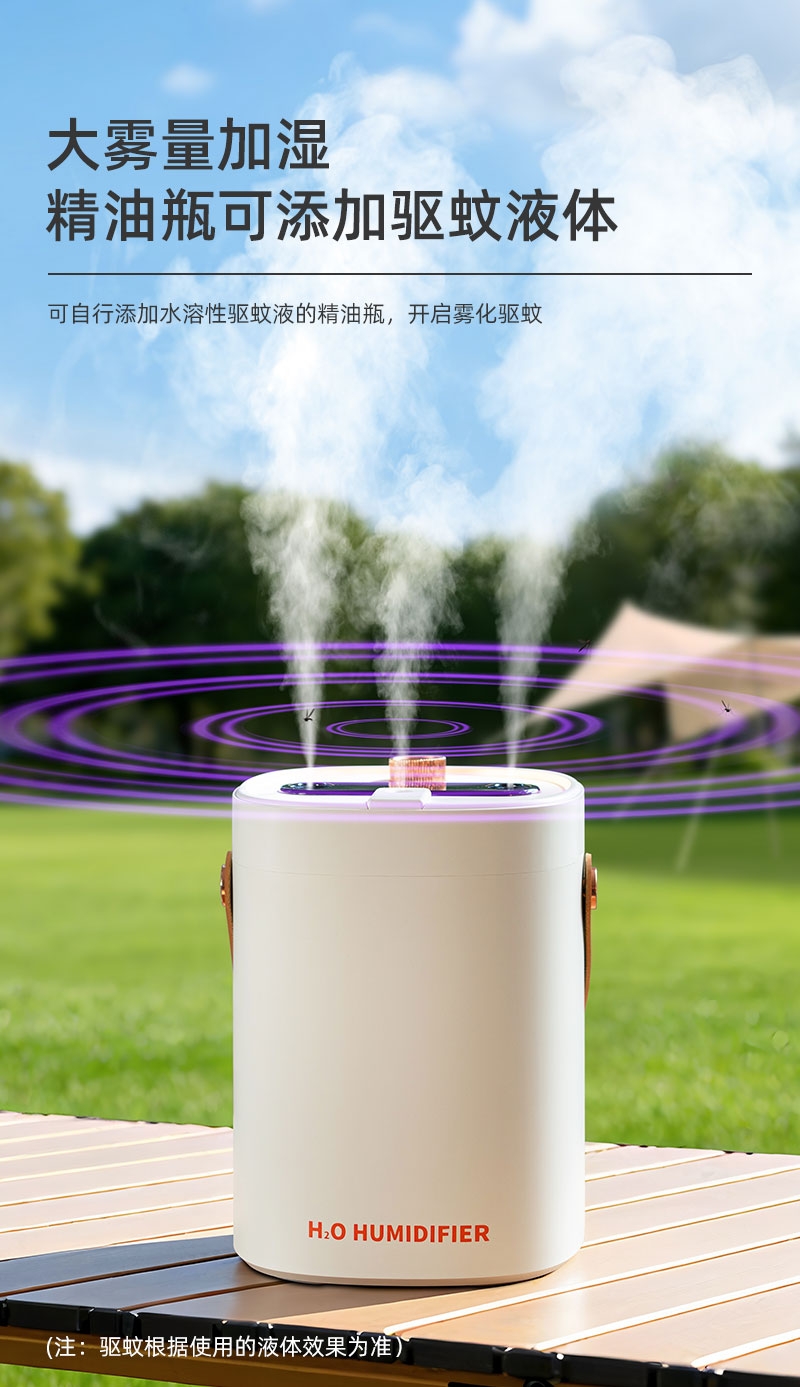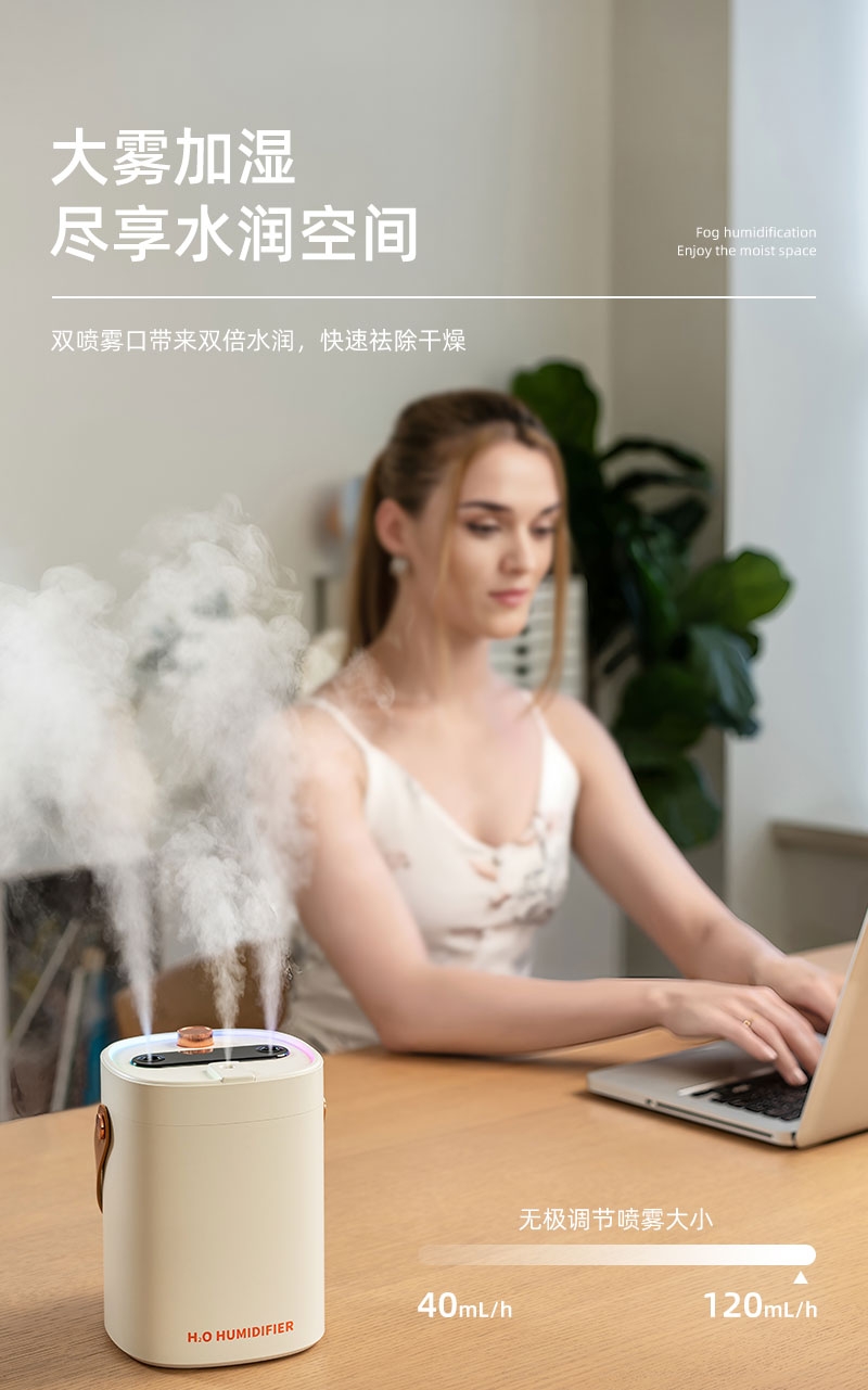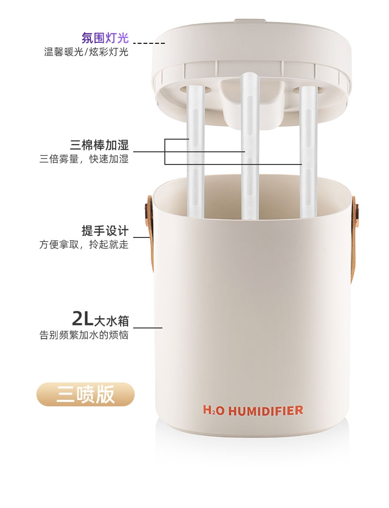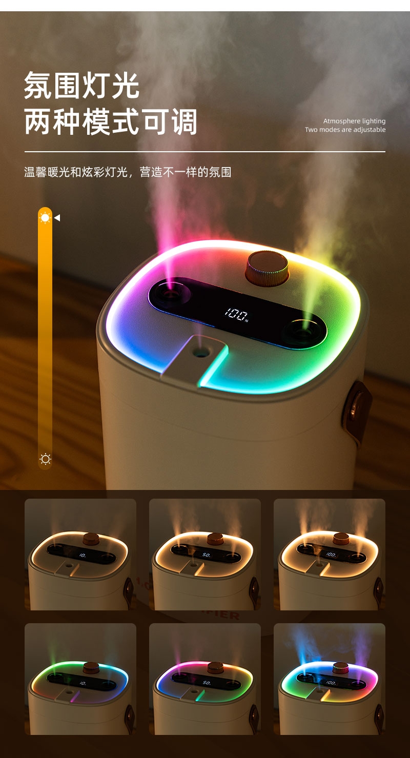 简约高档外观、三喷雾口;七彩小夜灯可调、2000ML大容量;喷香款有独立口可使用精油或者驱蚊液等