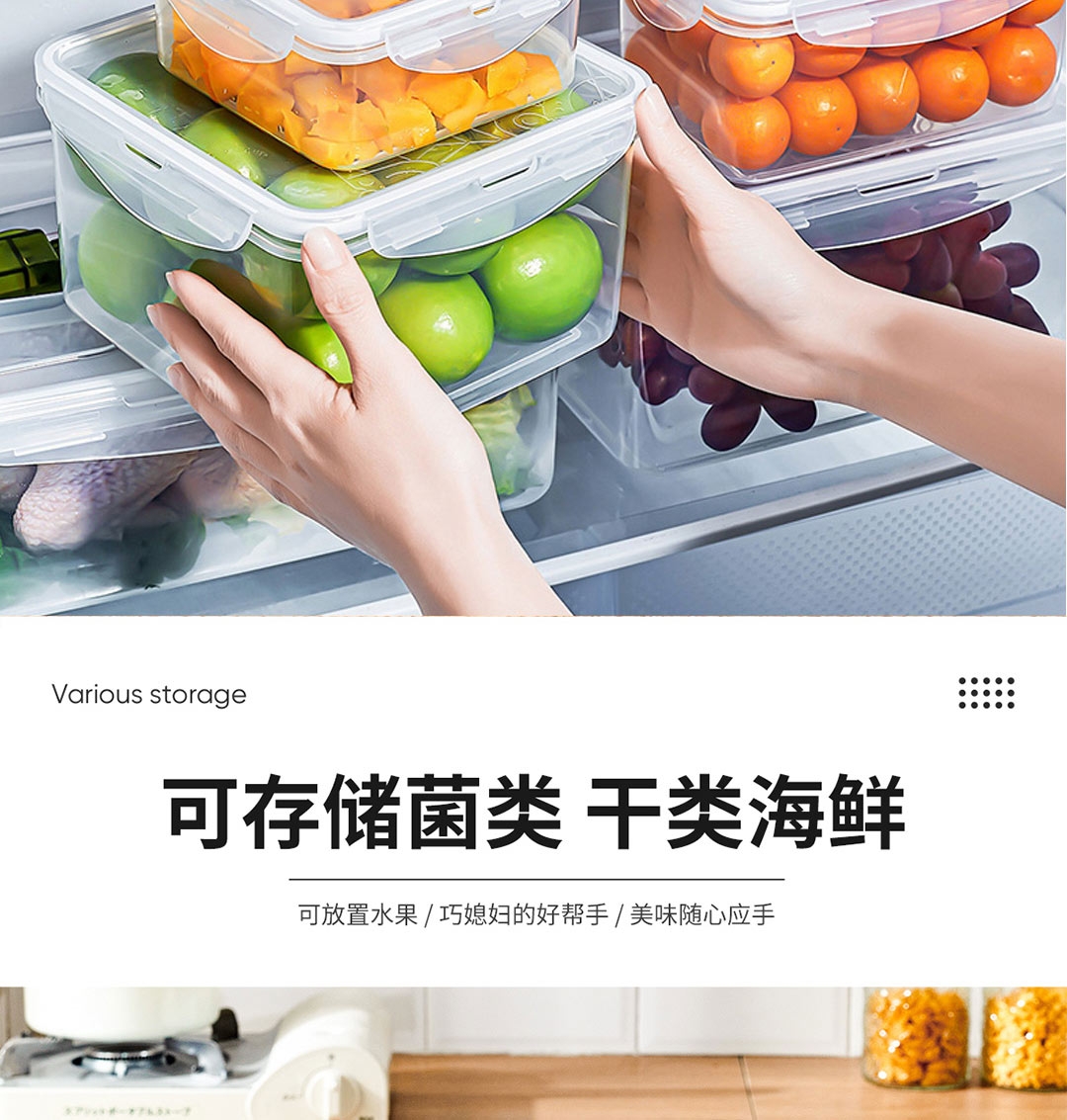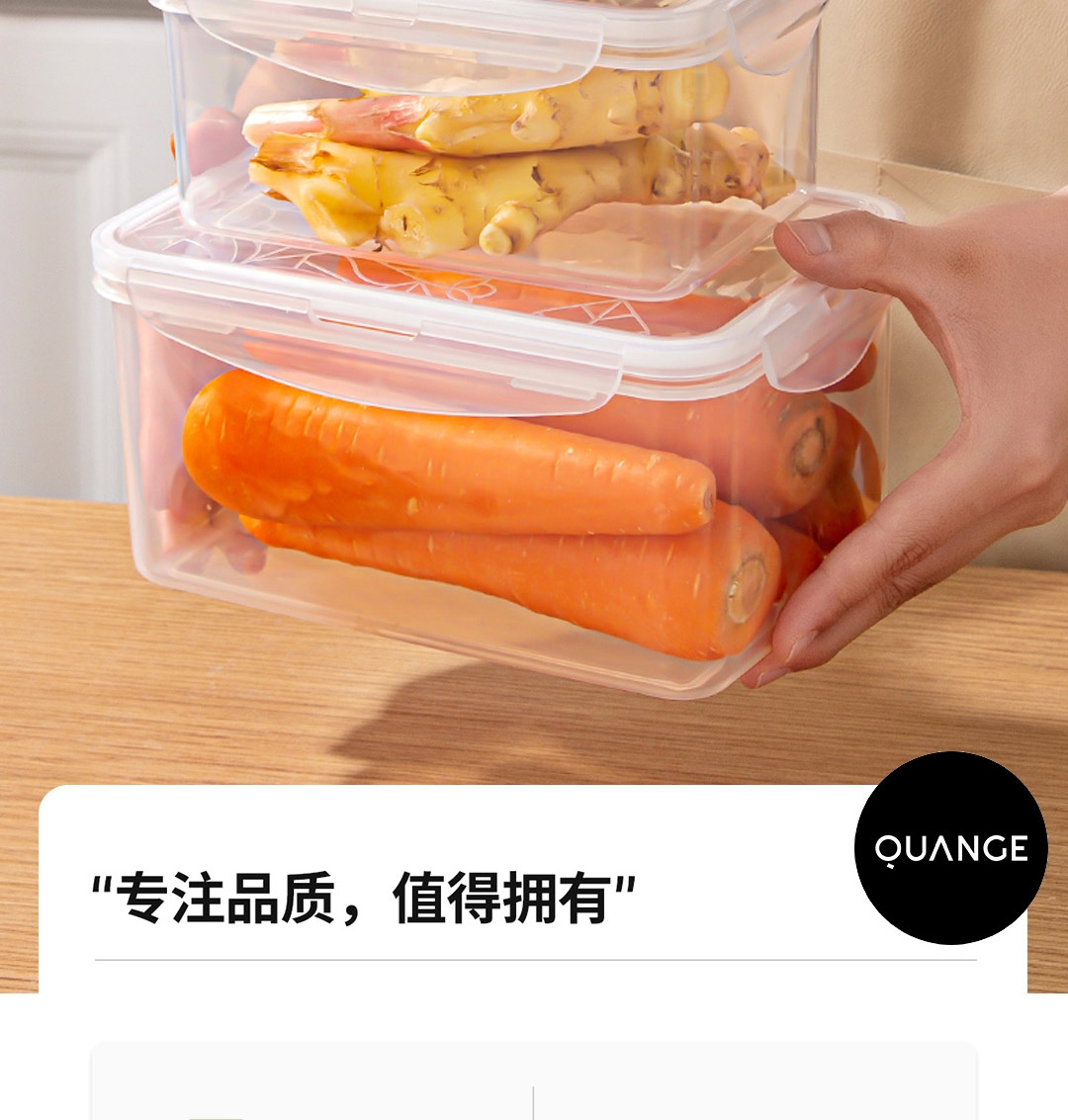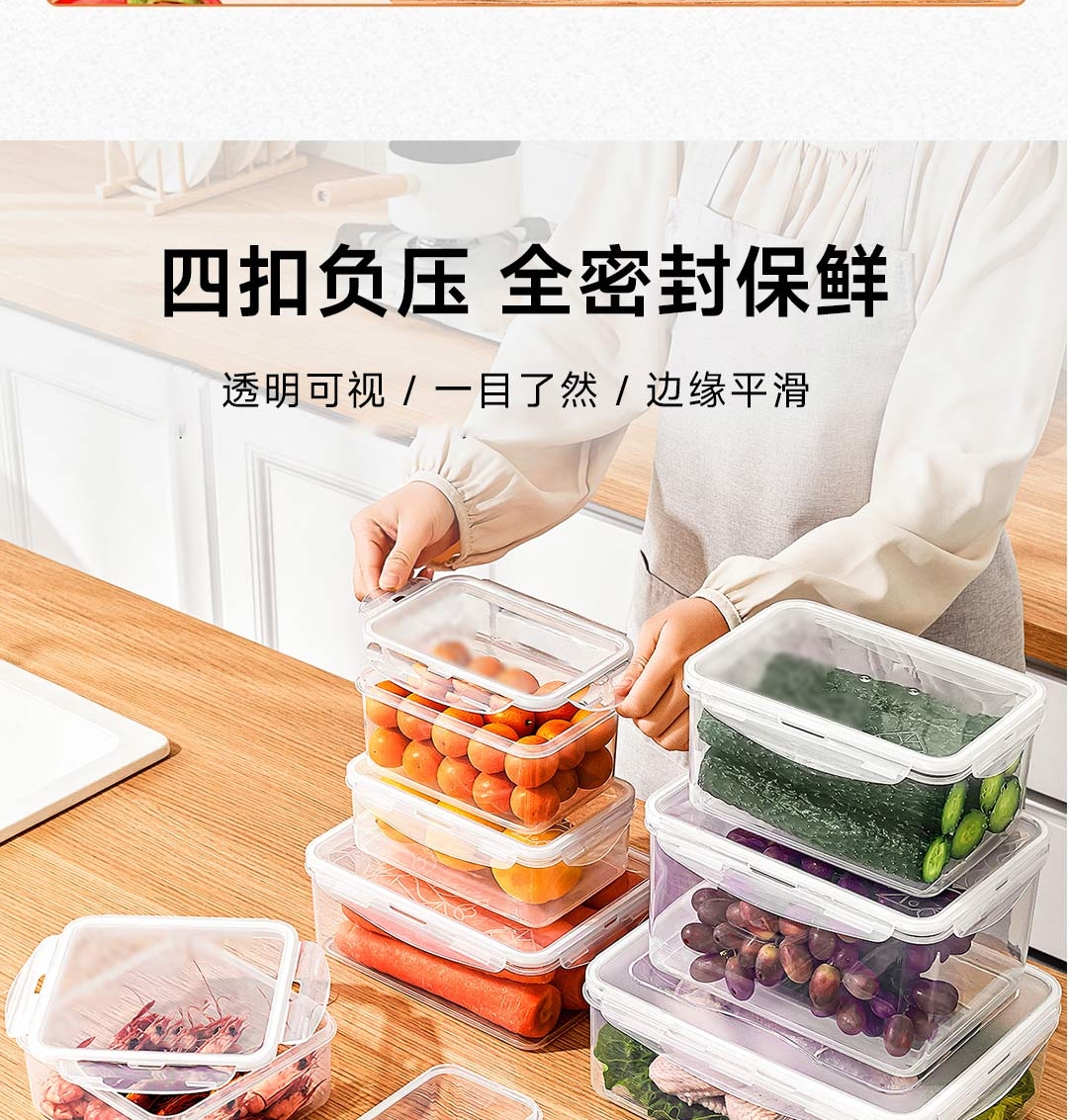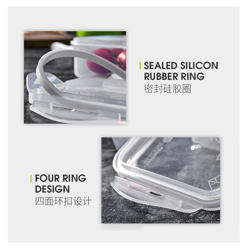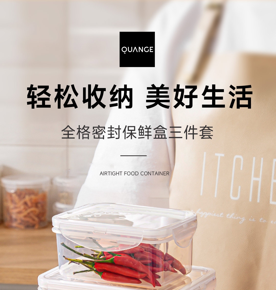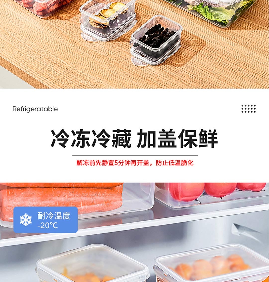 三个规格,分类收纳,锁住新鲜;四面锁扣,全密封不渗漏;耐冷耐热-20~120°C,适用冰箱、微波炉加热