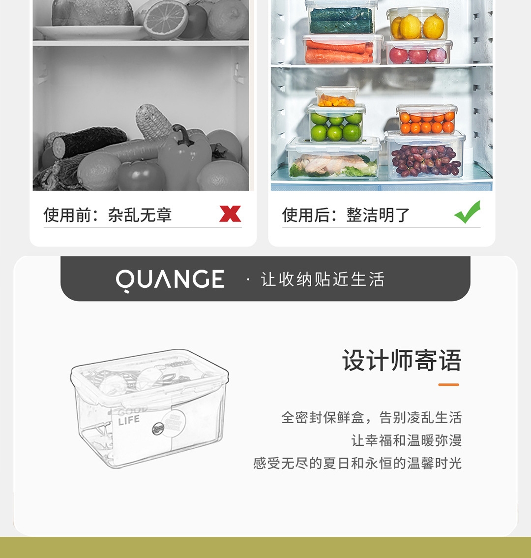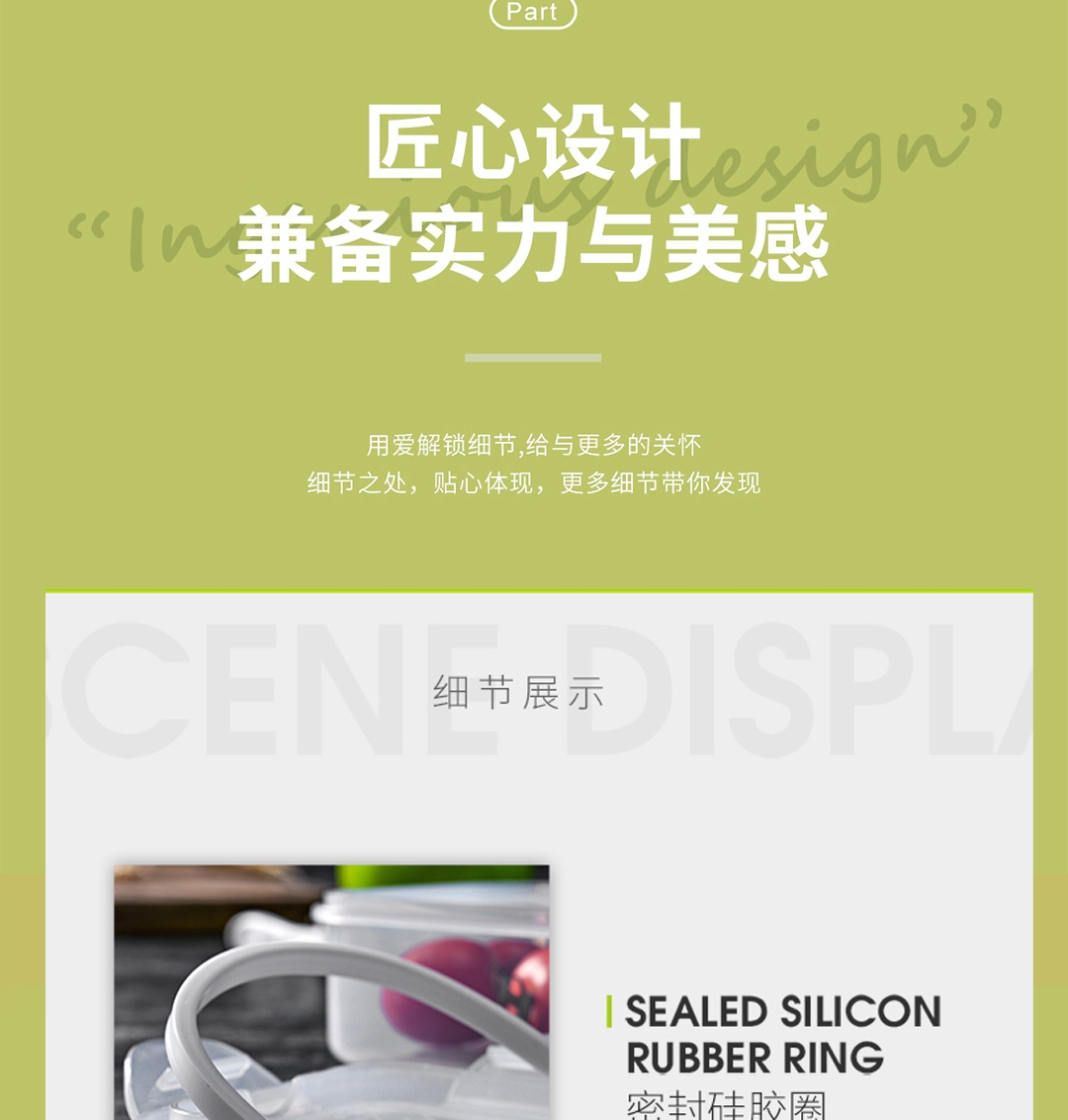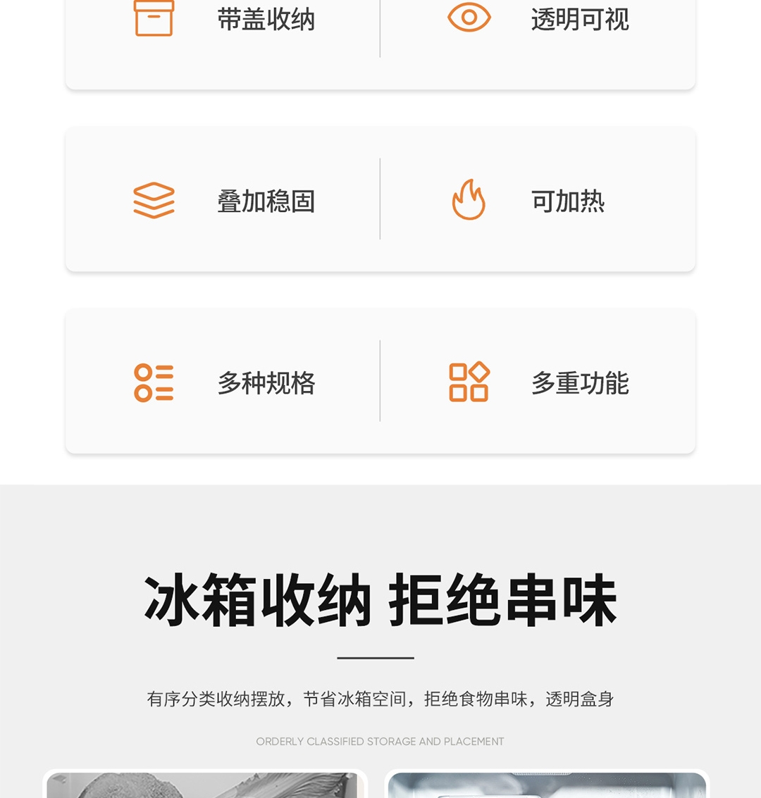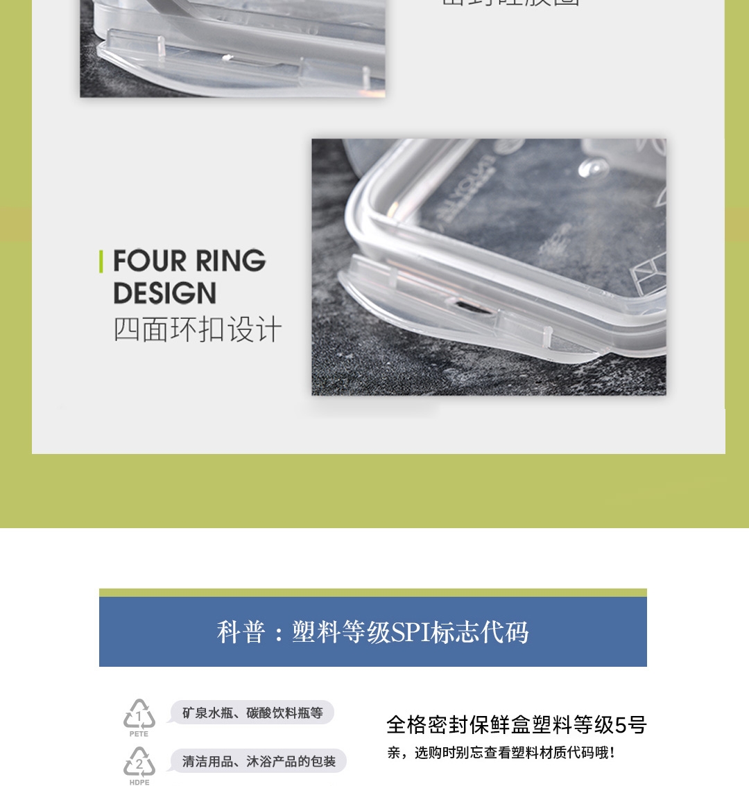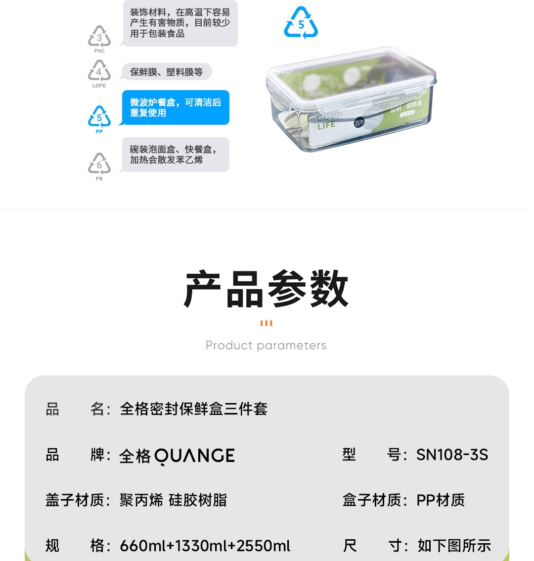 三个规格,分类收纳,锁住新鲜;四面锁扣,全密封不渗漏;耐冷耐热-20~120°C,适用冰箱、微波炉加热