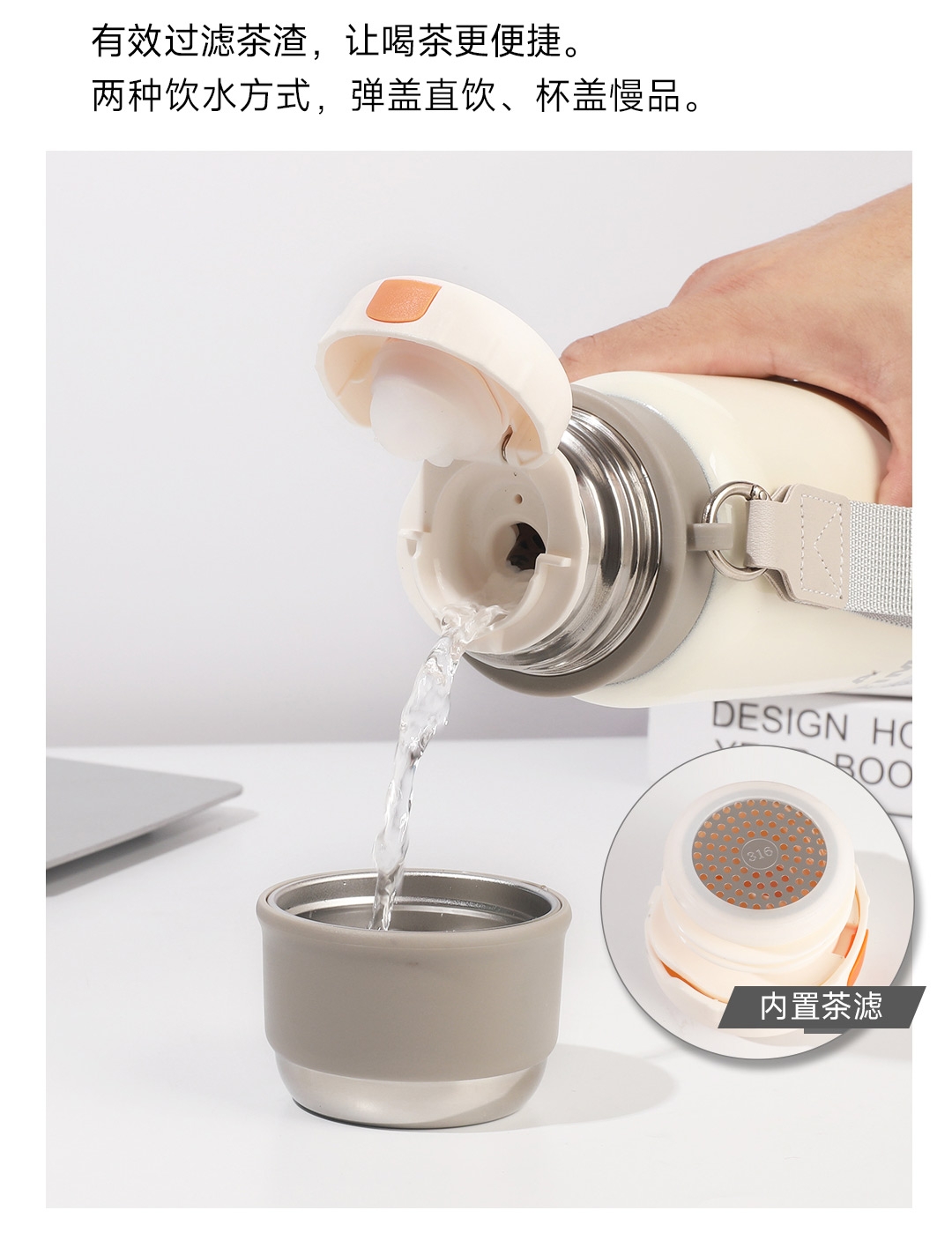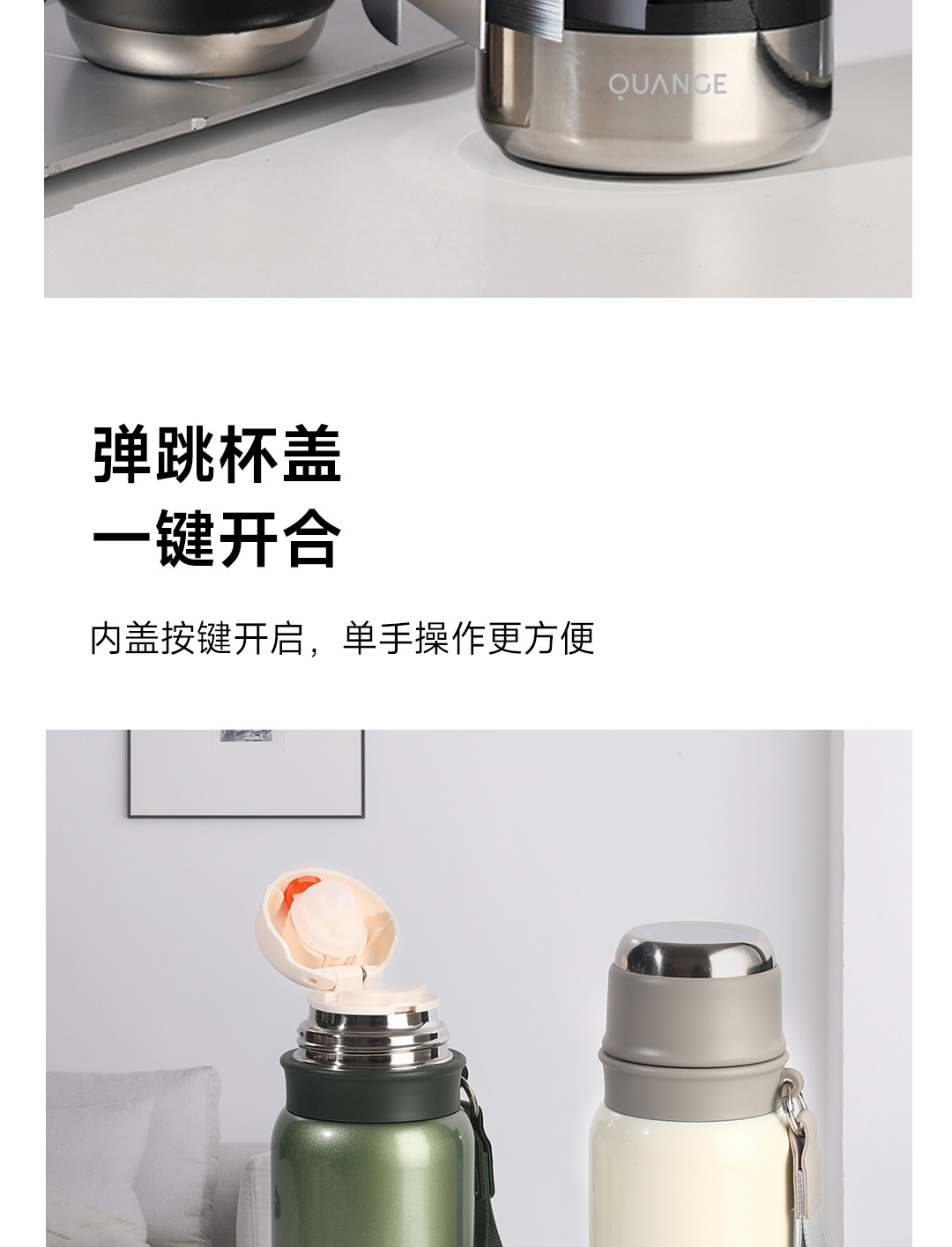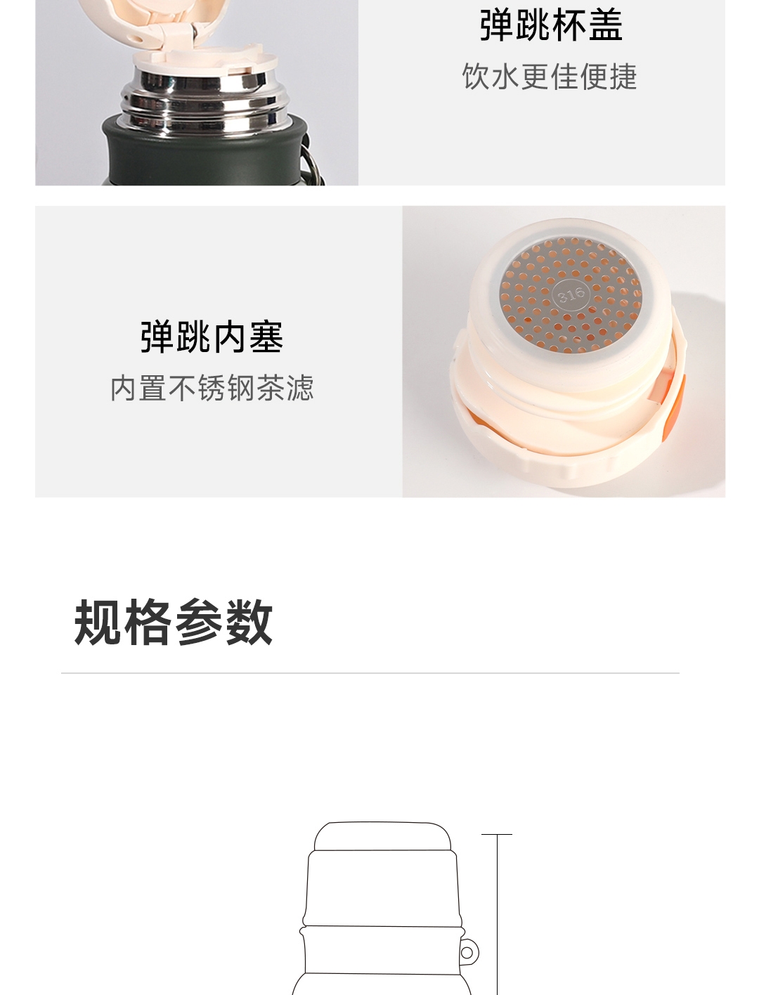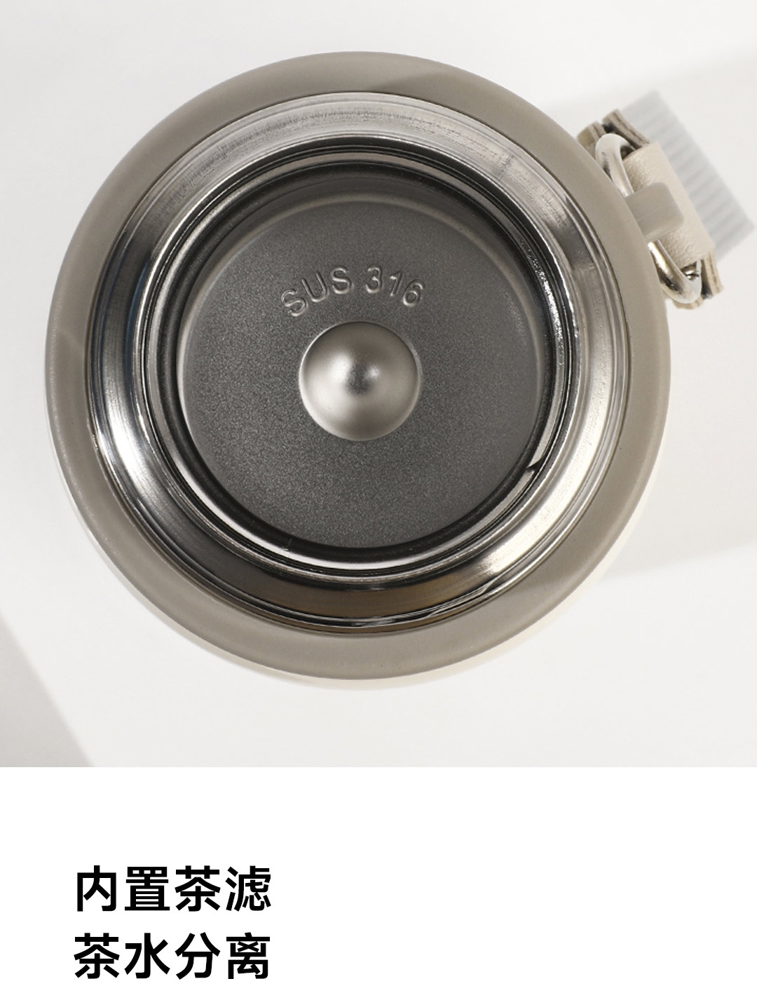 内置茶隔,茶水分离,可焖可泡;高抛光304双层外杯盖,一盖两用;内盖按键开启,单手操作更方便