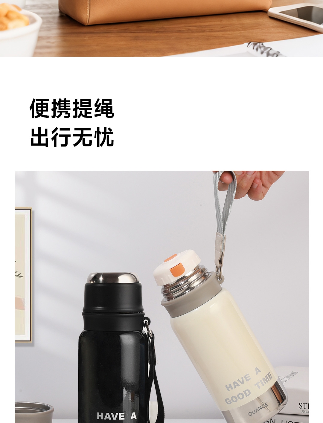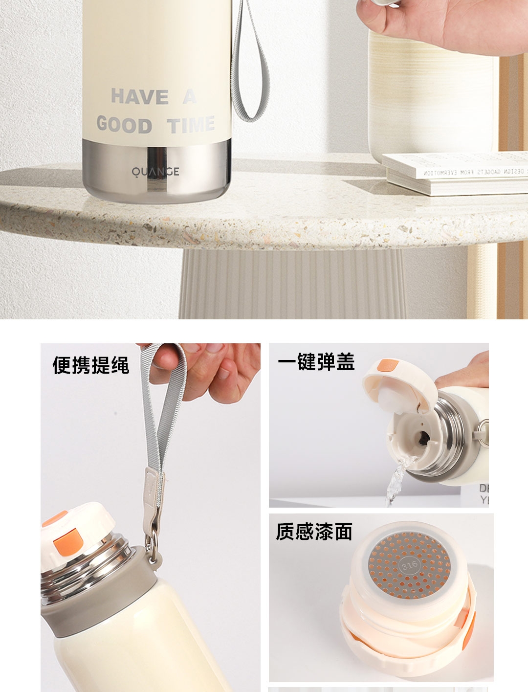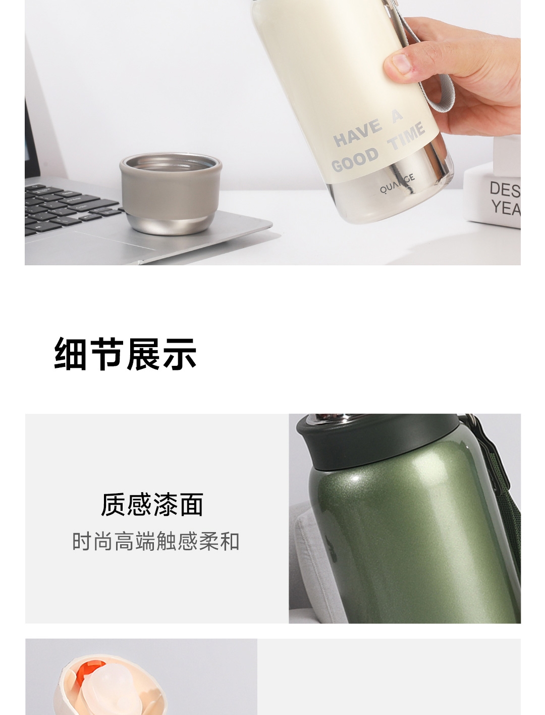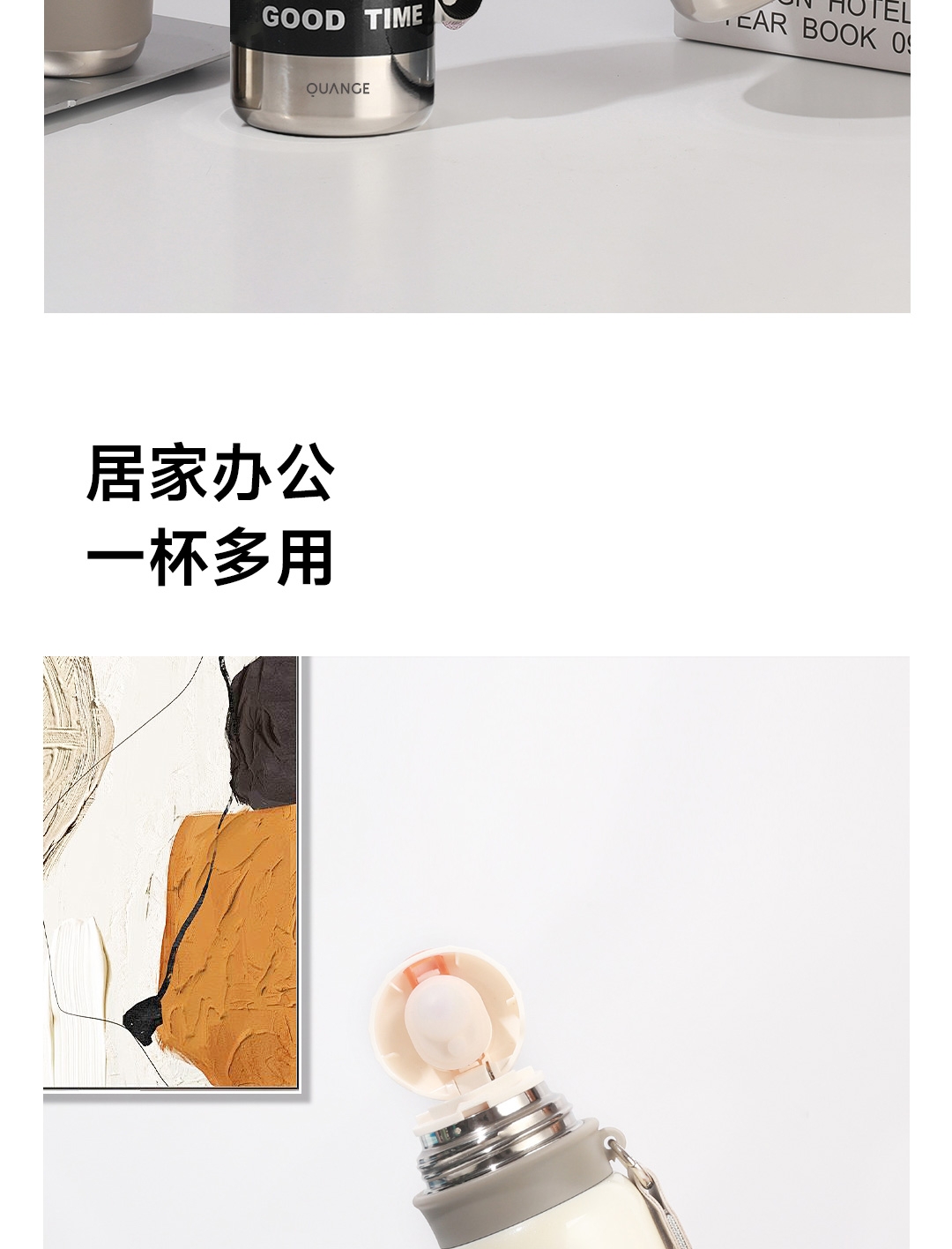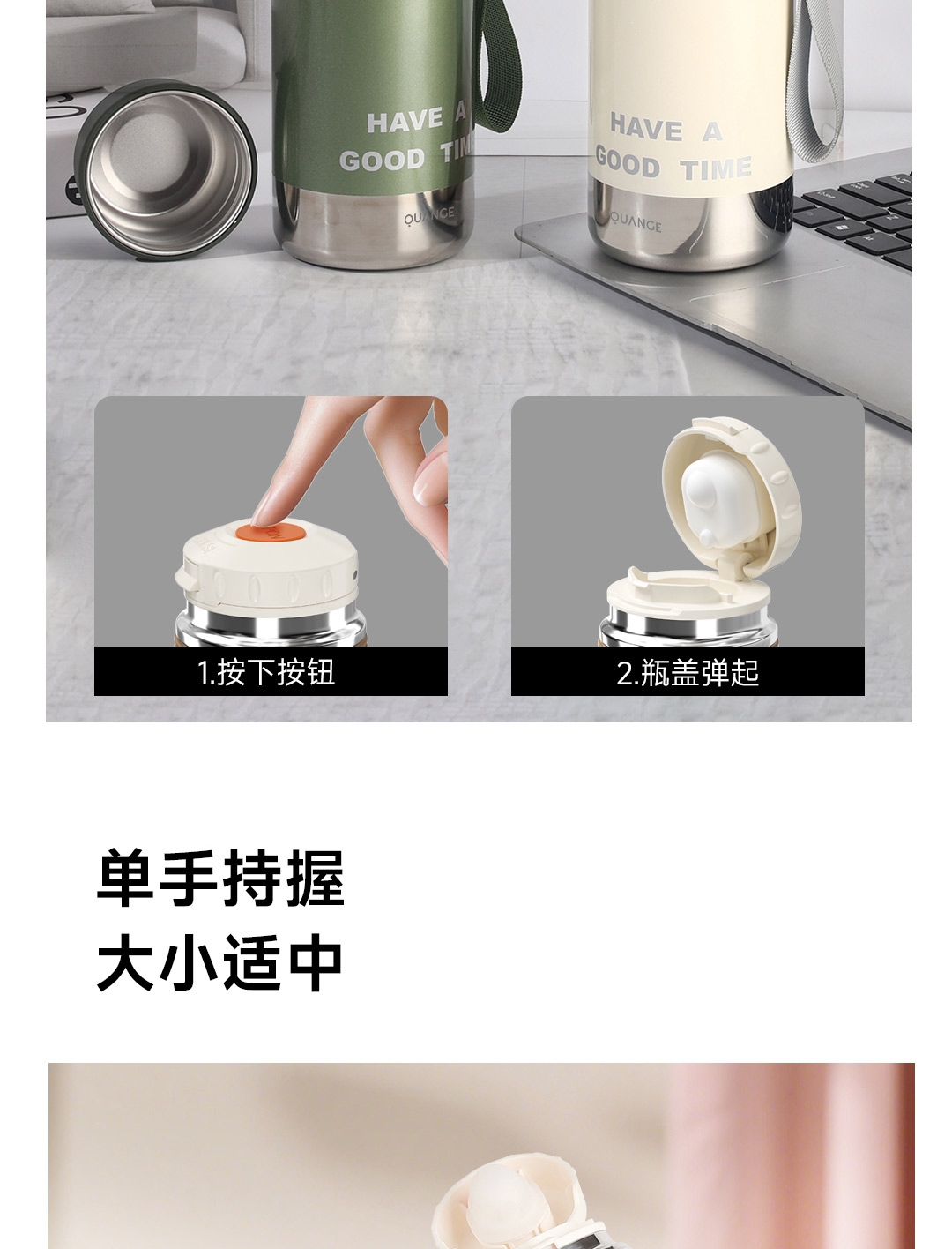 内置茶隔,茶水分离,可焖可泡;高抛光304双层外杯盖,一盖两用;内盖按键开启,单手操作更方便