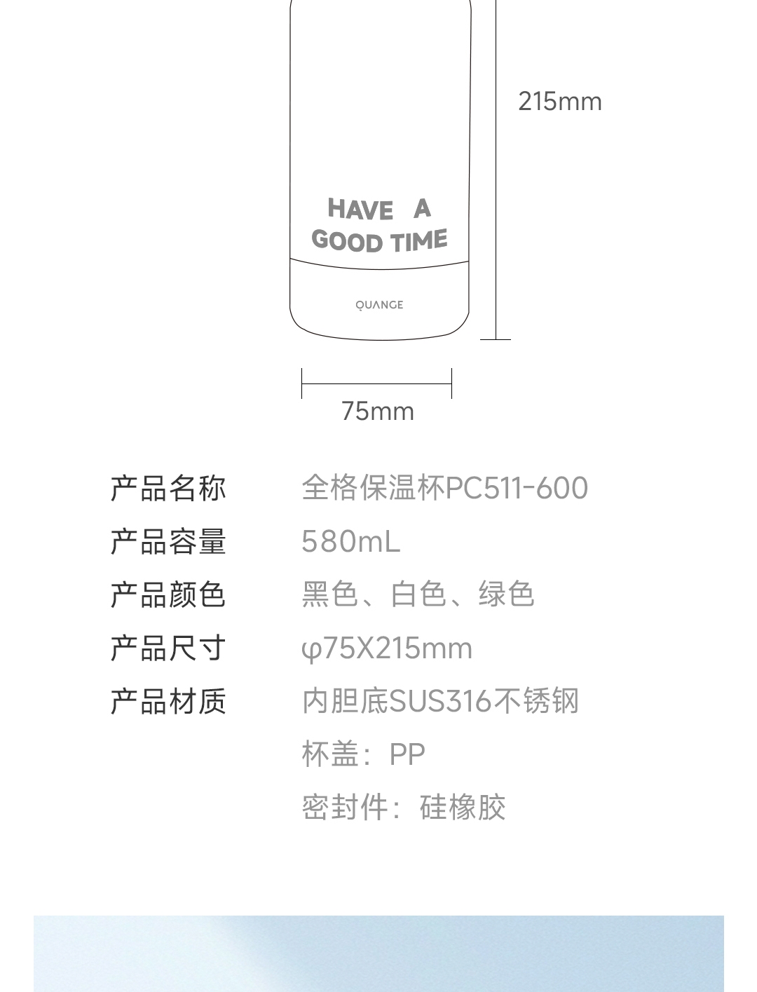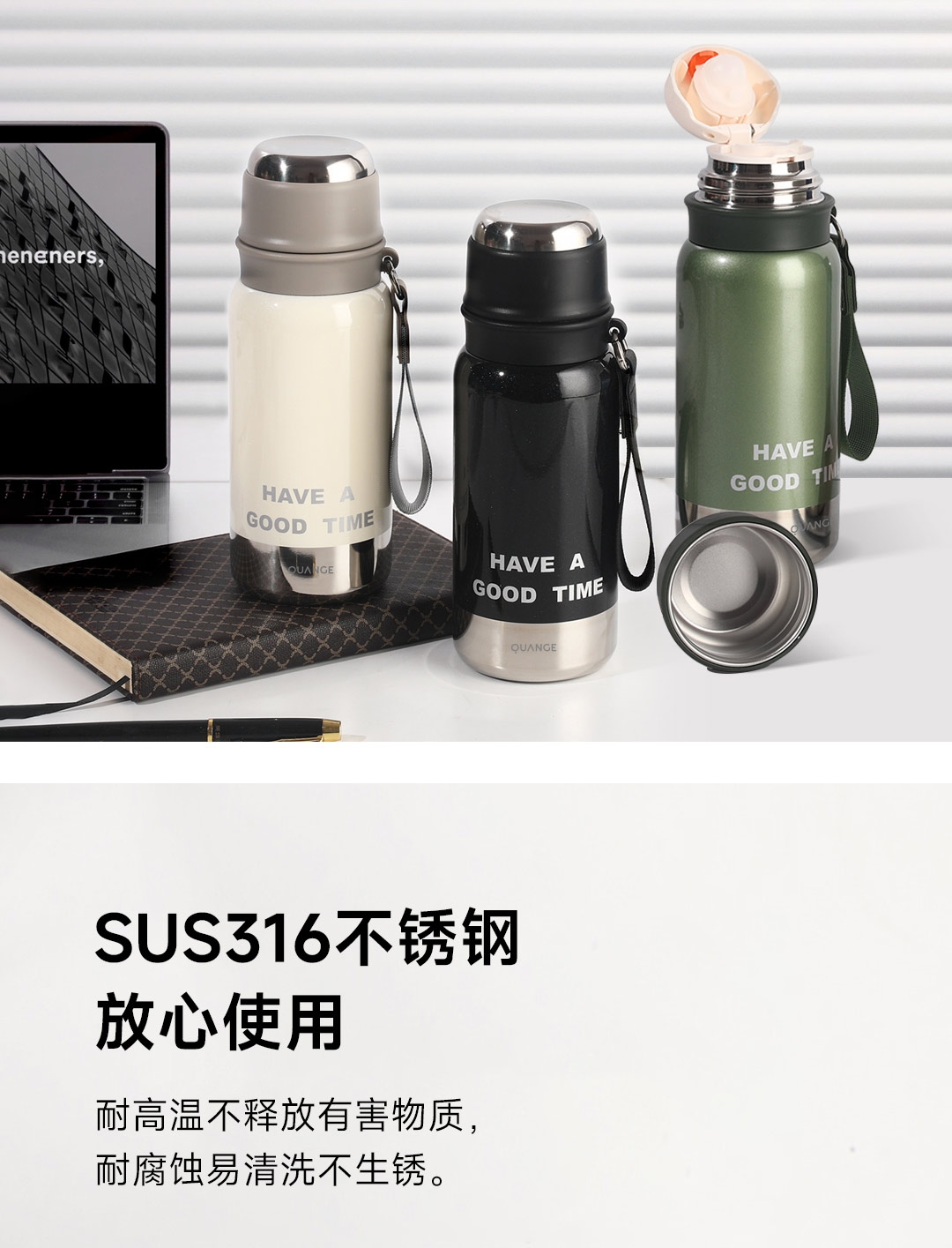 材质:内胆底:SUS316,外杯盖/茶滤:SUS304,内杯盖:PP,密封件:硅橡胶