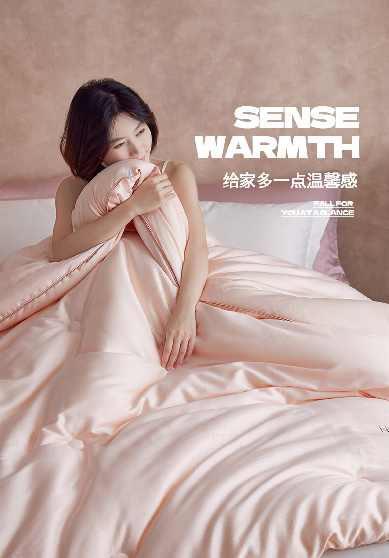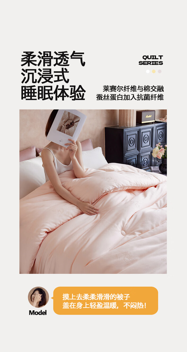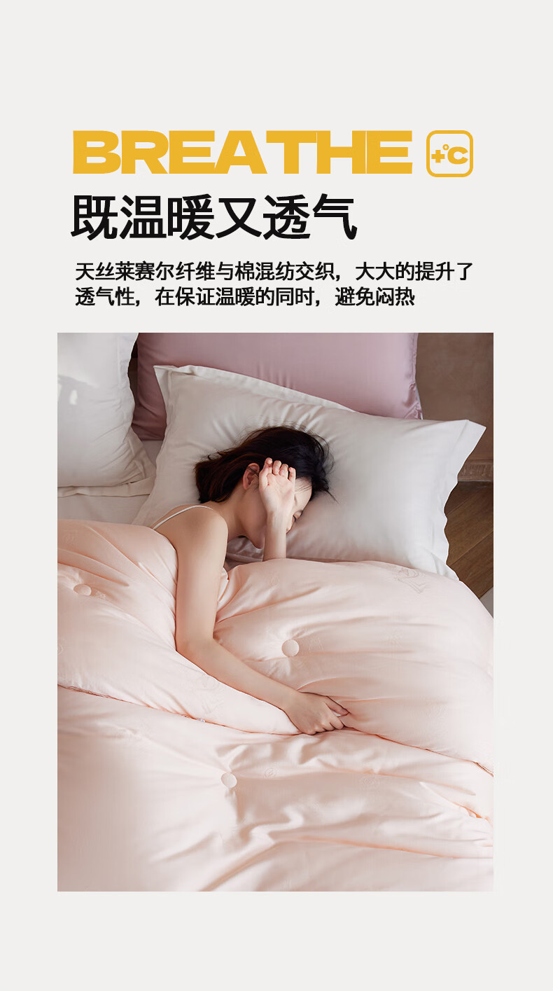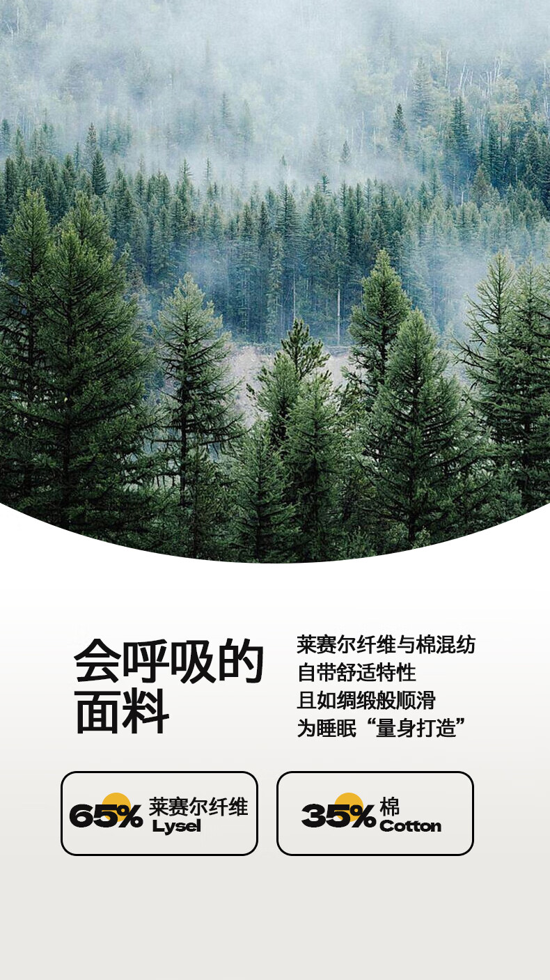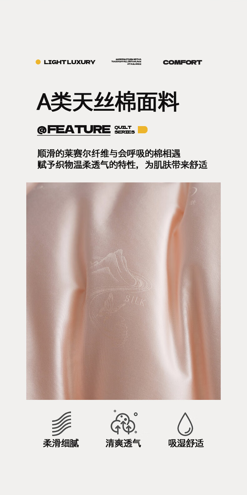 莱赛尔纤维与会呼吸的棉相遇赋予织物温柔透气的特性;莱赛尔纤维与棉混纺自带舒适特性且如绸缎般顺滑;20%蚕丝蛋白填充,蚕丝蛋白纤维被称为“纤维皇后”;含有多孔结构,有“天然调温”的功能,冬暖夏凉