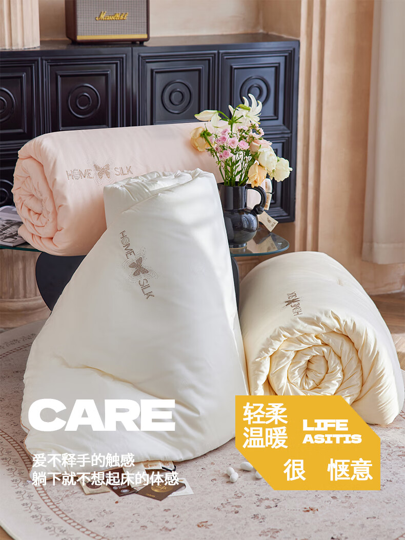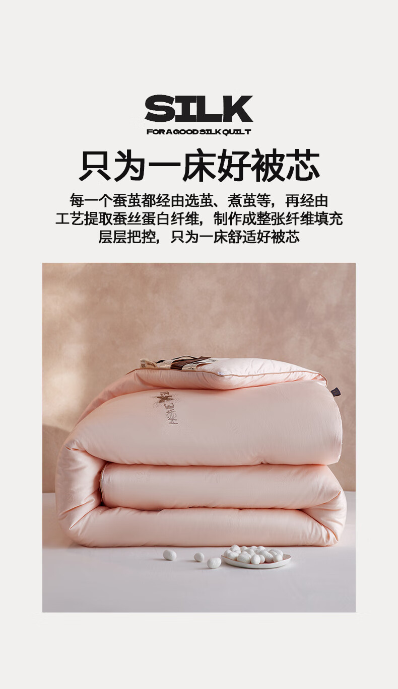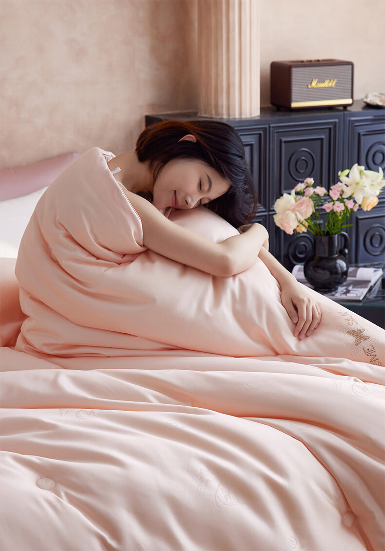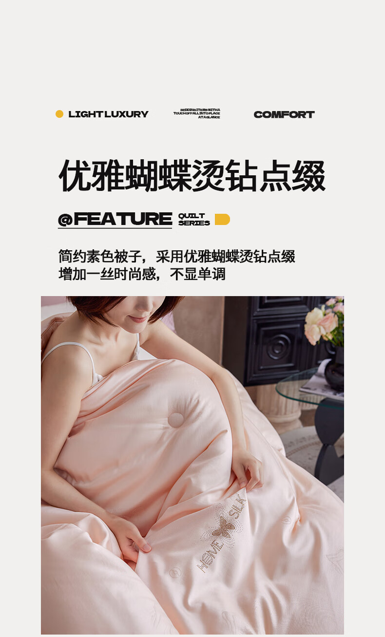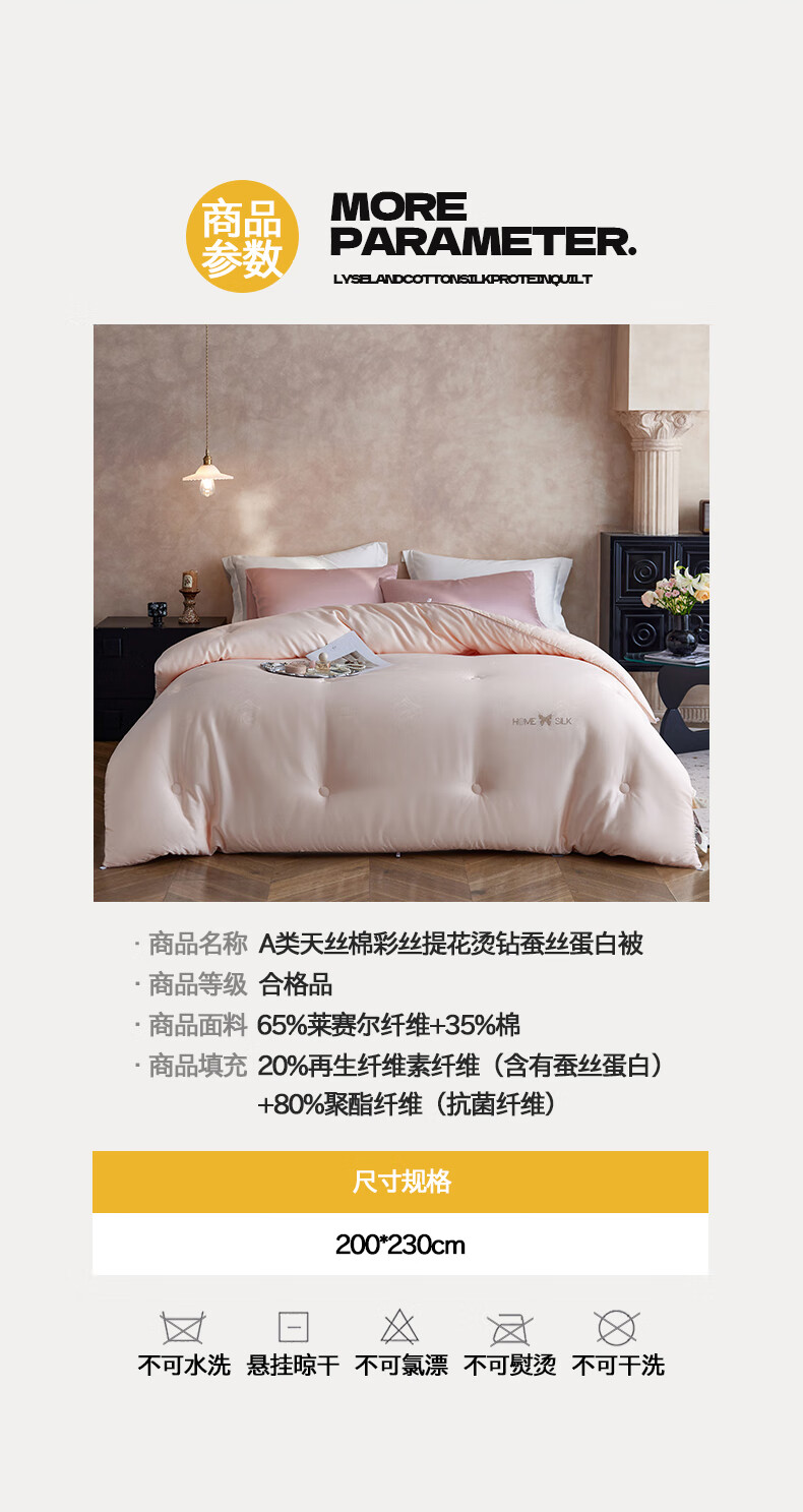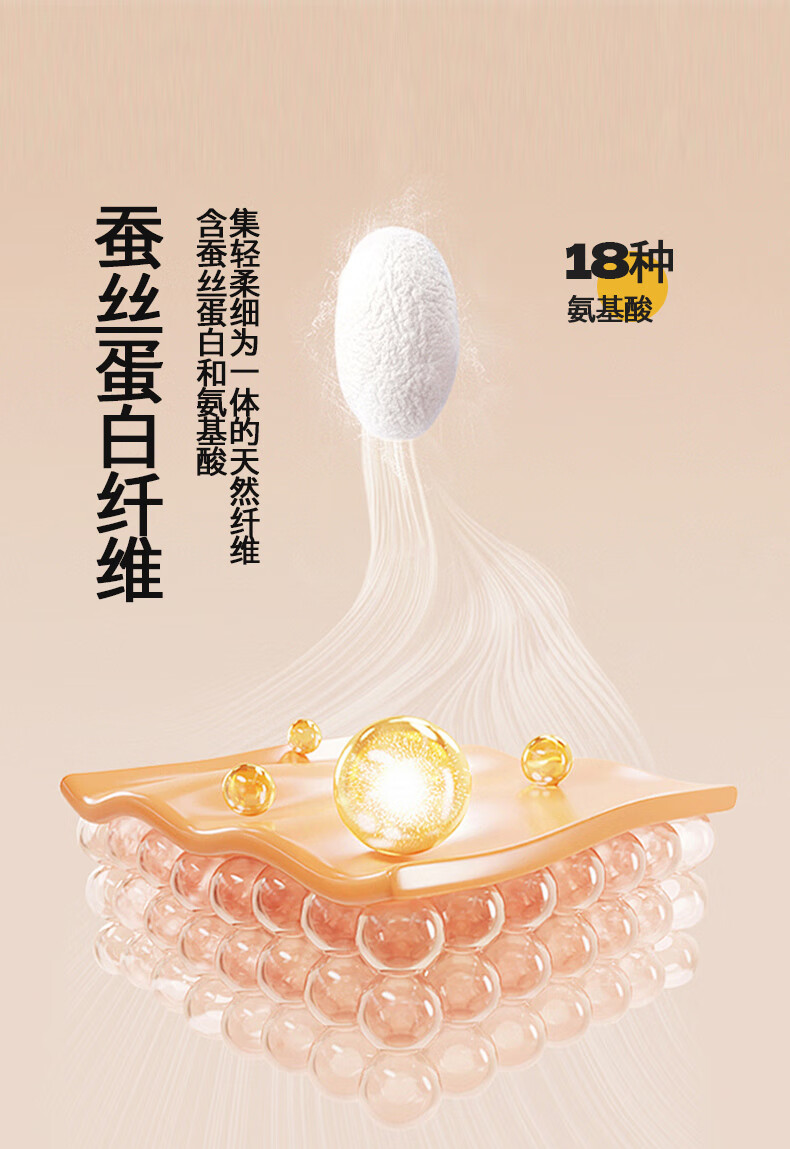 莱赛尔纤维与会呼吸的棉相遇赋予织物温柔透气的特性;莱赛尔纤维与棉混纺自带舒适特性且如绸缎般顺滑;20%蚕丝蛋白填充,蚕丝蛋白纤维被称为“纤维皇后”;含有多孔结构,有“天然调温”的功能,冬暖夏凉