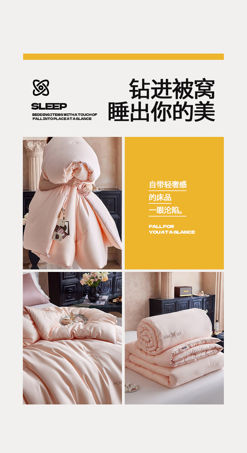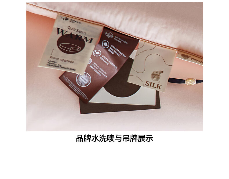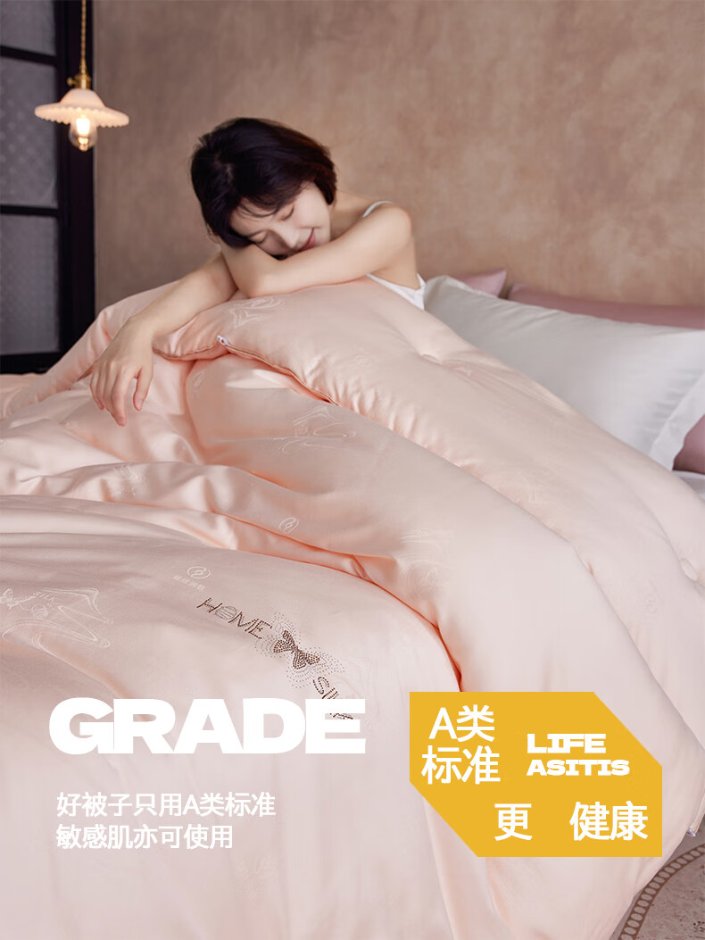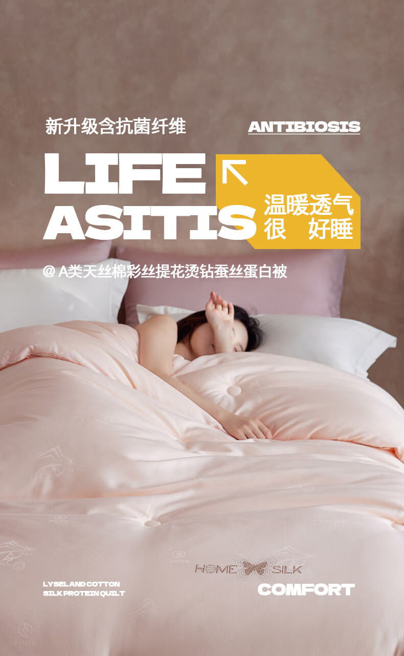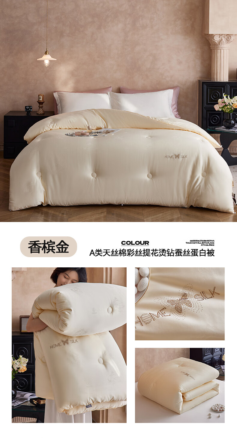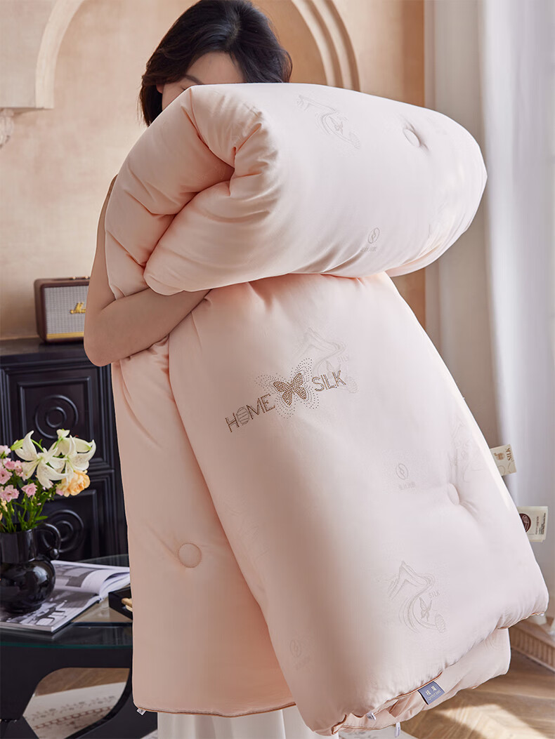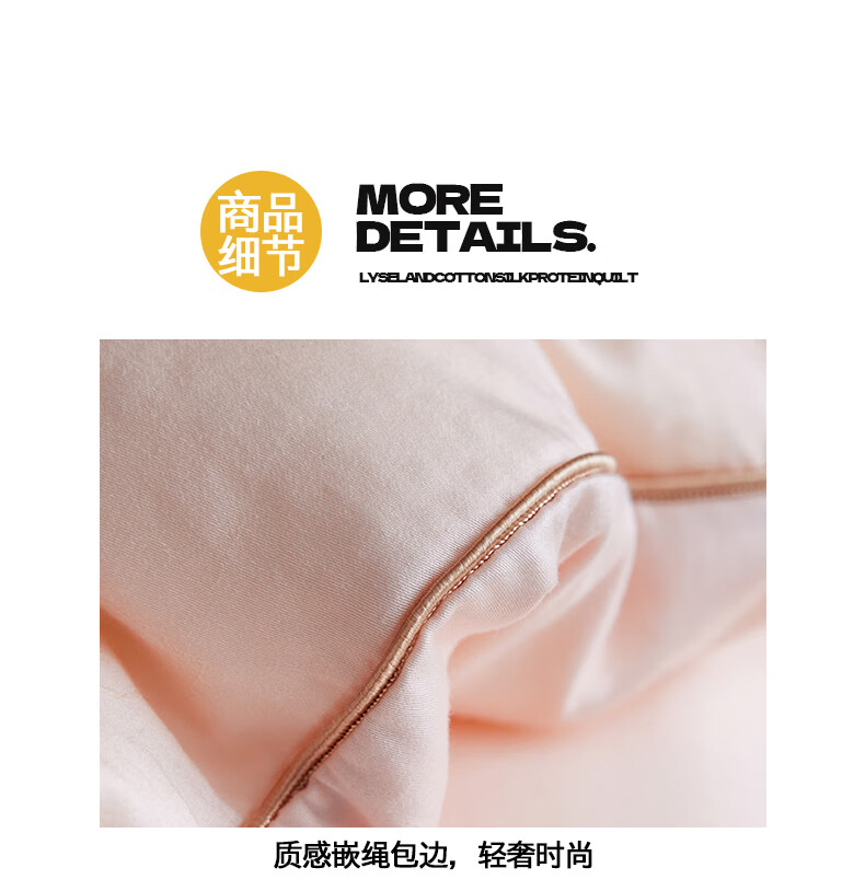 莱赛尔纤维与会呼吸的棉相遇赋予织物温柔透气的特性;莱赛尔纤维与棉混纺自带舒适特性且如绸缎般顺滑;20%蚕丝蛋白填充,蚕丝蛋白纤维被称为“纤维皇后”;含有多孔结构,有“天然调温”的功能,冬暖夏凉